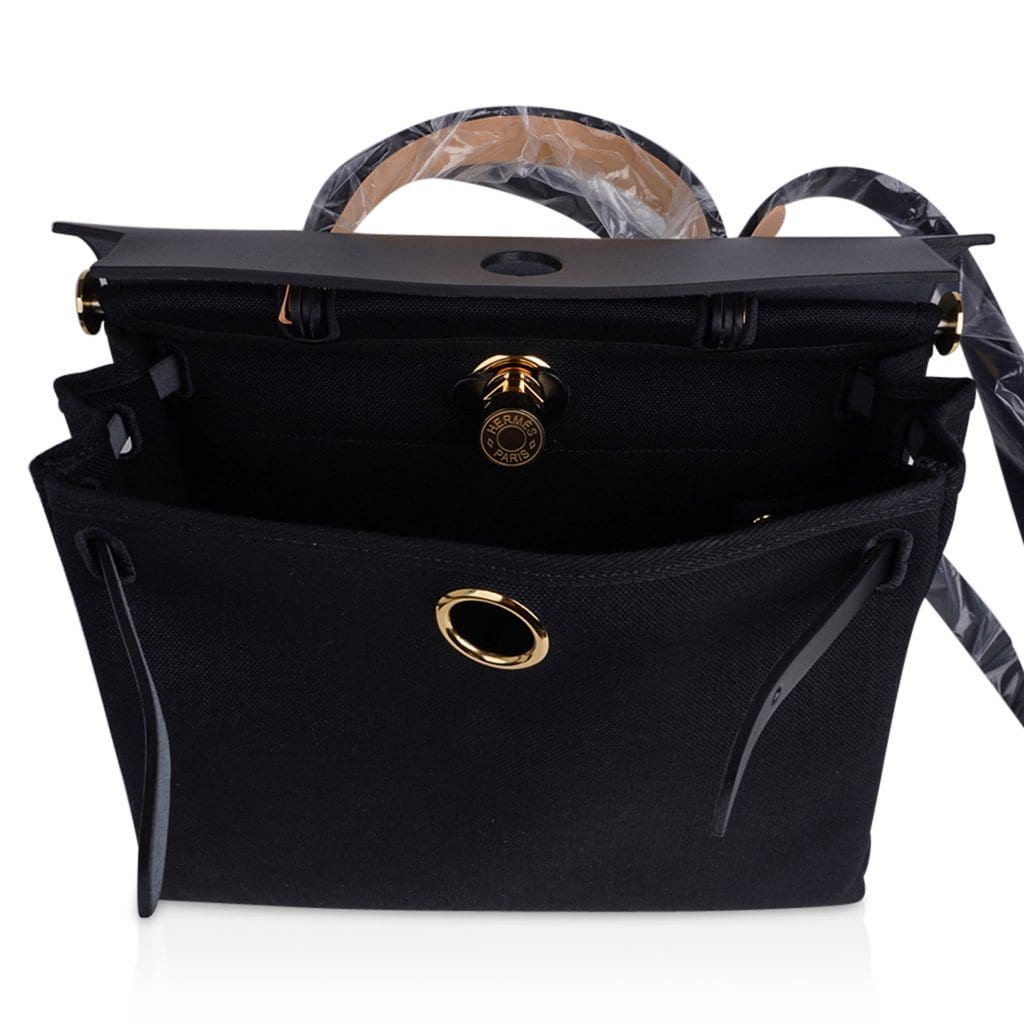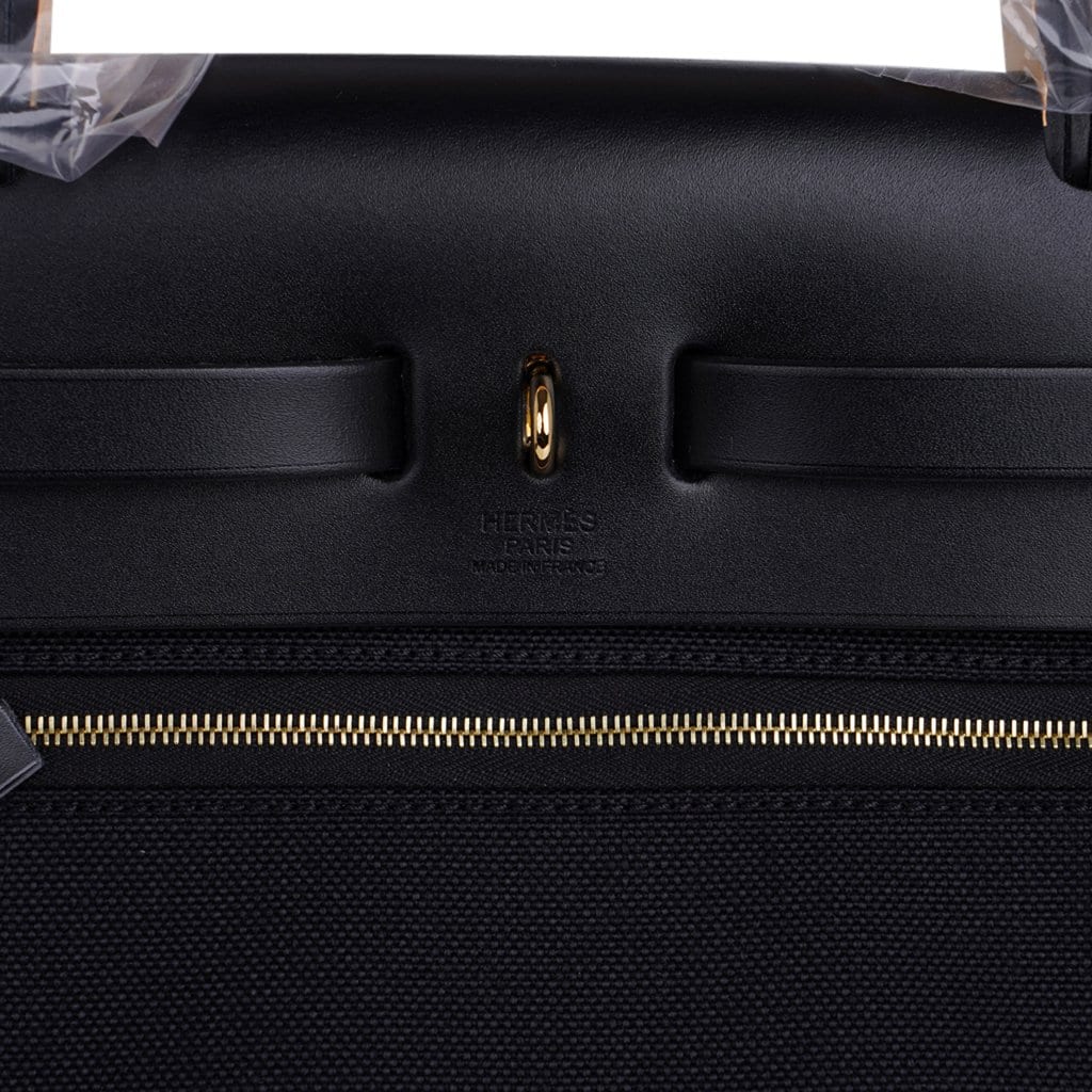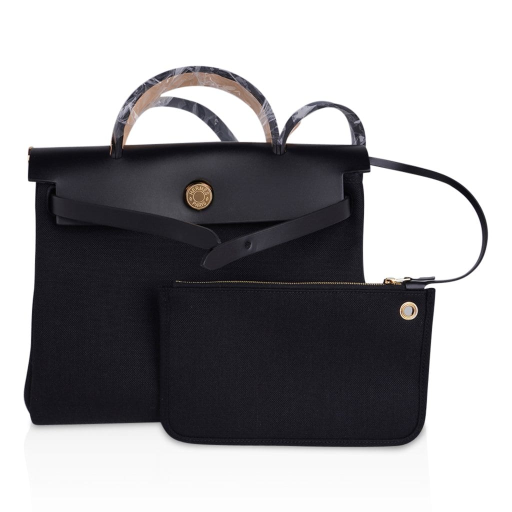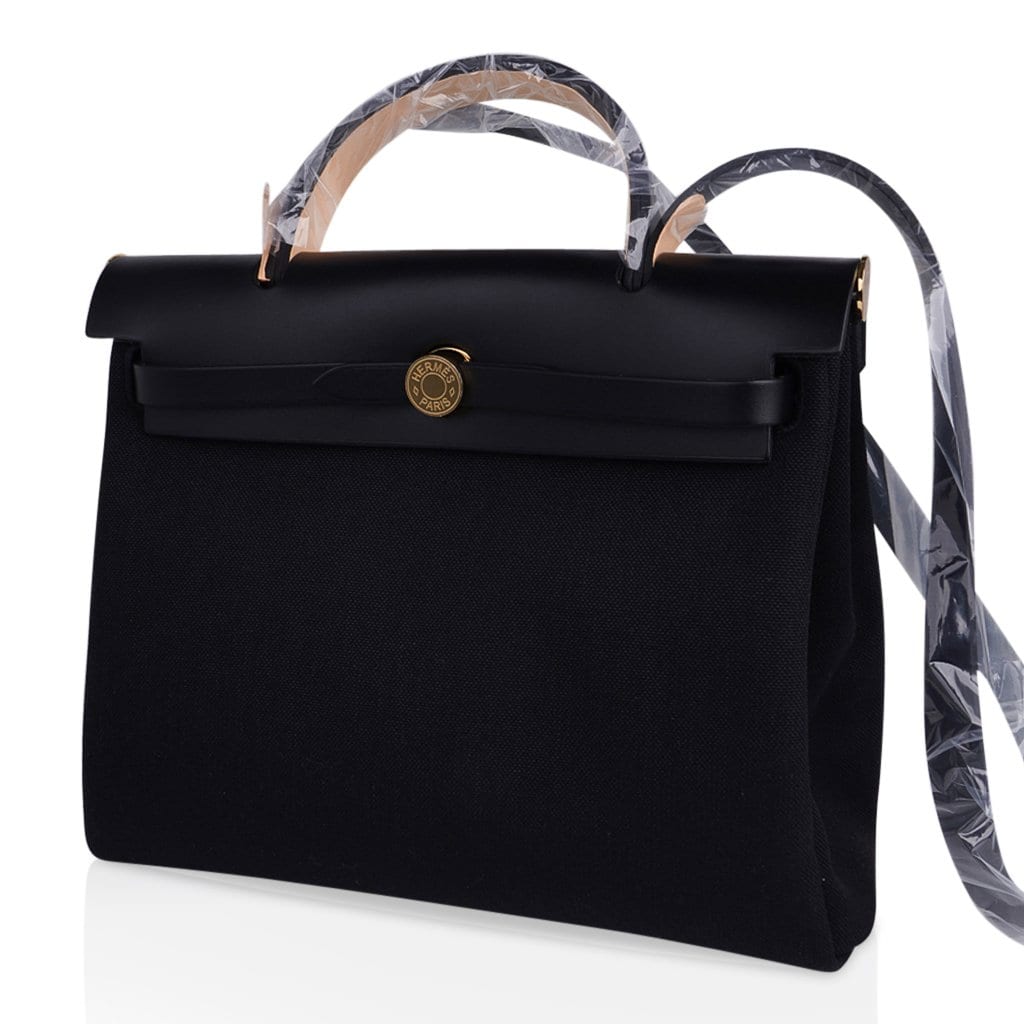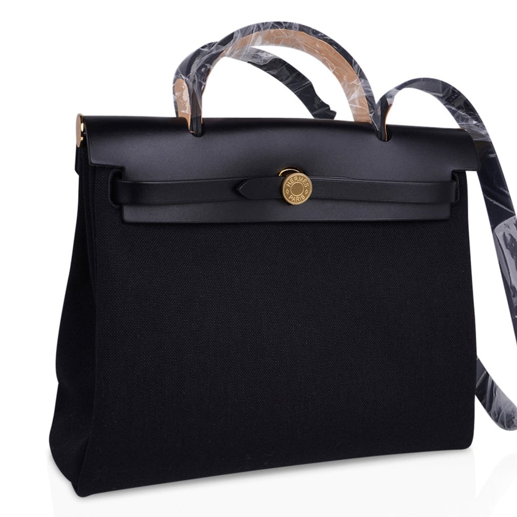Guaranteed authentic Hermes Herbag Zip 31 featured in Black on Black Officier canvas and Vache Hunter cowhide leather.
