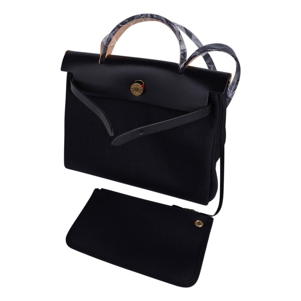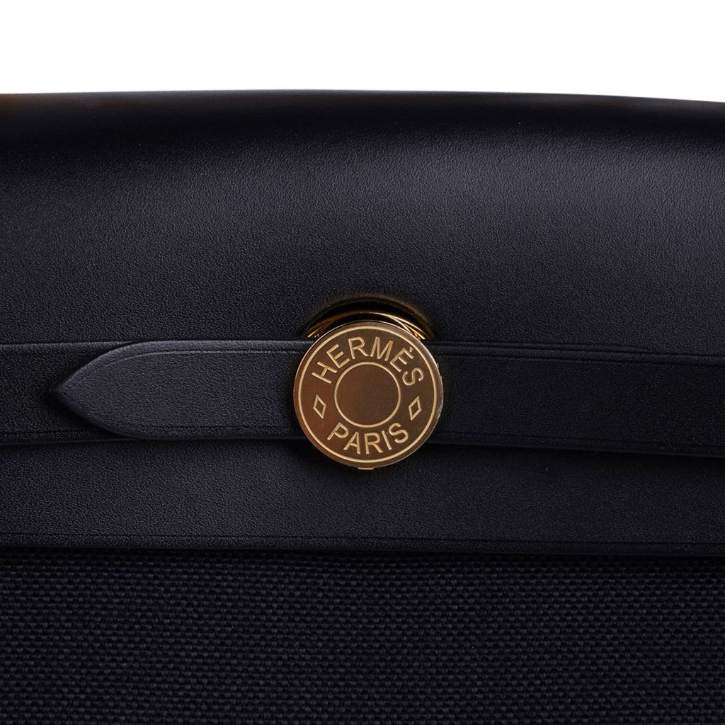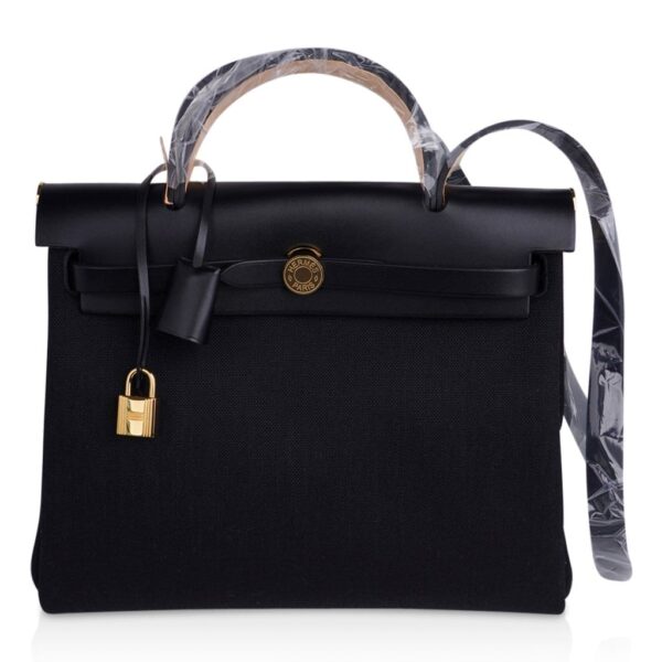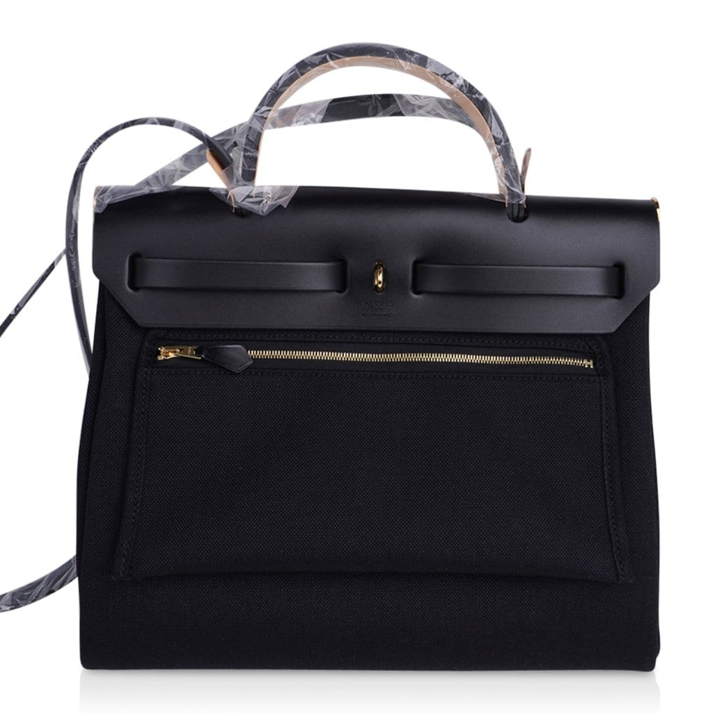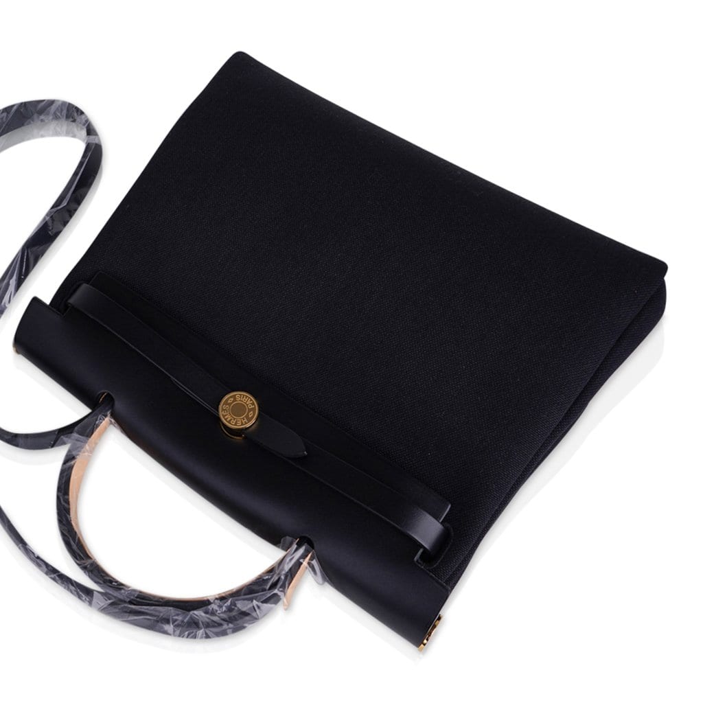 Guaranteed authentic Hermes Herbag Zip 31 featured in Black on Black Officier canvas and Vache Hunter cowhide leather.