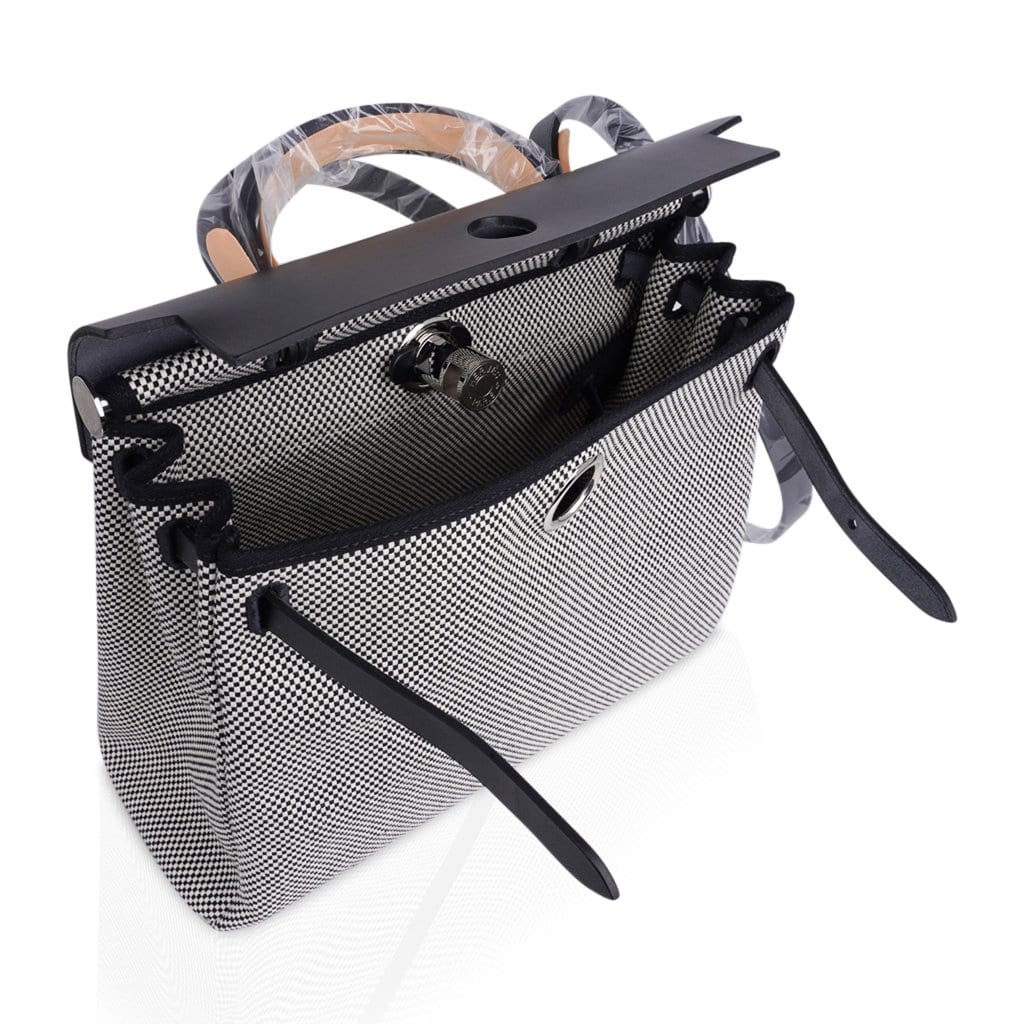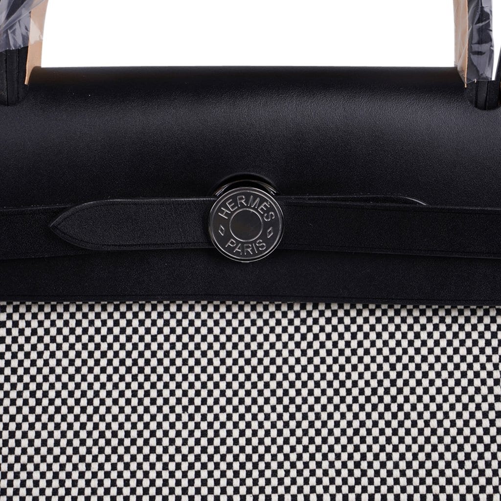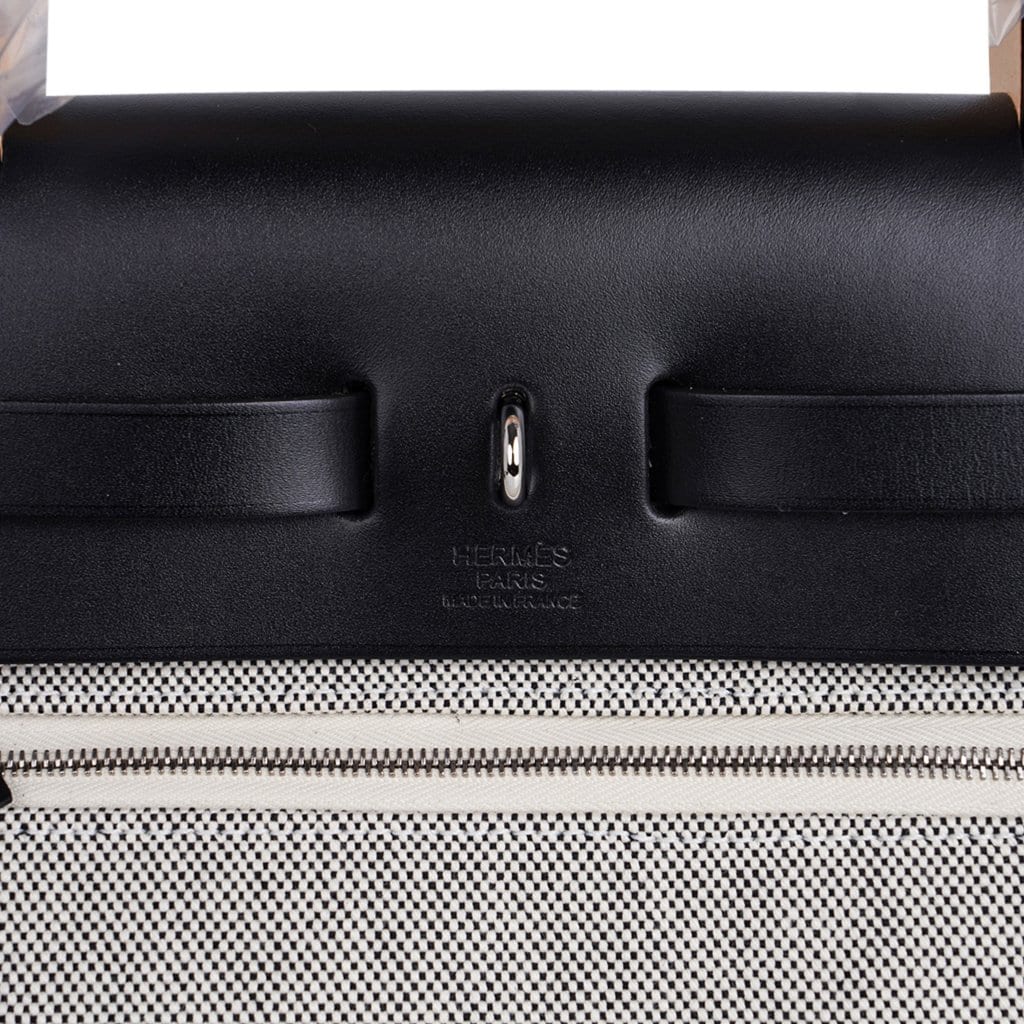 Guaranteed authentic Hermes Herbag Zip 31 featured in crisp black and white H Toile and Black Vache Hunter cowhide leather.