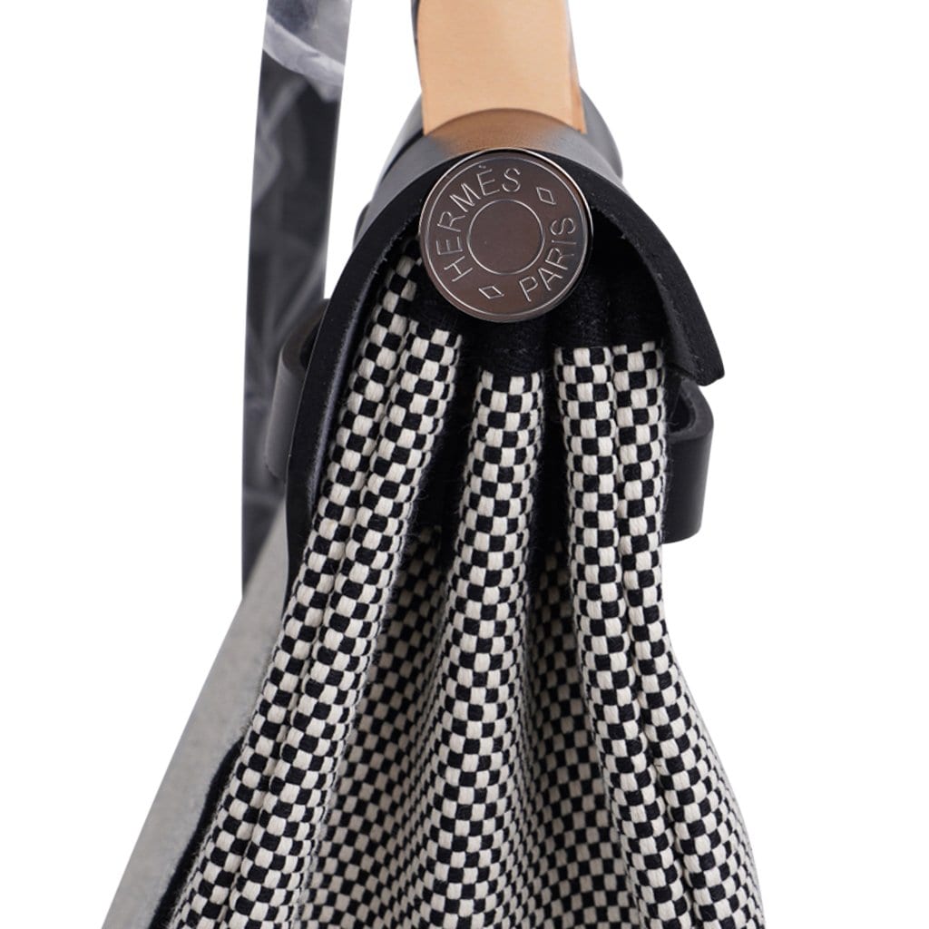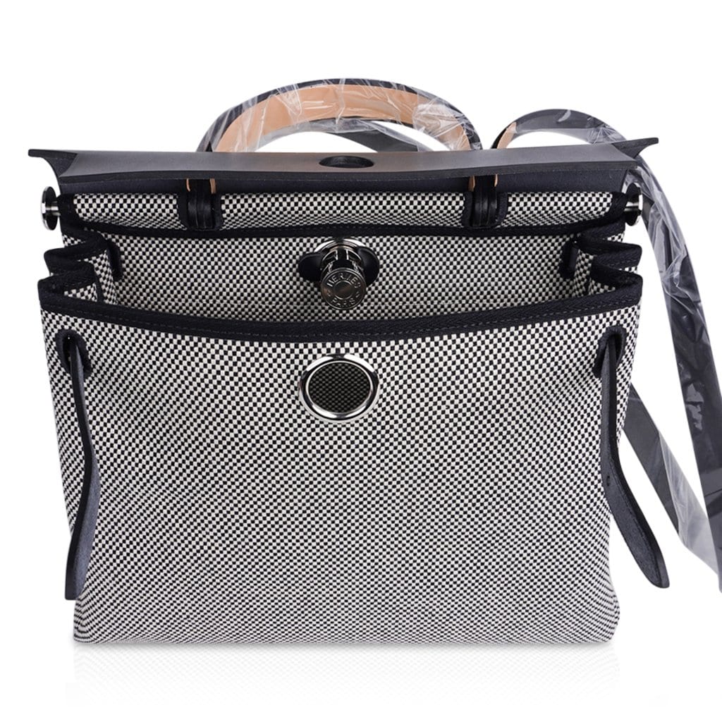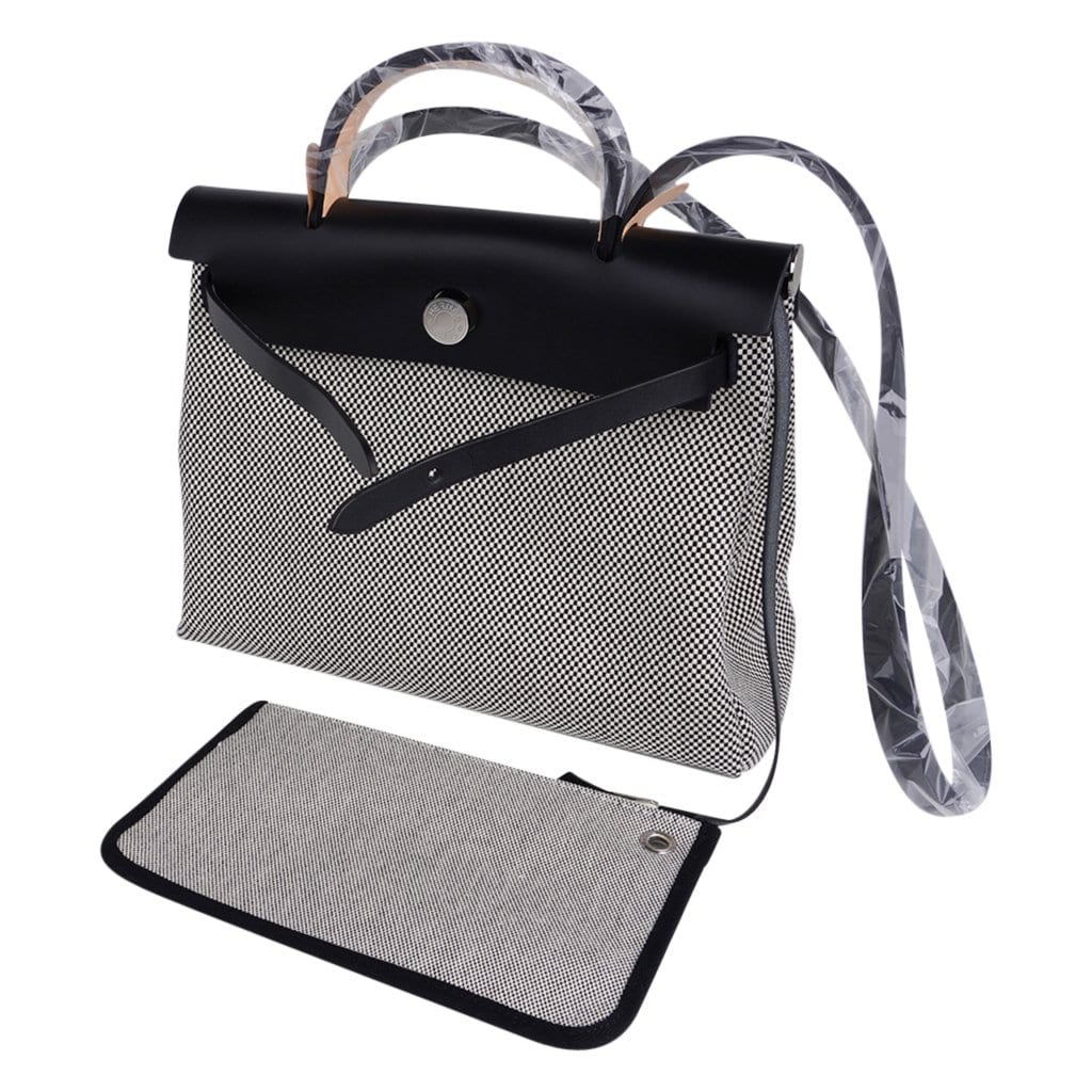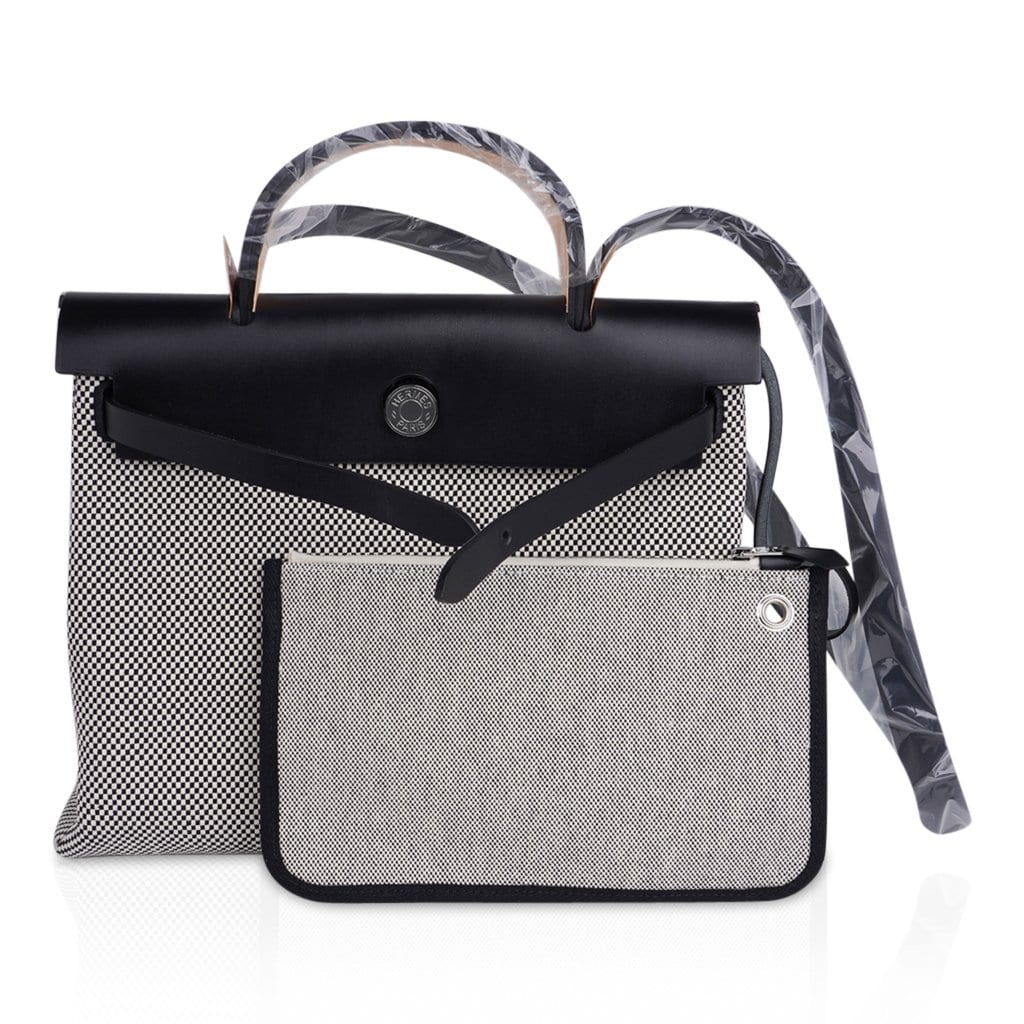 Guaranteed authentic Hermes Herbag Zip 31 featured in crisp black and white H Toile and Black Vache Hunter cowhide leather.