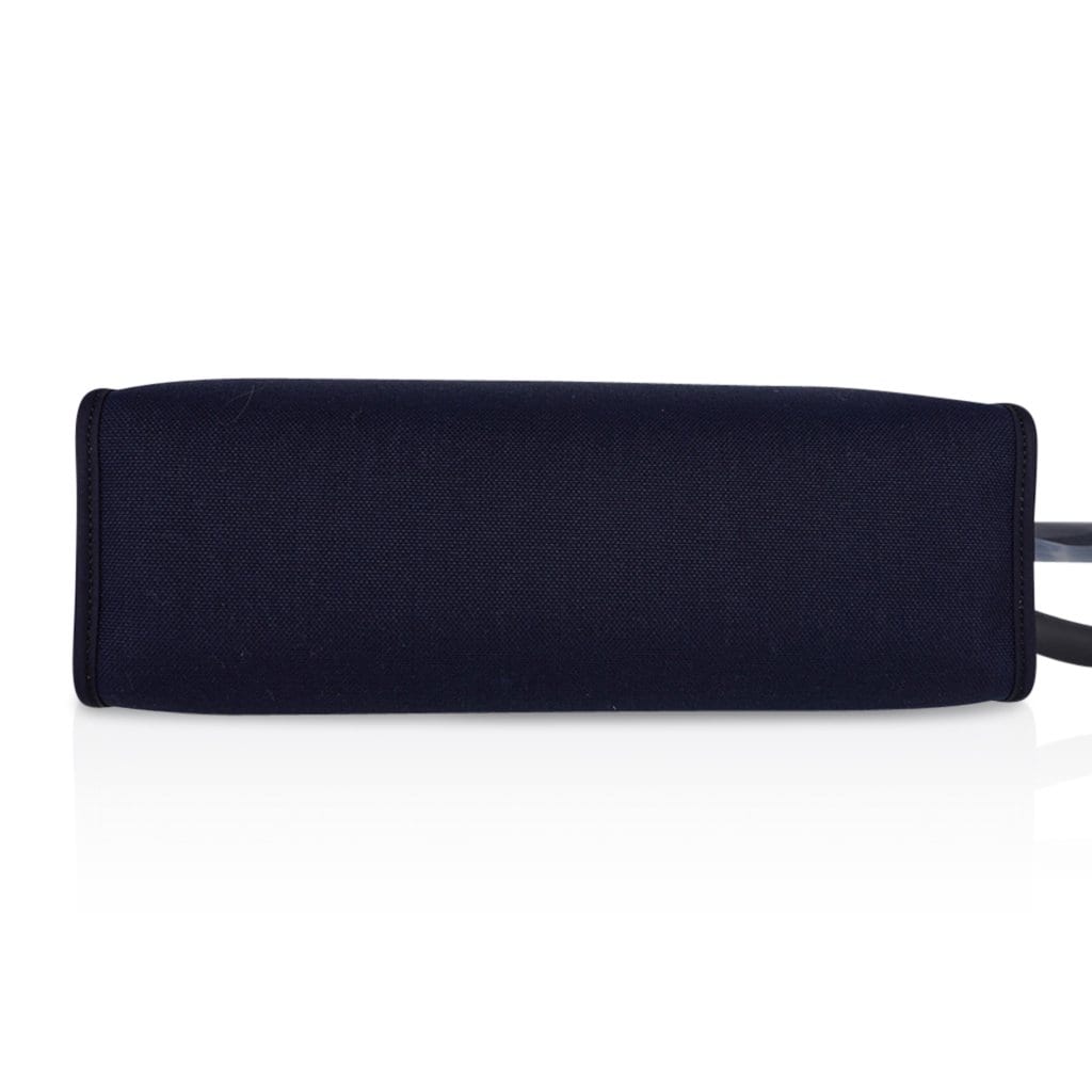 Guaranteed authentic Hermes Herbag Zip 31 featured in Navy Militaire canvas and Black Vache Hunter cowhide leather.