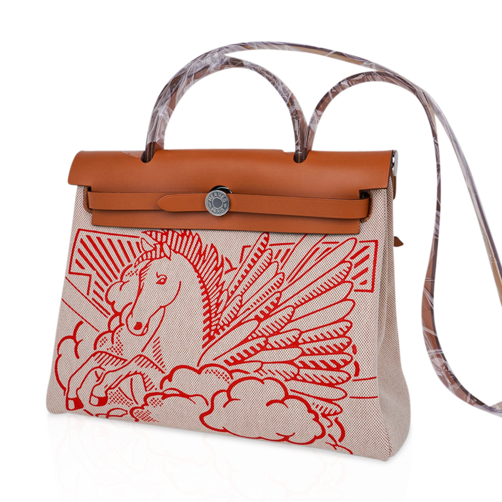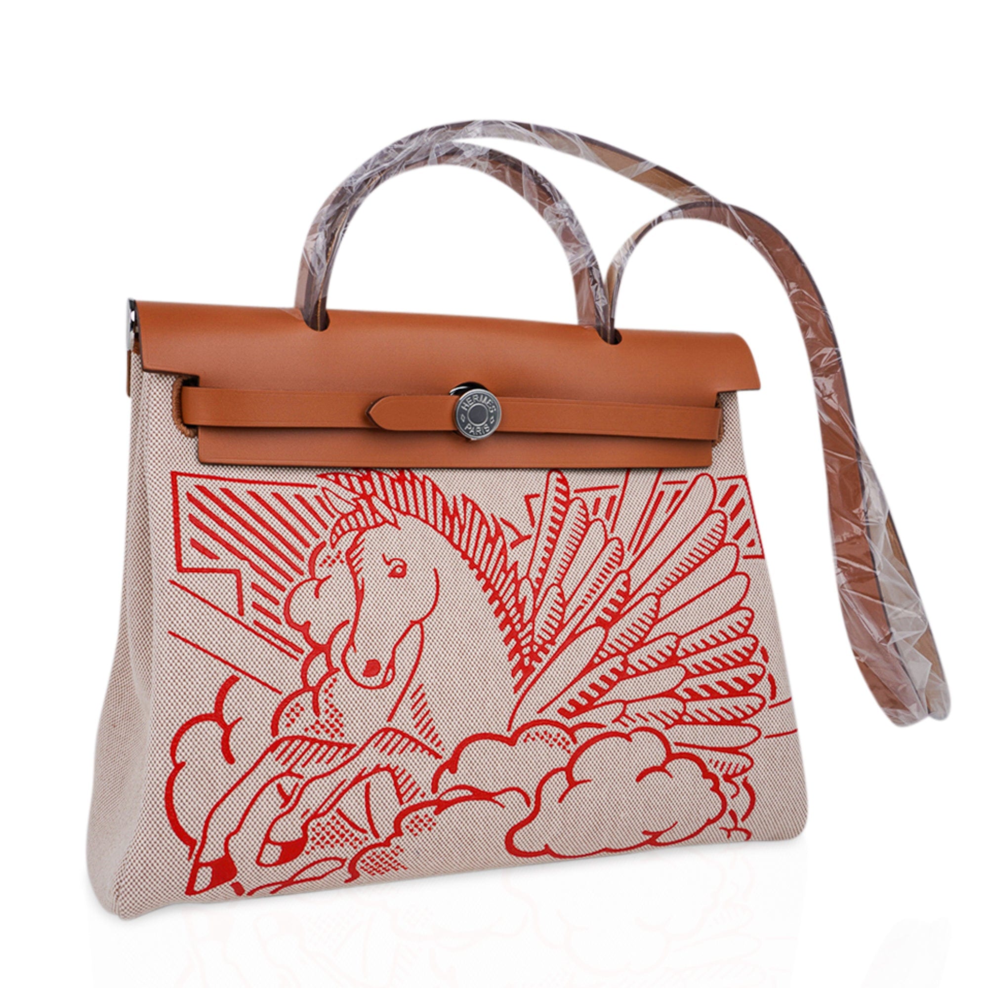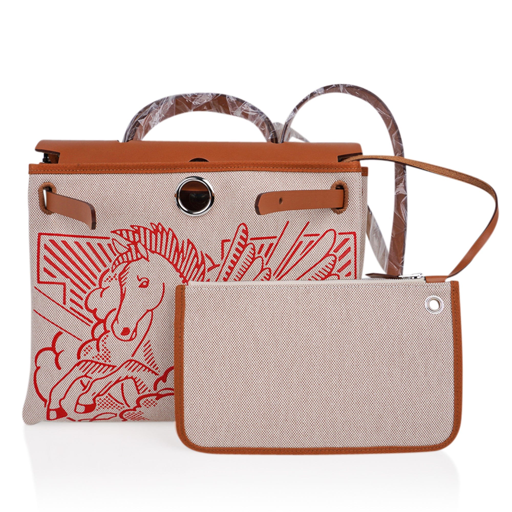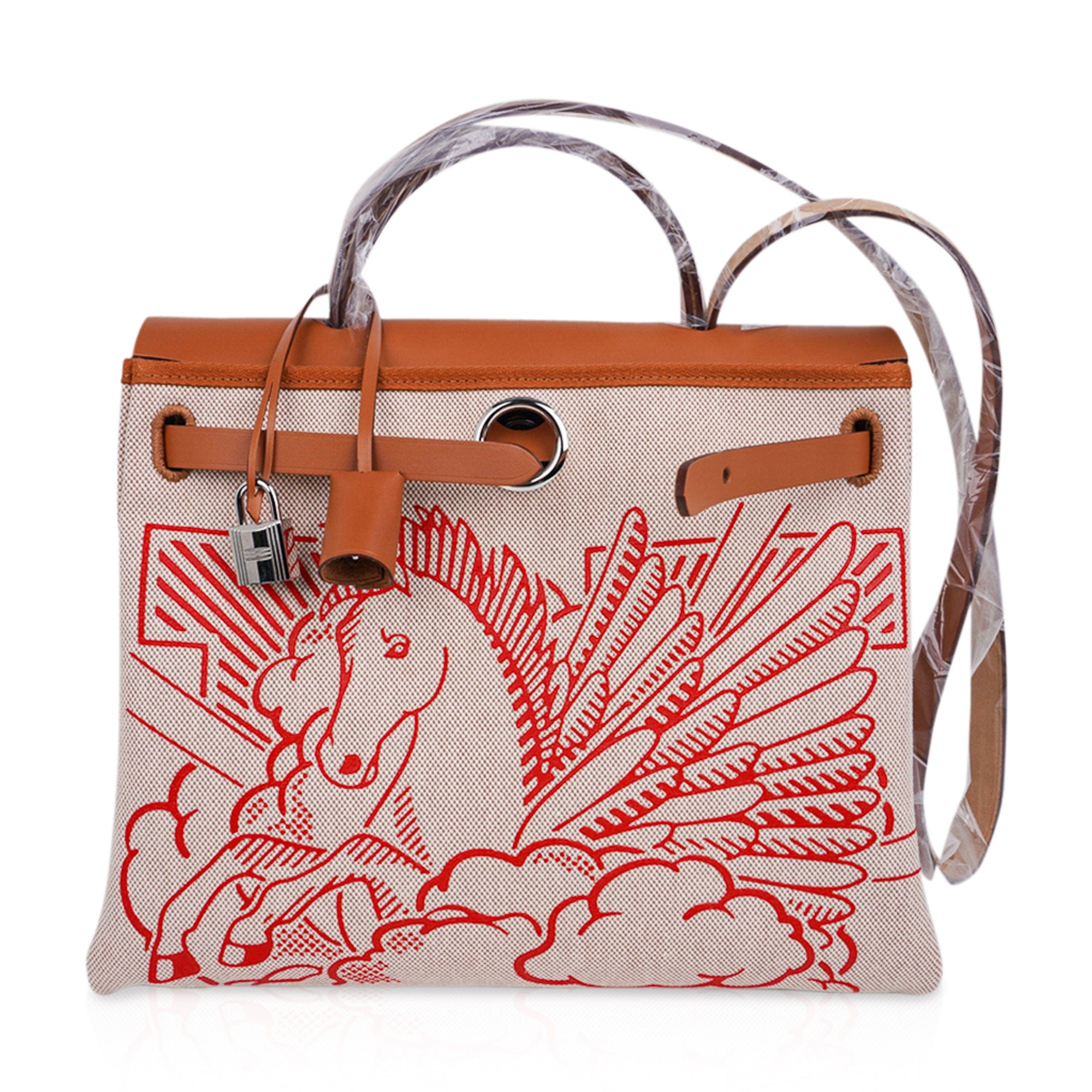 Guaranteed authentic Guaranteed authentic Hermes Herbag Zip 31 special edition Pegase Pop featured in Capucine and Ecru toile and Naturel Vache Hunter leather.
