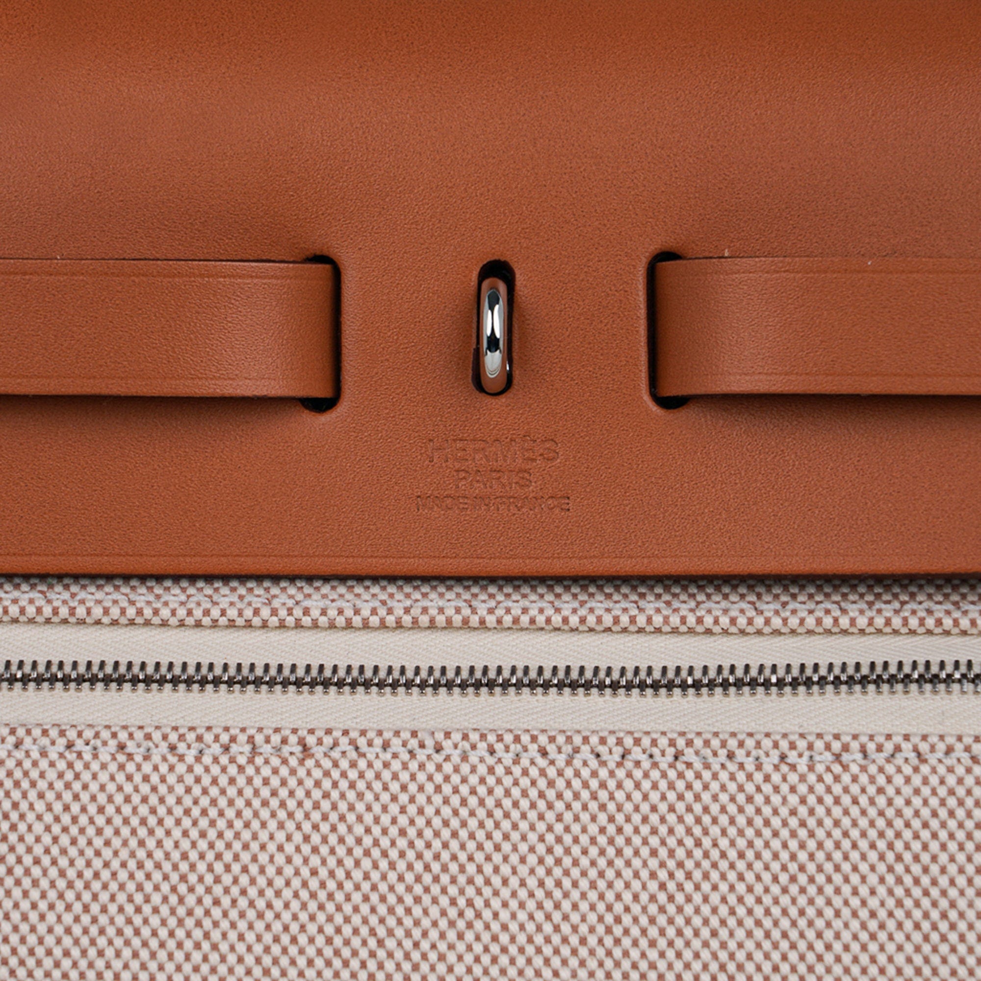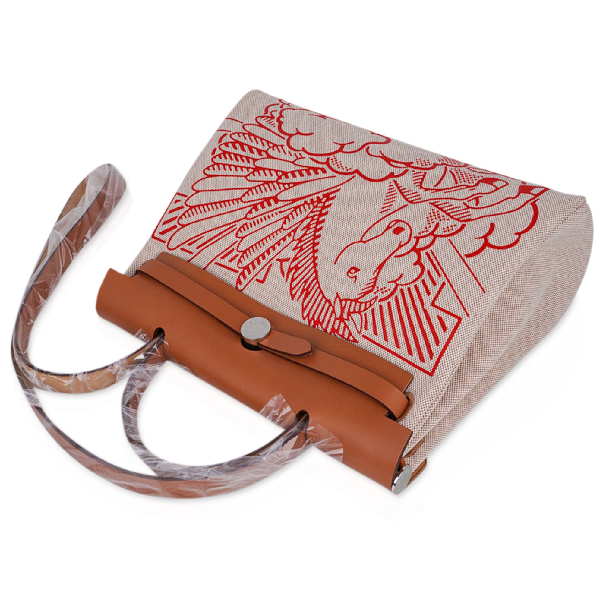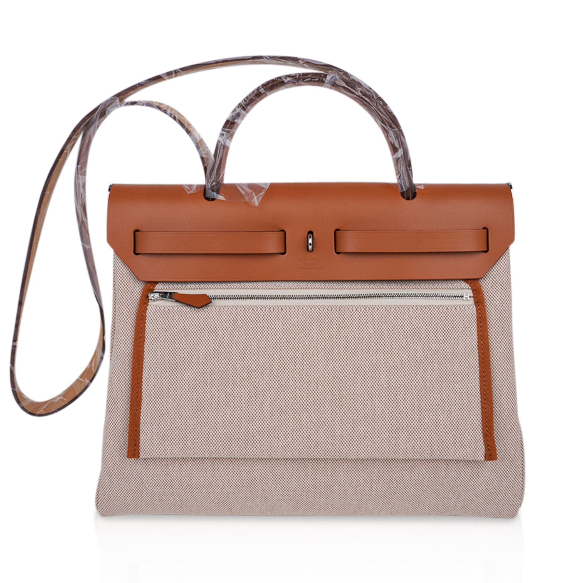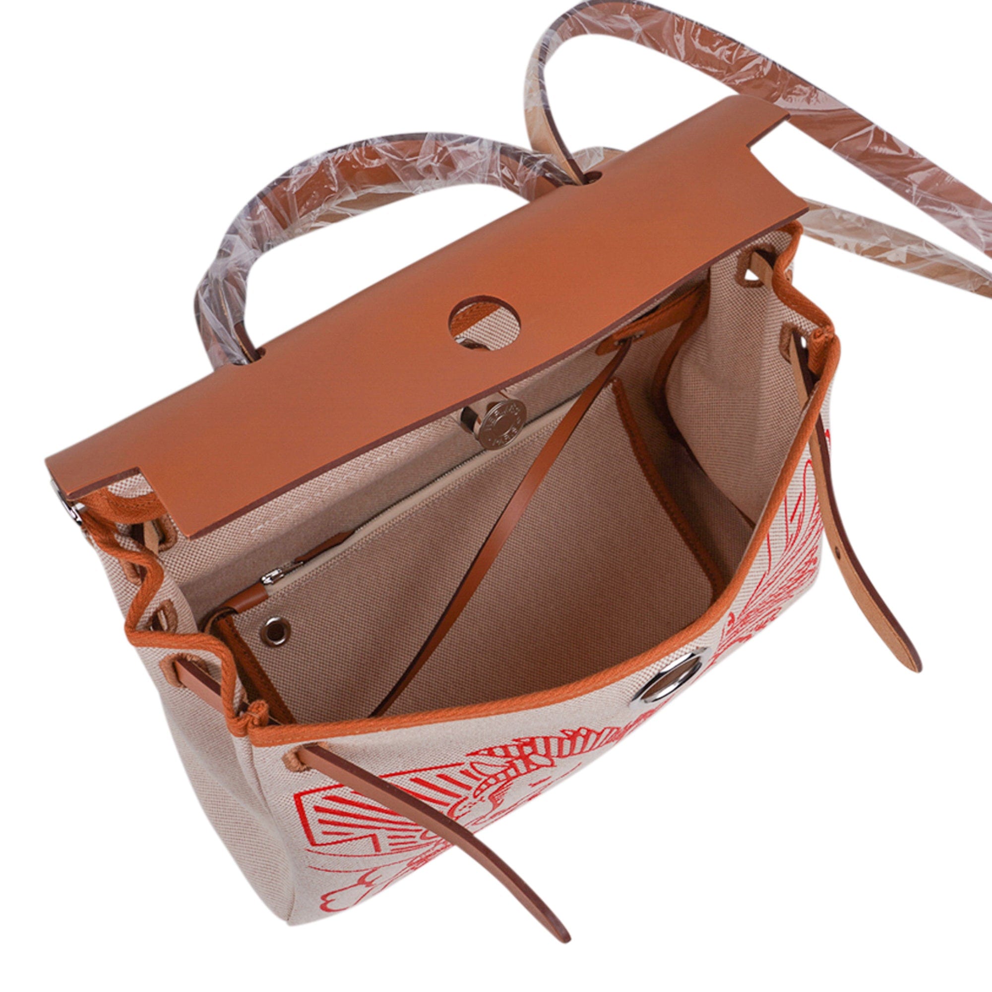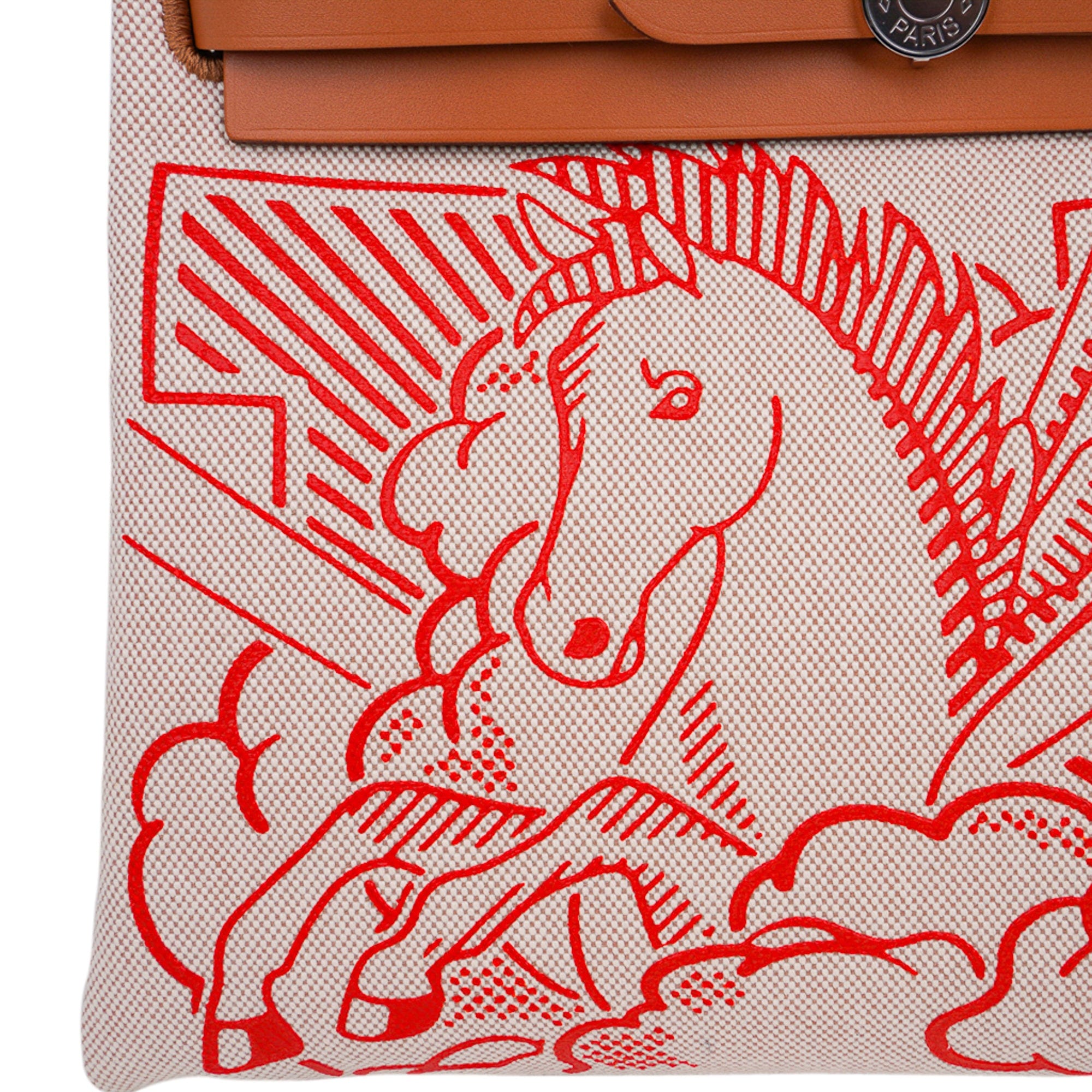 Guaranteed authentic Guaranteed authentic Hermes Herbag Zip 31 special edition Pegase Pop featured in Capucine and Ecru toile and Naturel Vache Hunter leather.