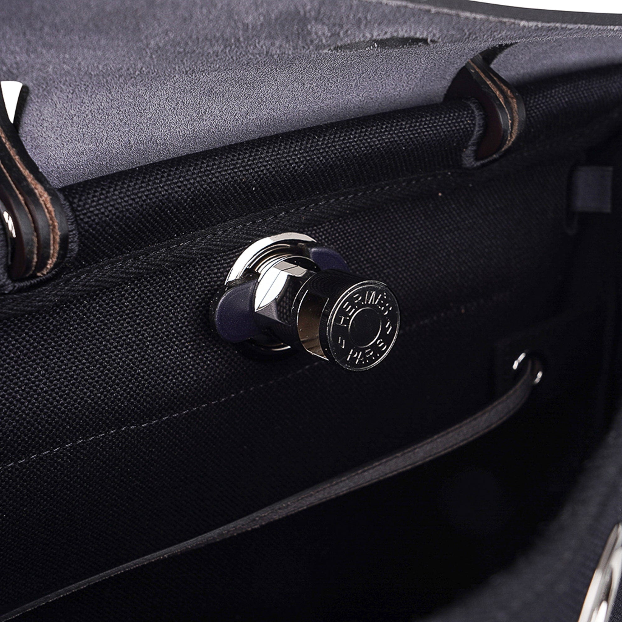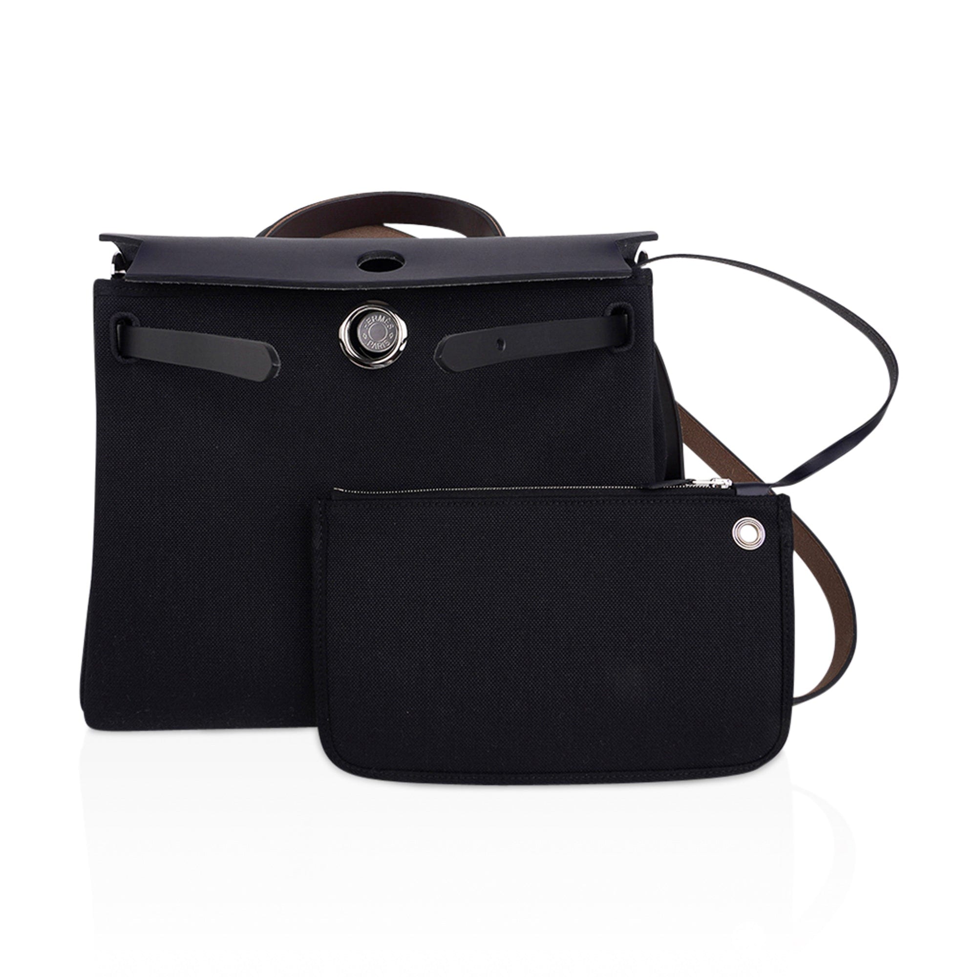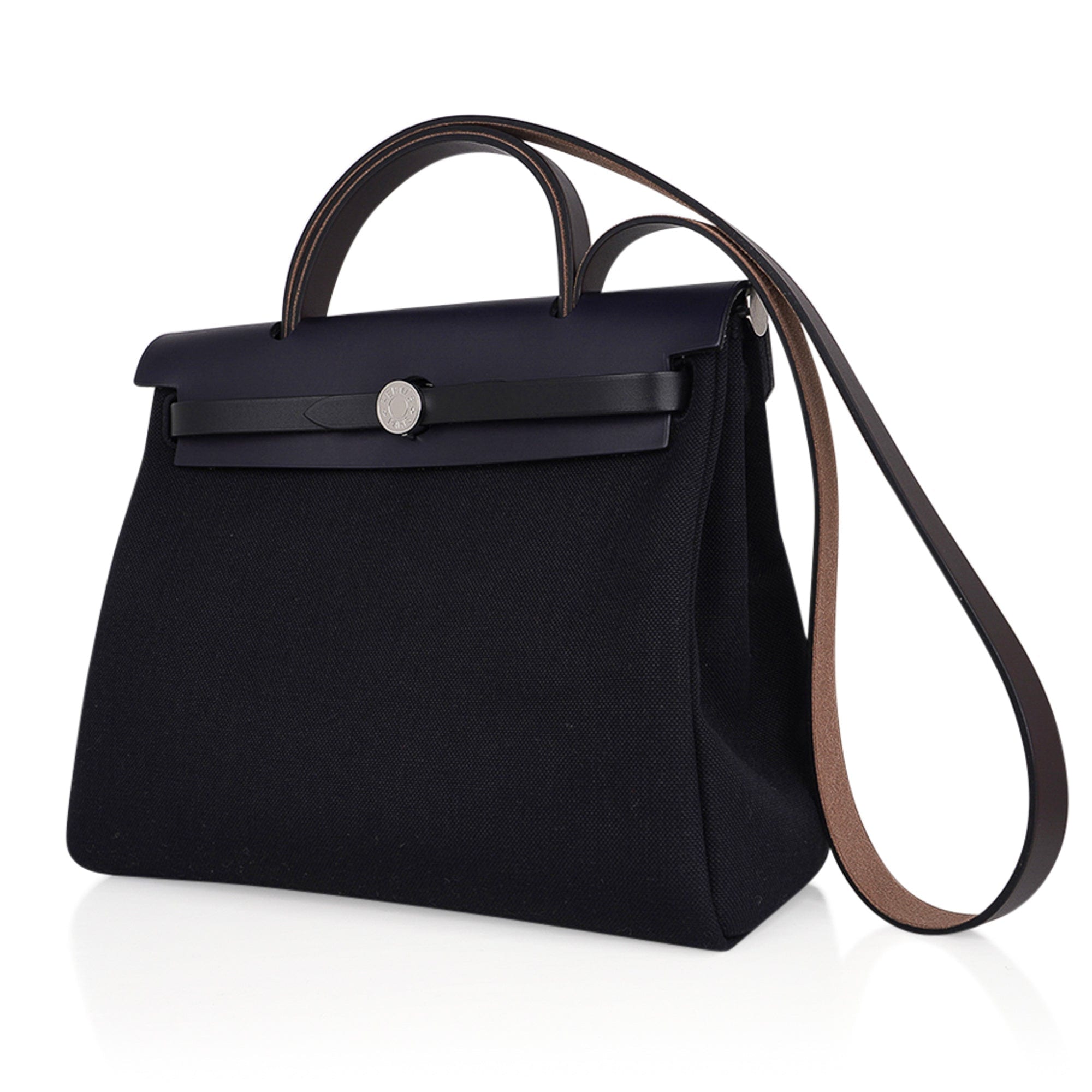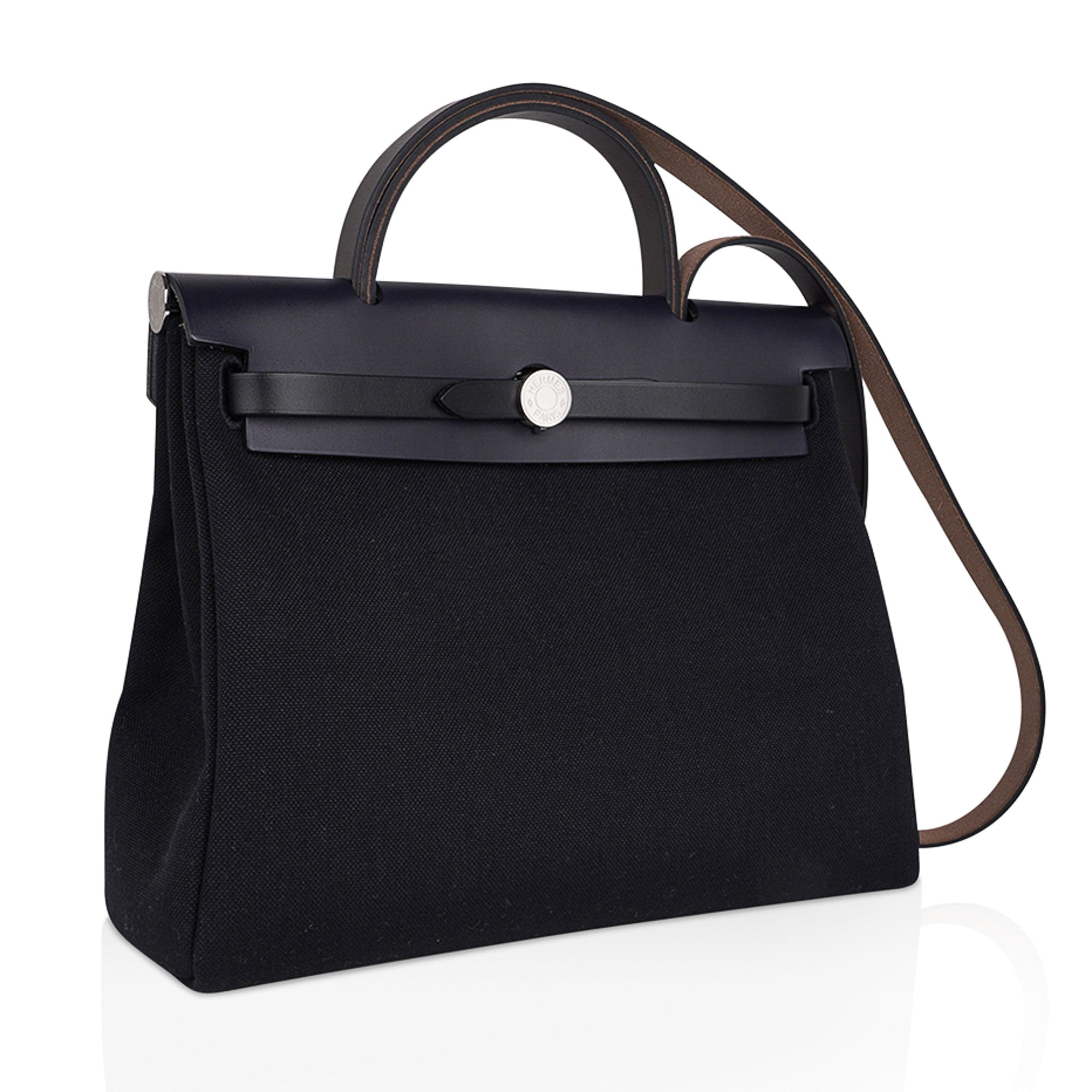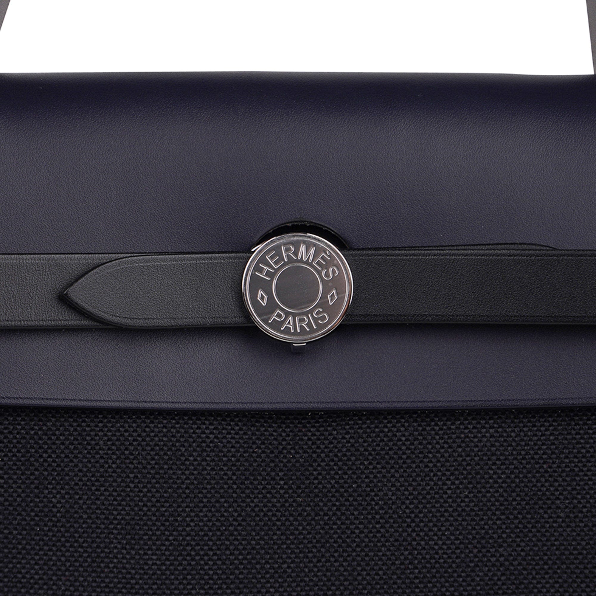 Guaranteed authentic Hermes Herbag Zip 31 featured in Black Toile and Blue Indigo Vache Hunter leather.