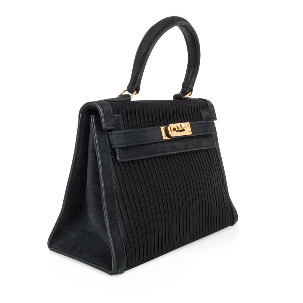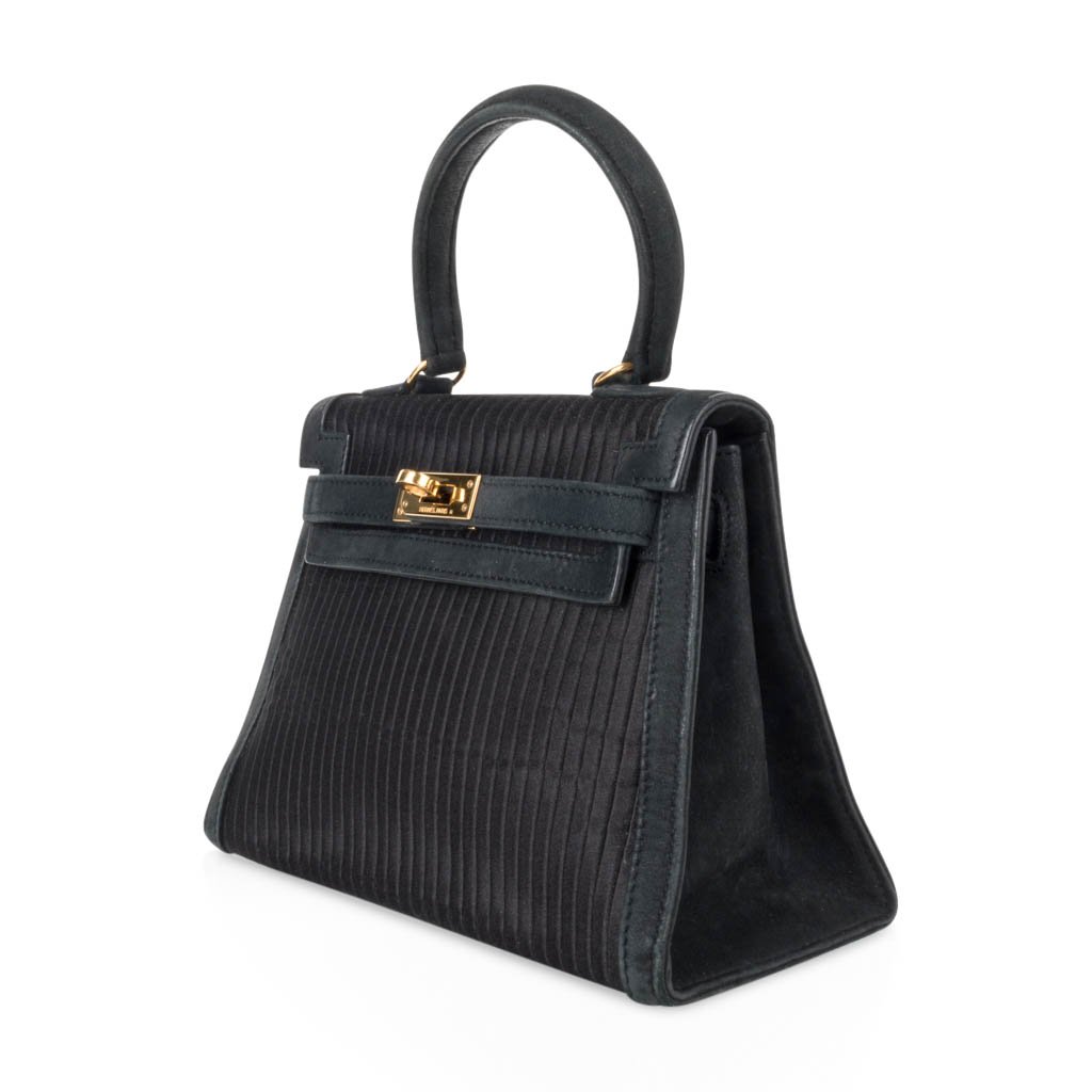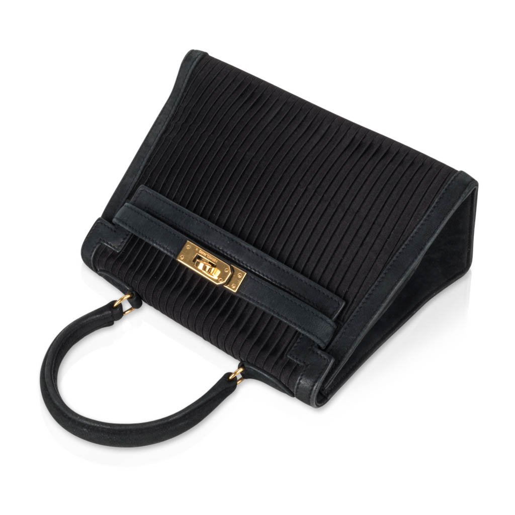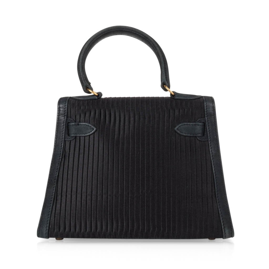 Guaranteed authentic Hermes Kelly 20 Mini Black Vintage bag features pleated silk and gold hardware.