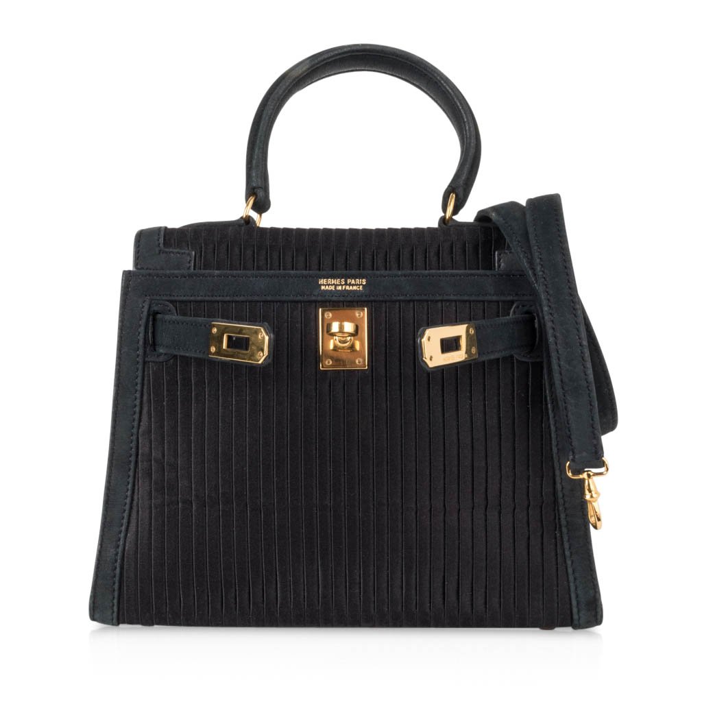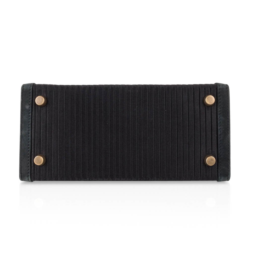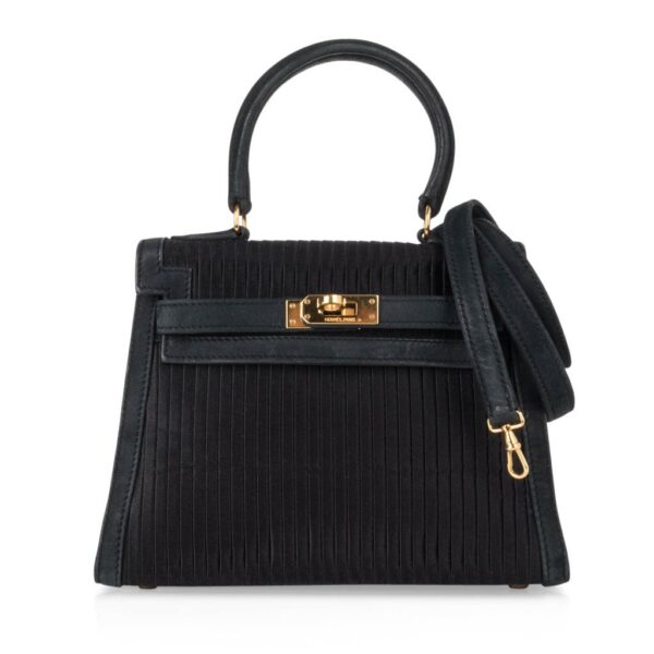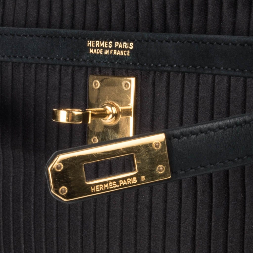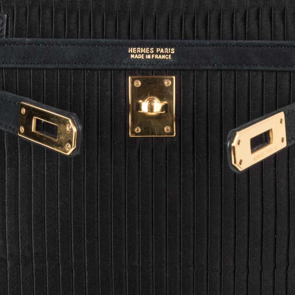 Guaranteed authentic Hermes Kelly 20 Mini Black Vintage bag features pleated silk and gold hardware.
