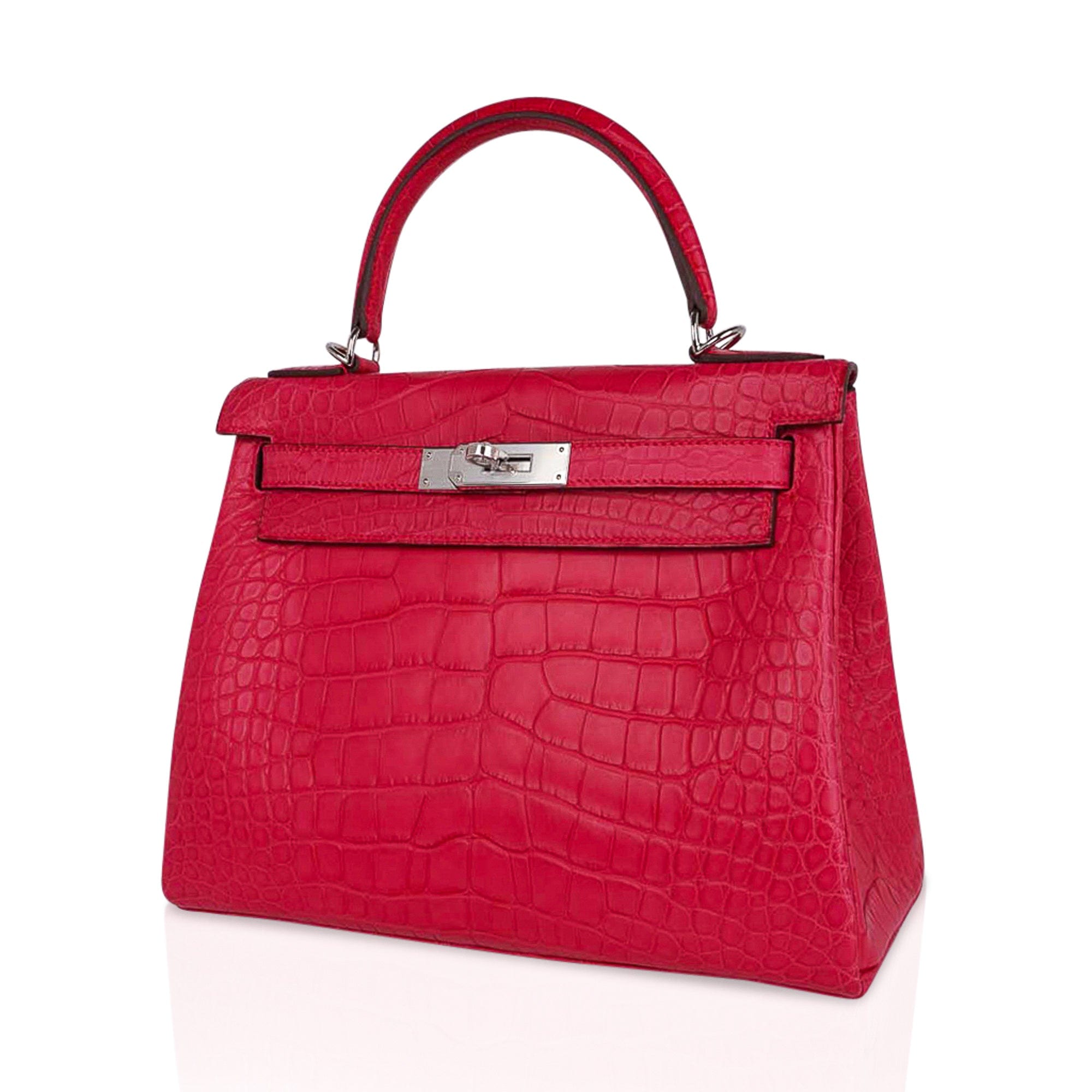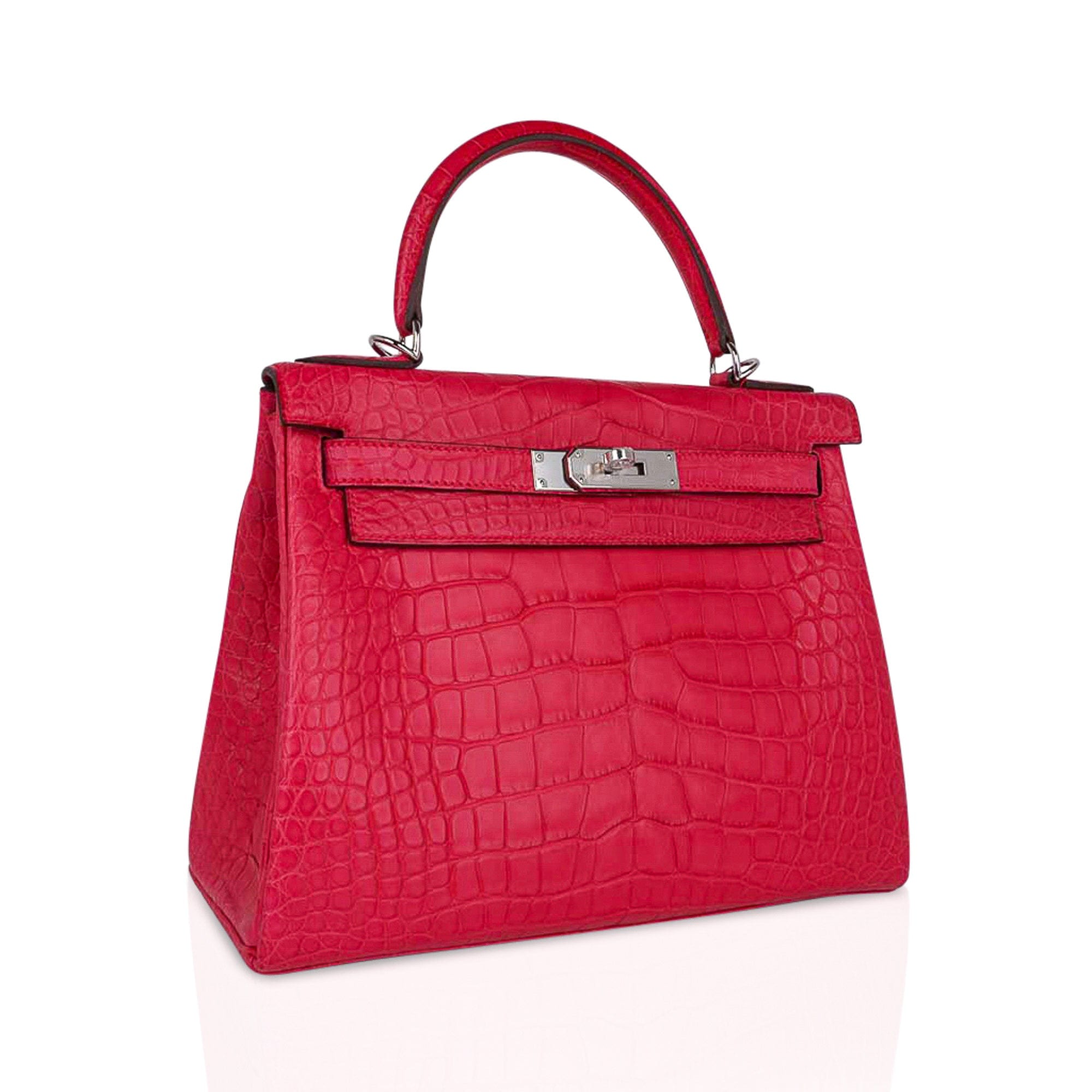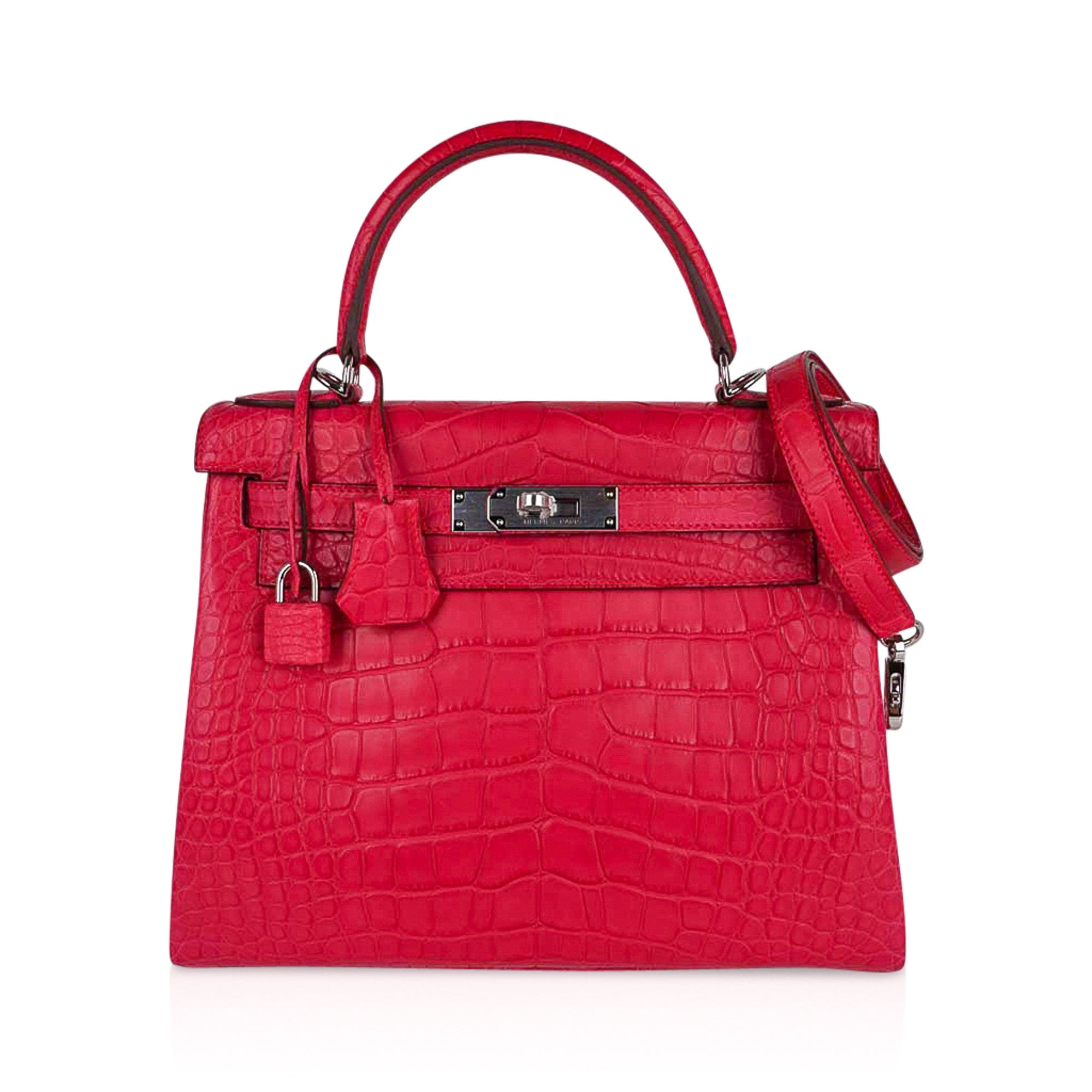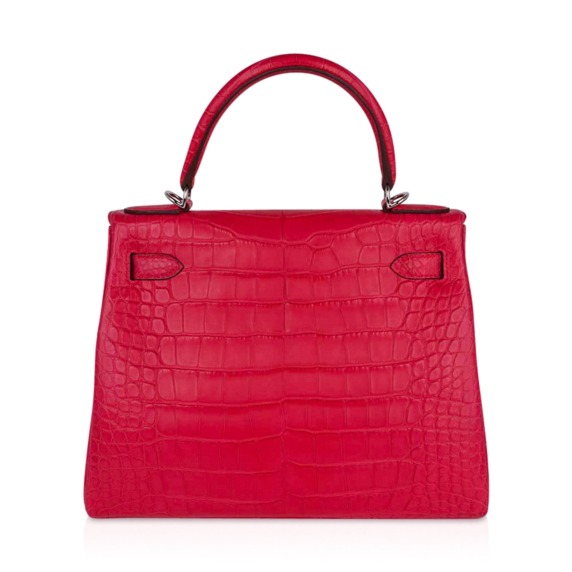 Guaranteed authentic Hermes Kelly 28 bag featured in rich jewel toned Rose Extreme matte alligator.