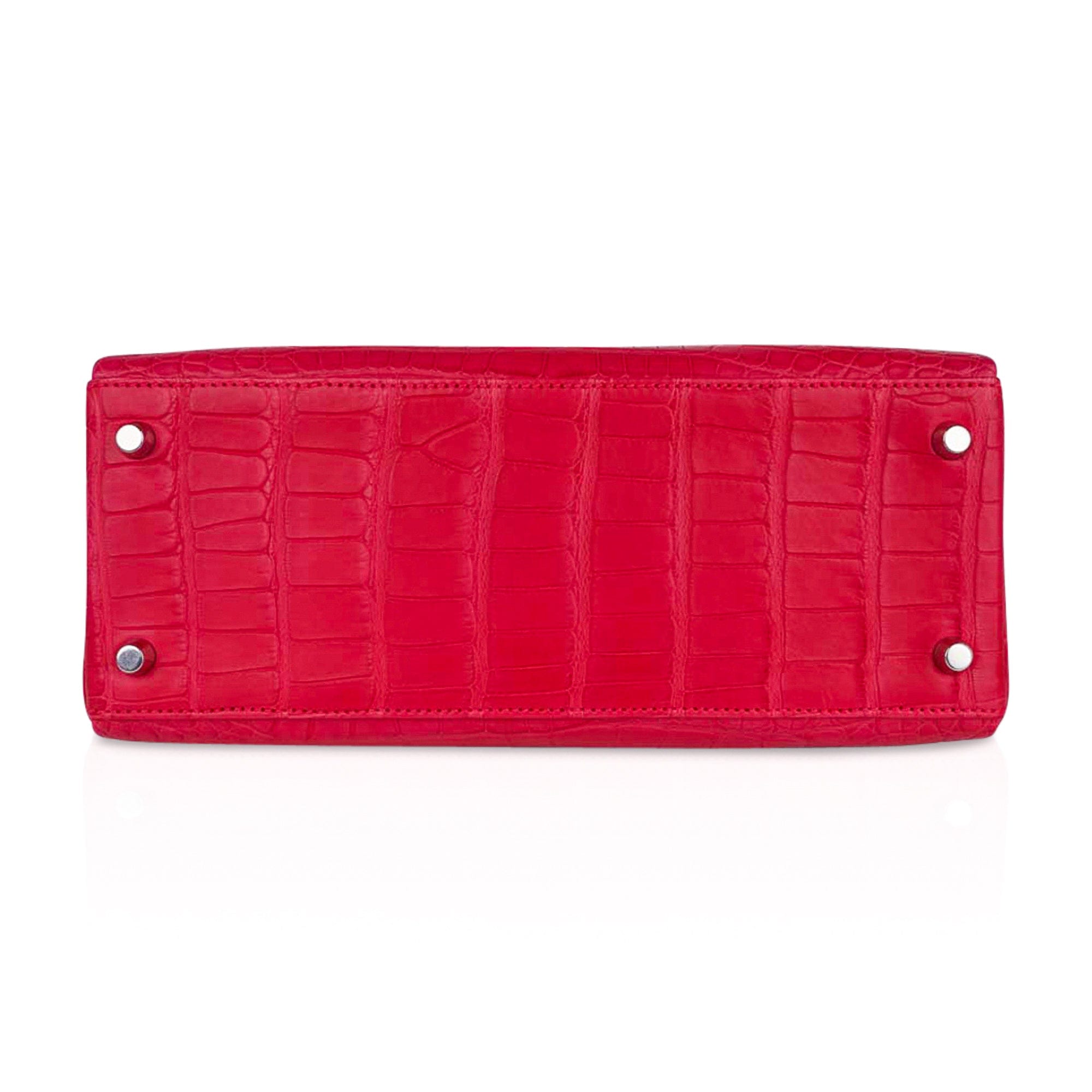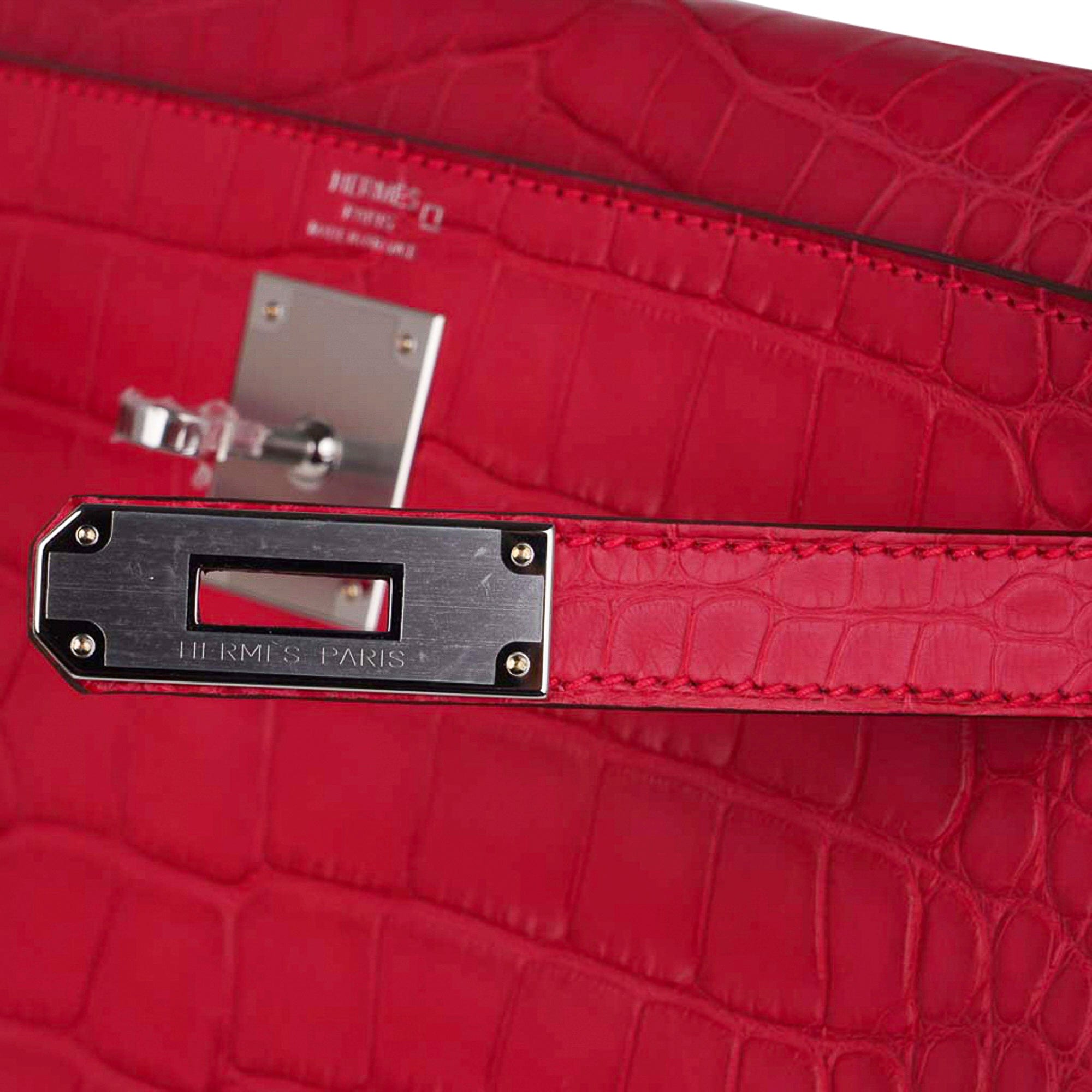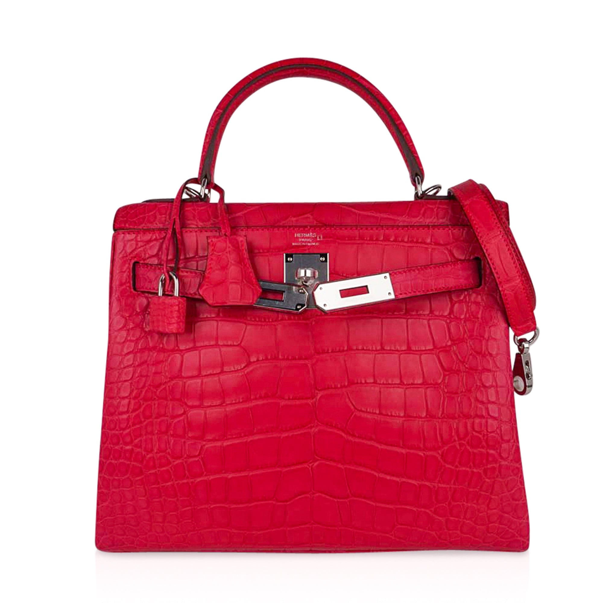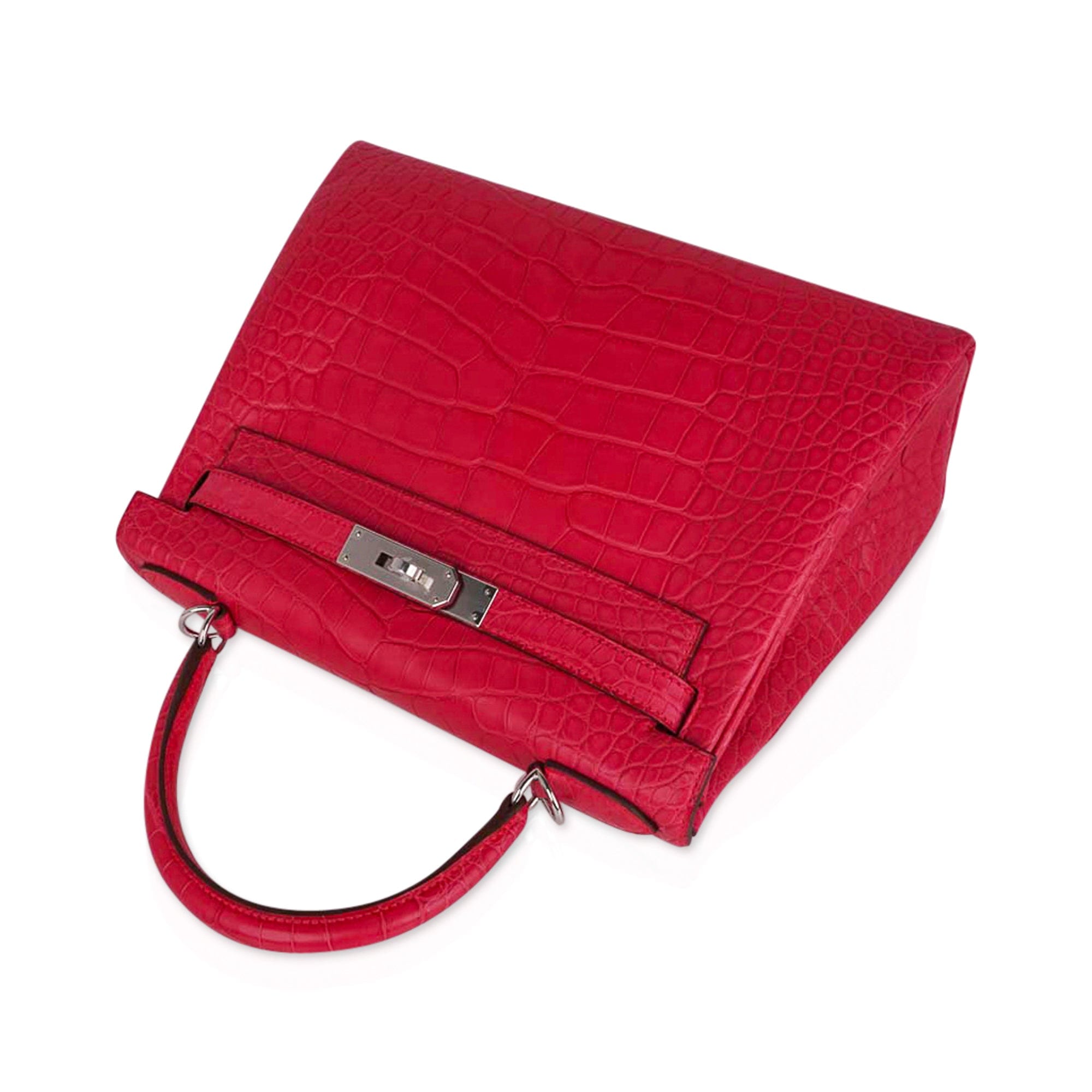 Guaranteed authentic Hermes Kelly 28 bag featured in rich jewel toned Rose Extreme matte alligator.