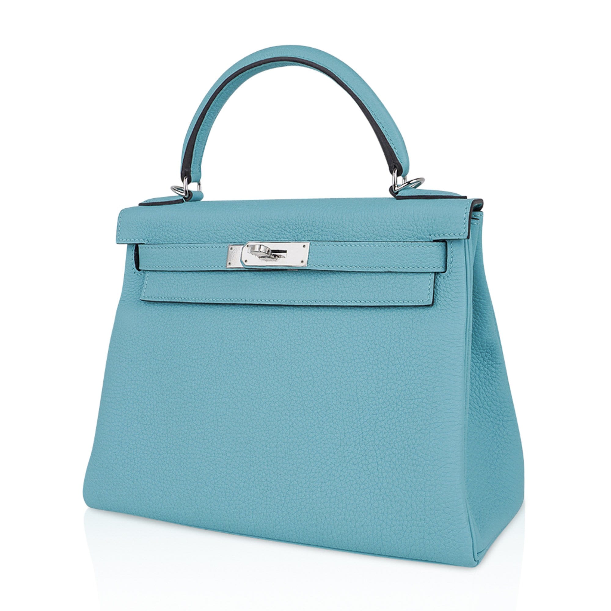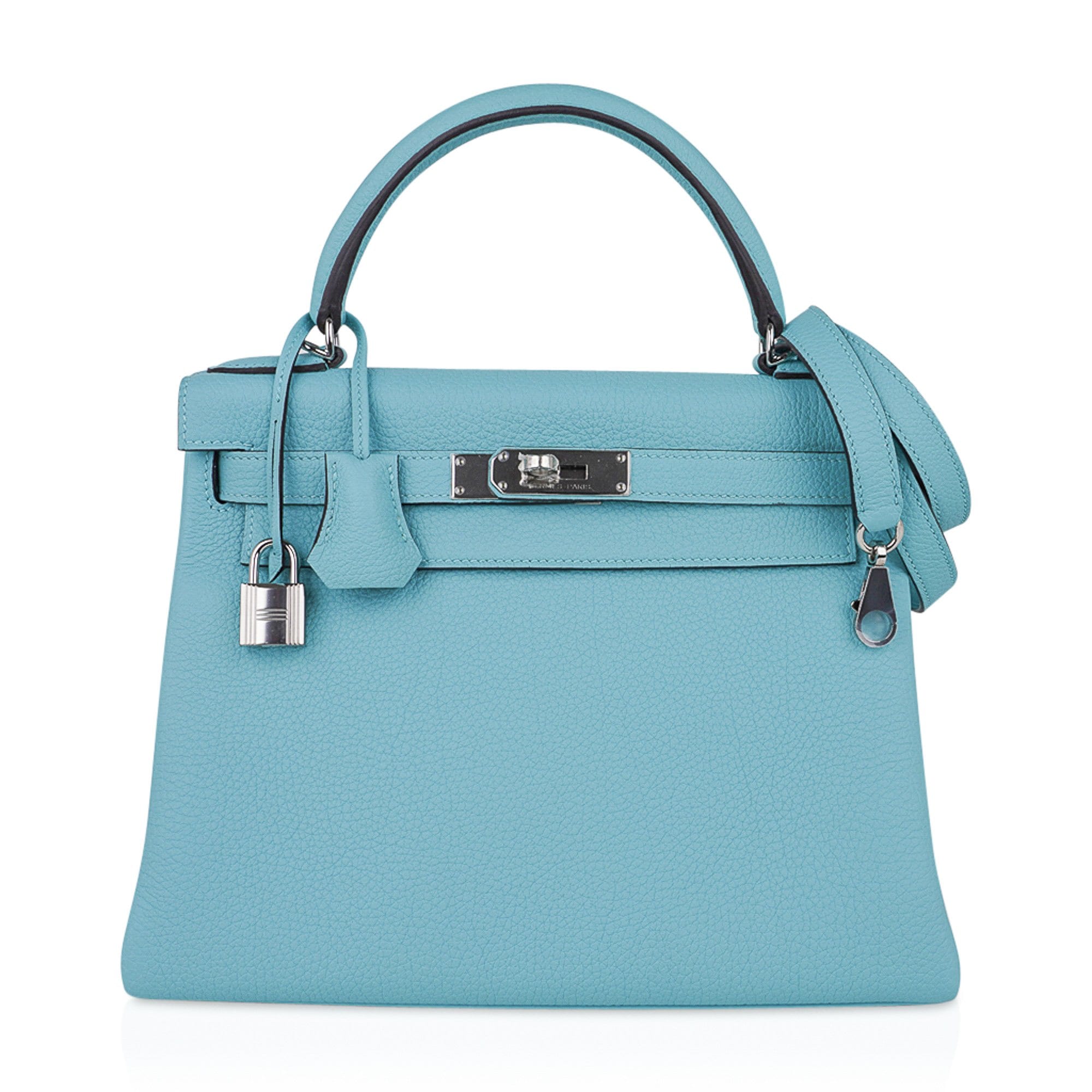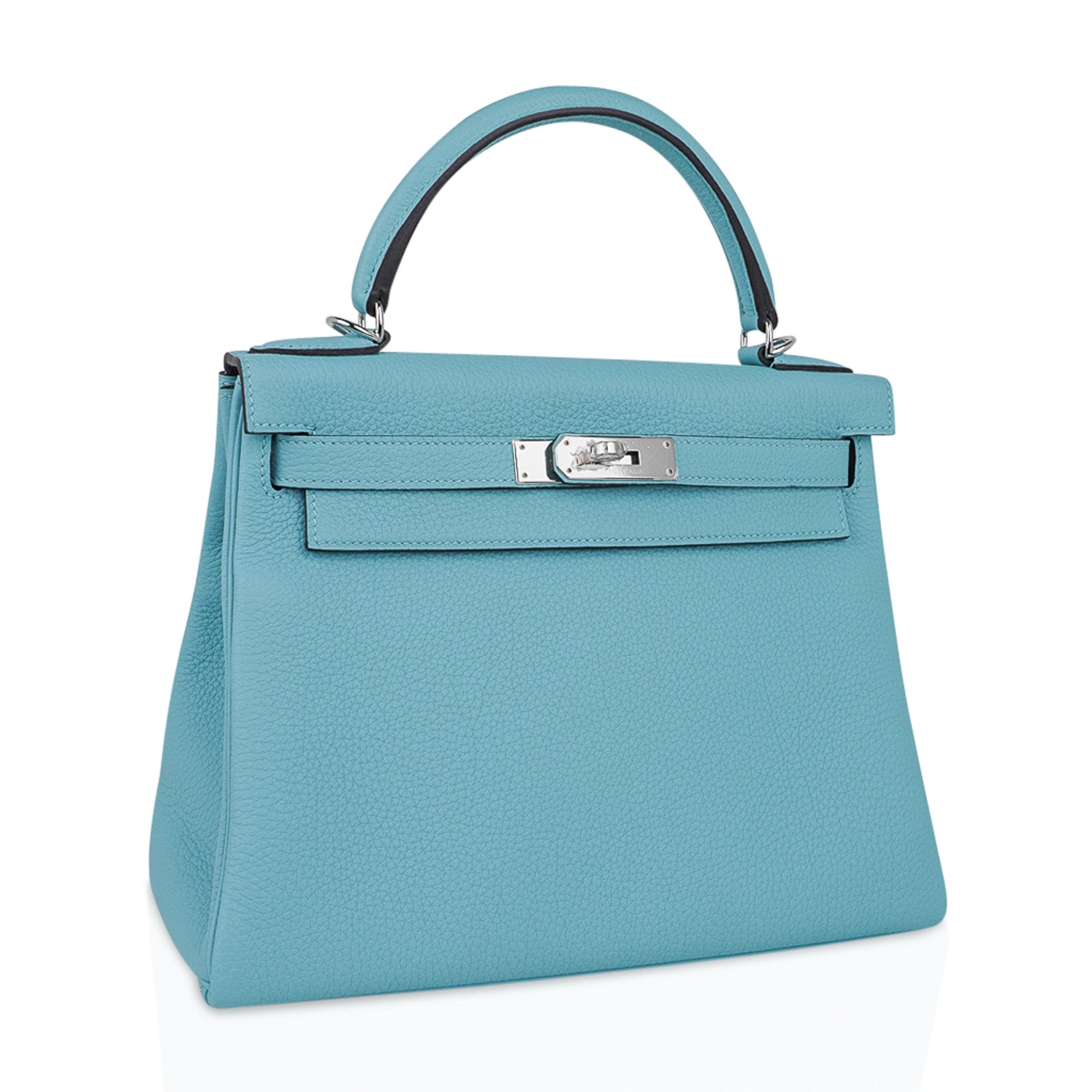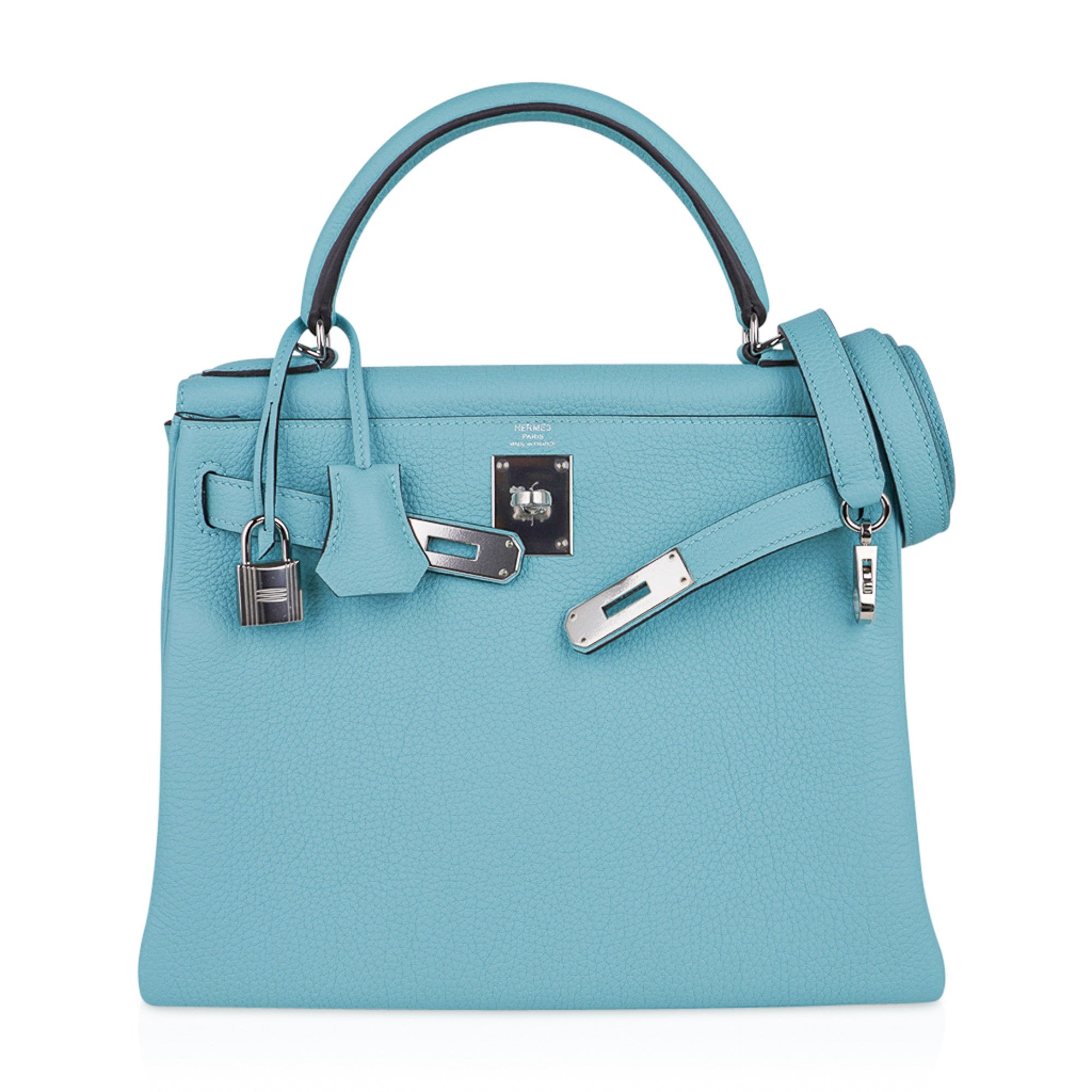 This serene blue Hermes Kelly bag in rare Blue Atoll is gorgeous in Togo leather with fresh palladium hardware.