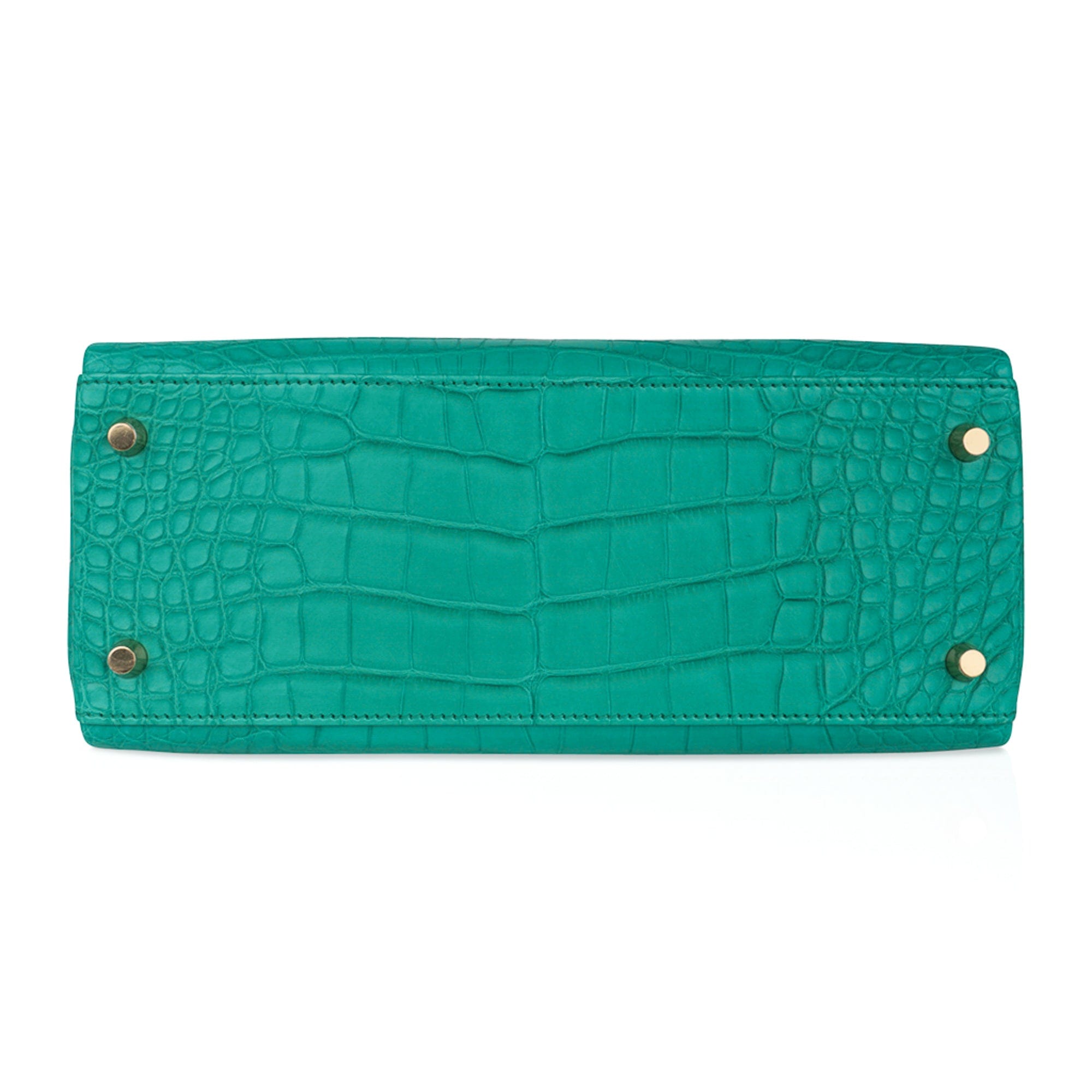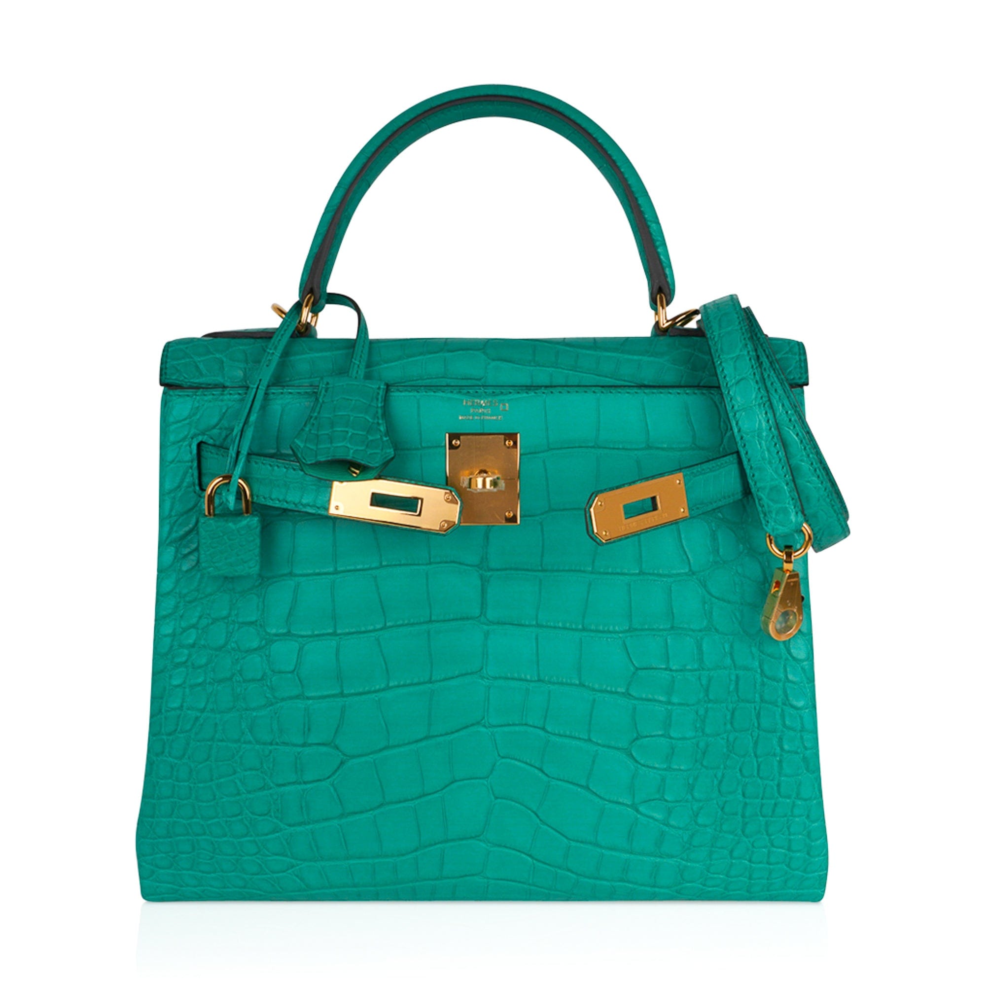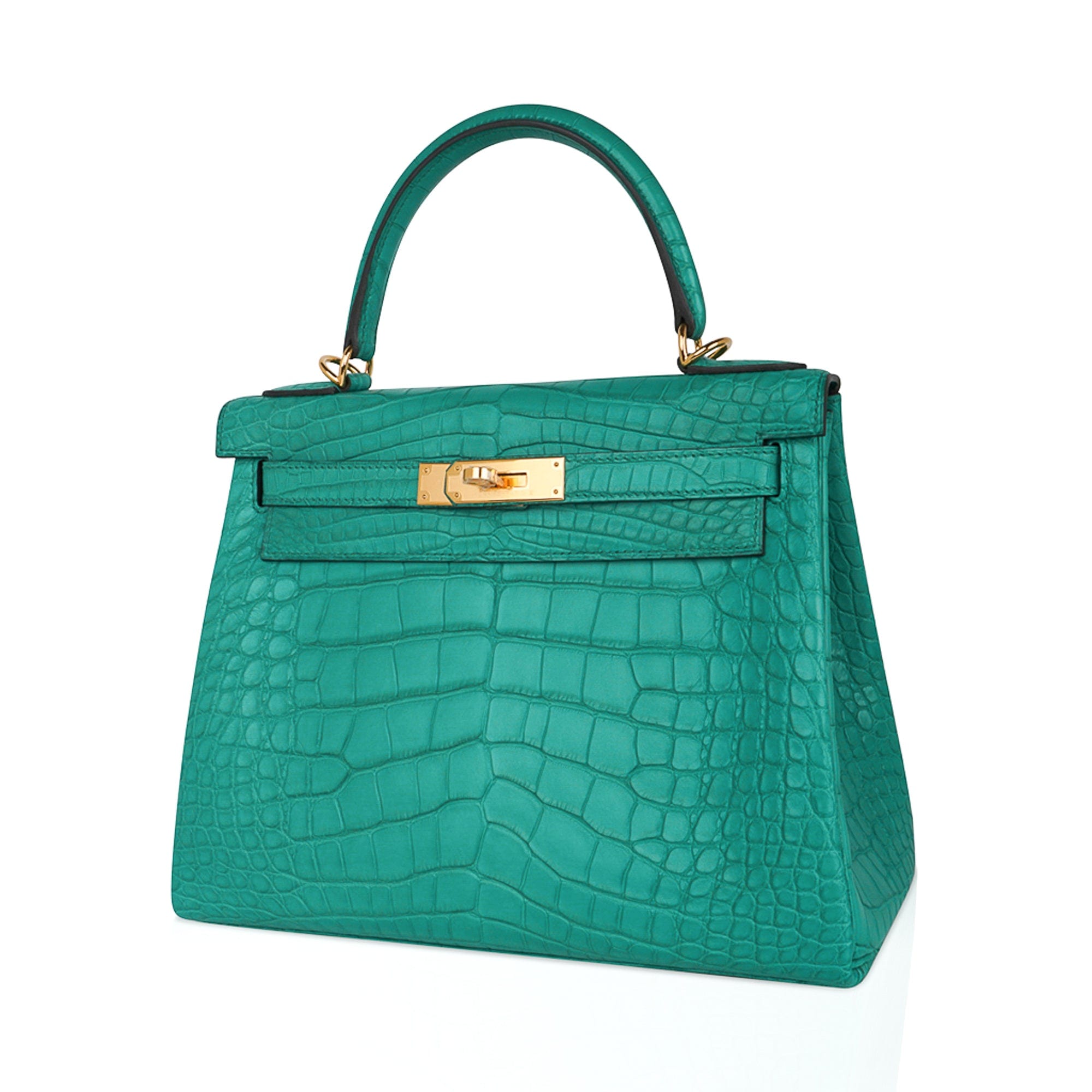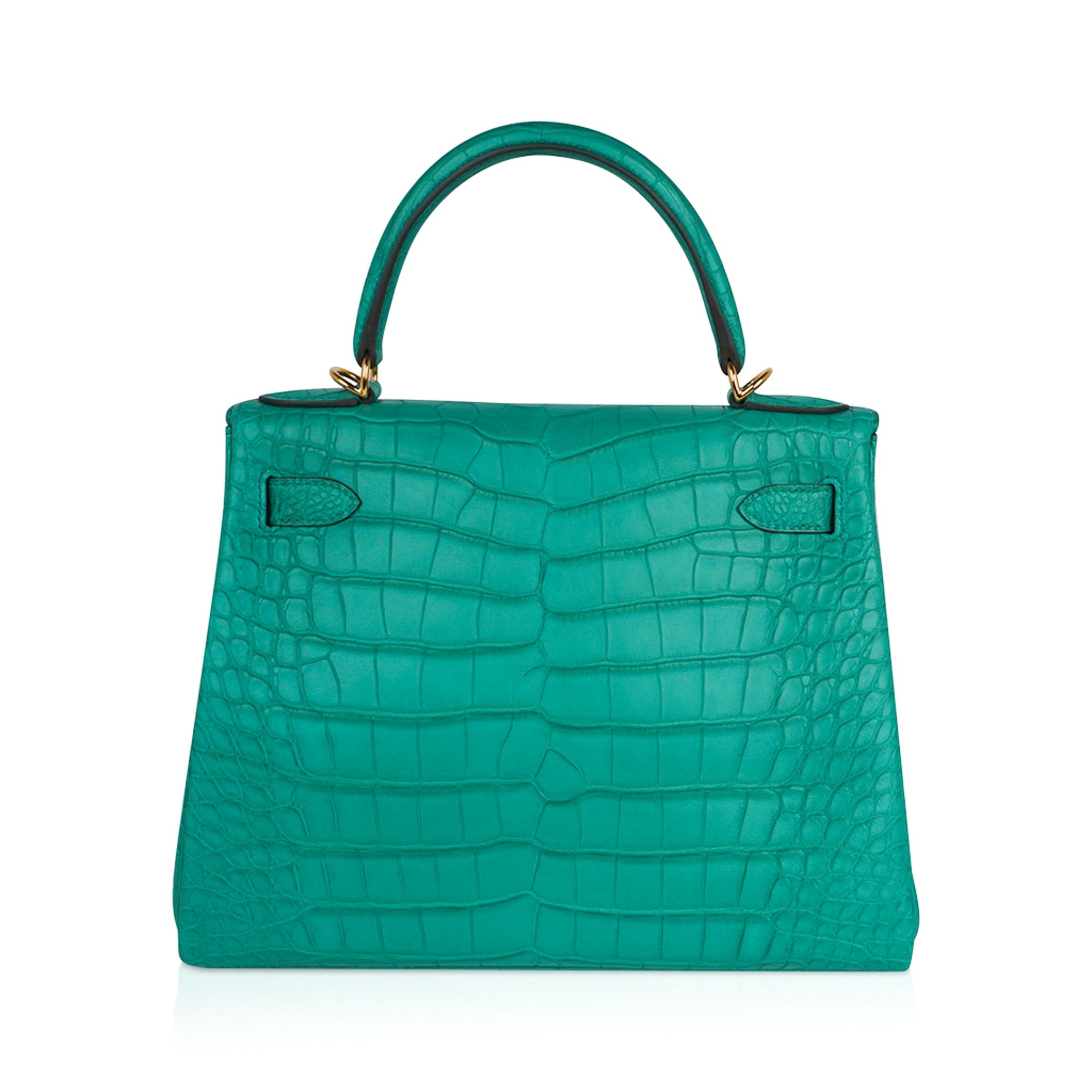 Guaranteed authentic Hermes Kelly 28 bag featured in stunning Vert Jade matte alligator.