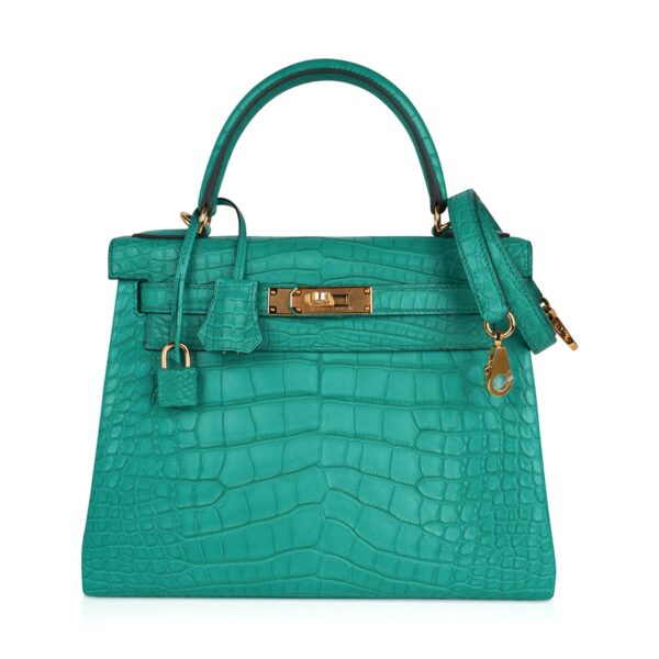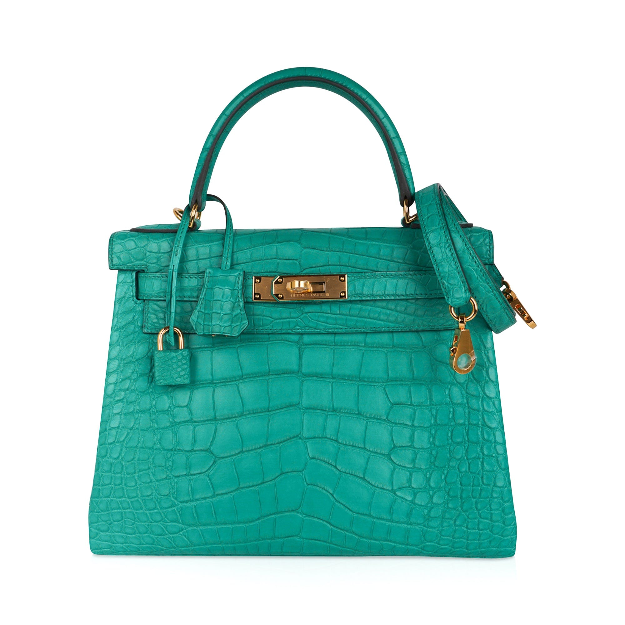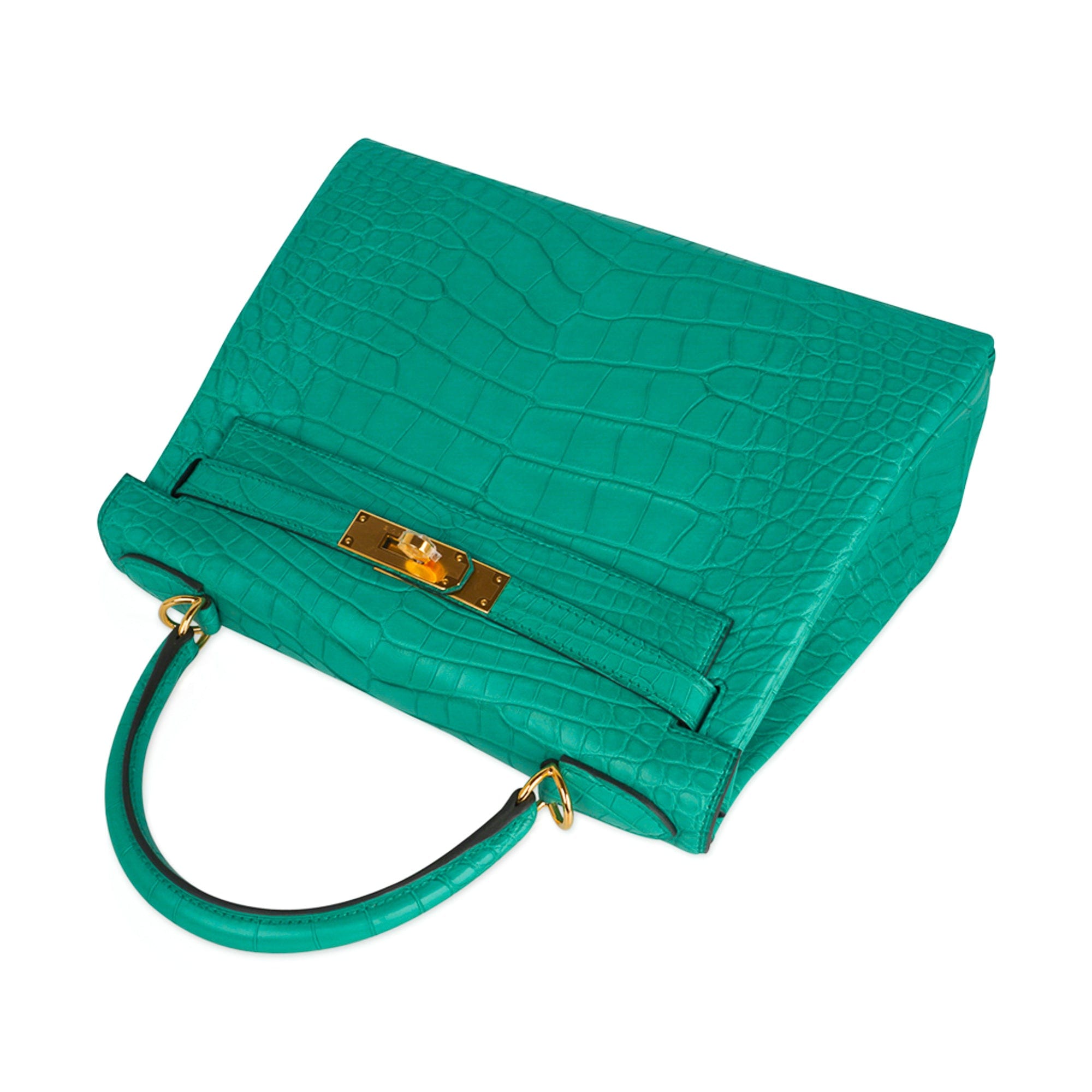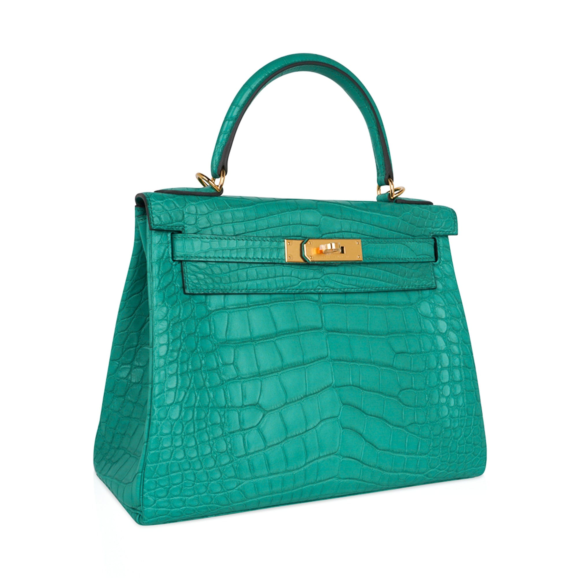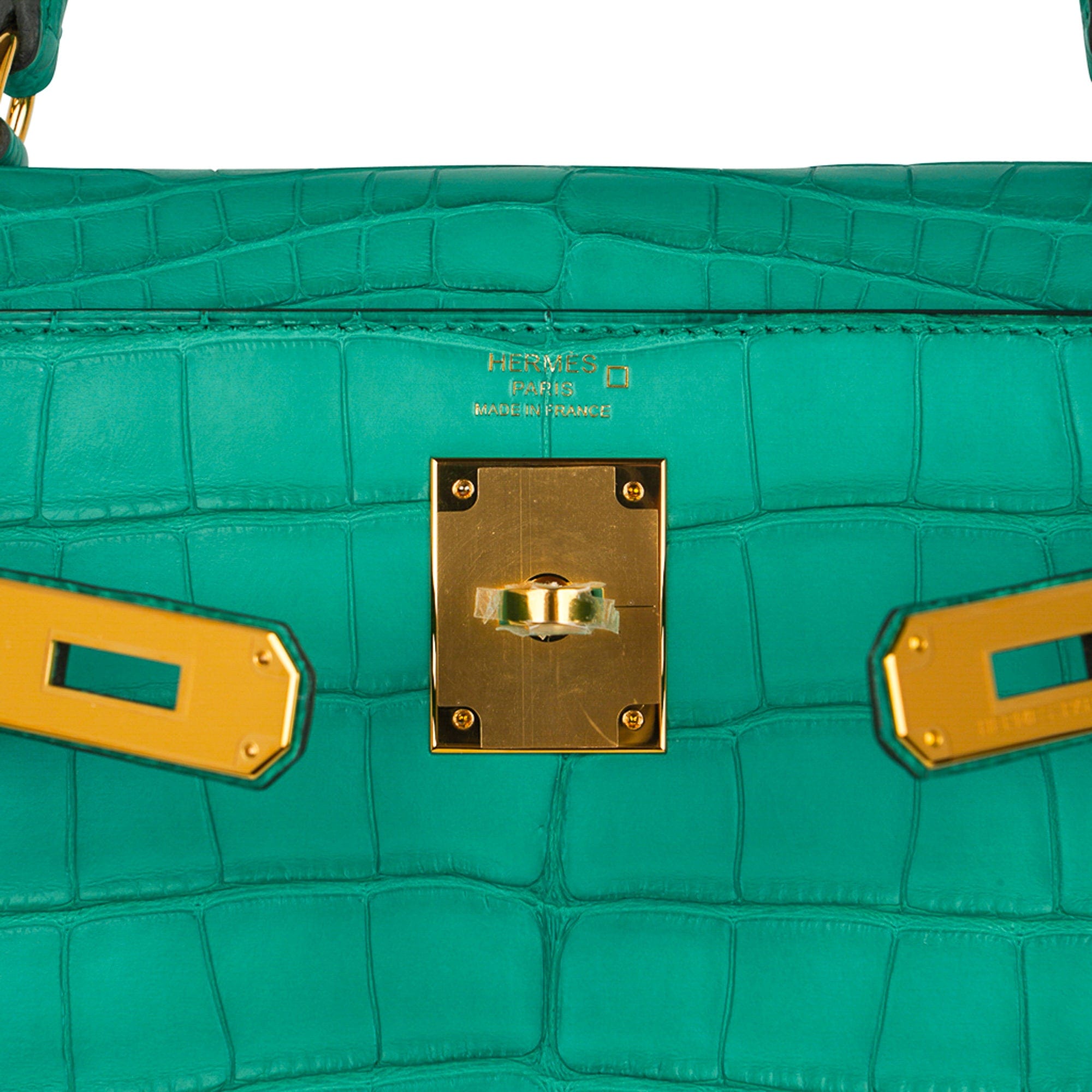 Guaranteed authentic Hermes Kelly 28 bag featured in stunning Vert Jade matte alligator.