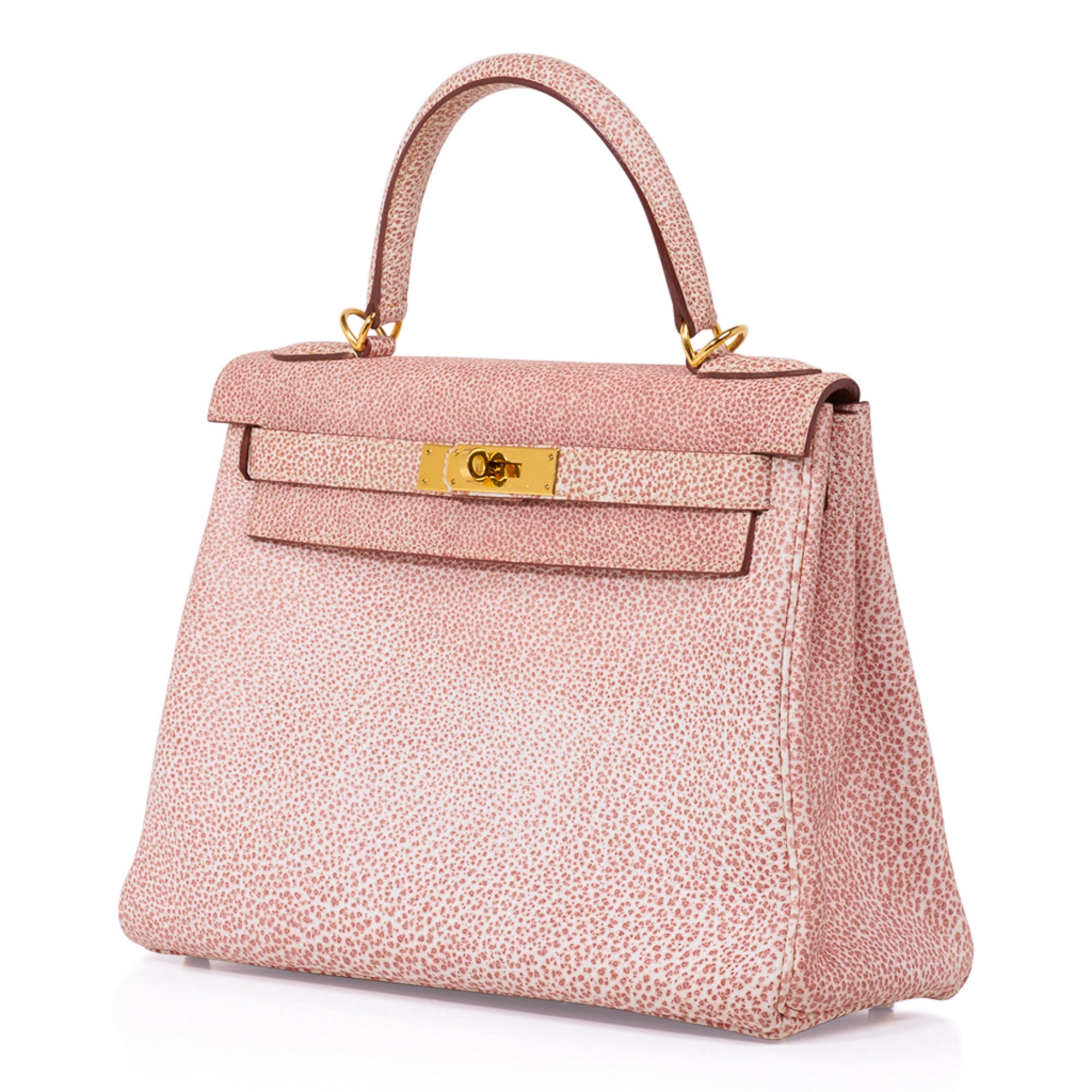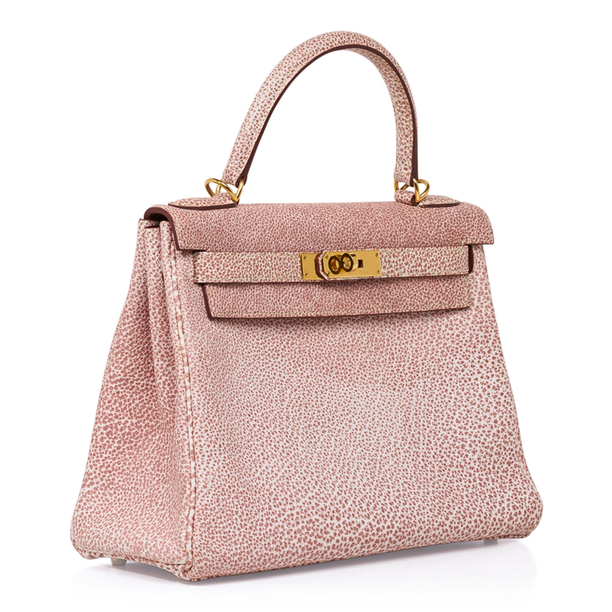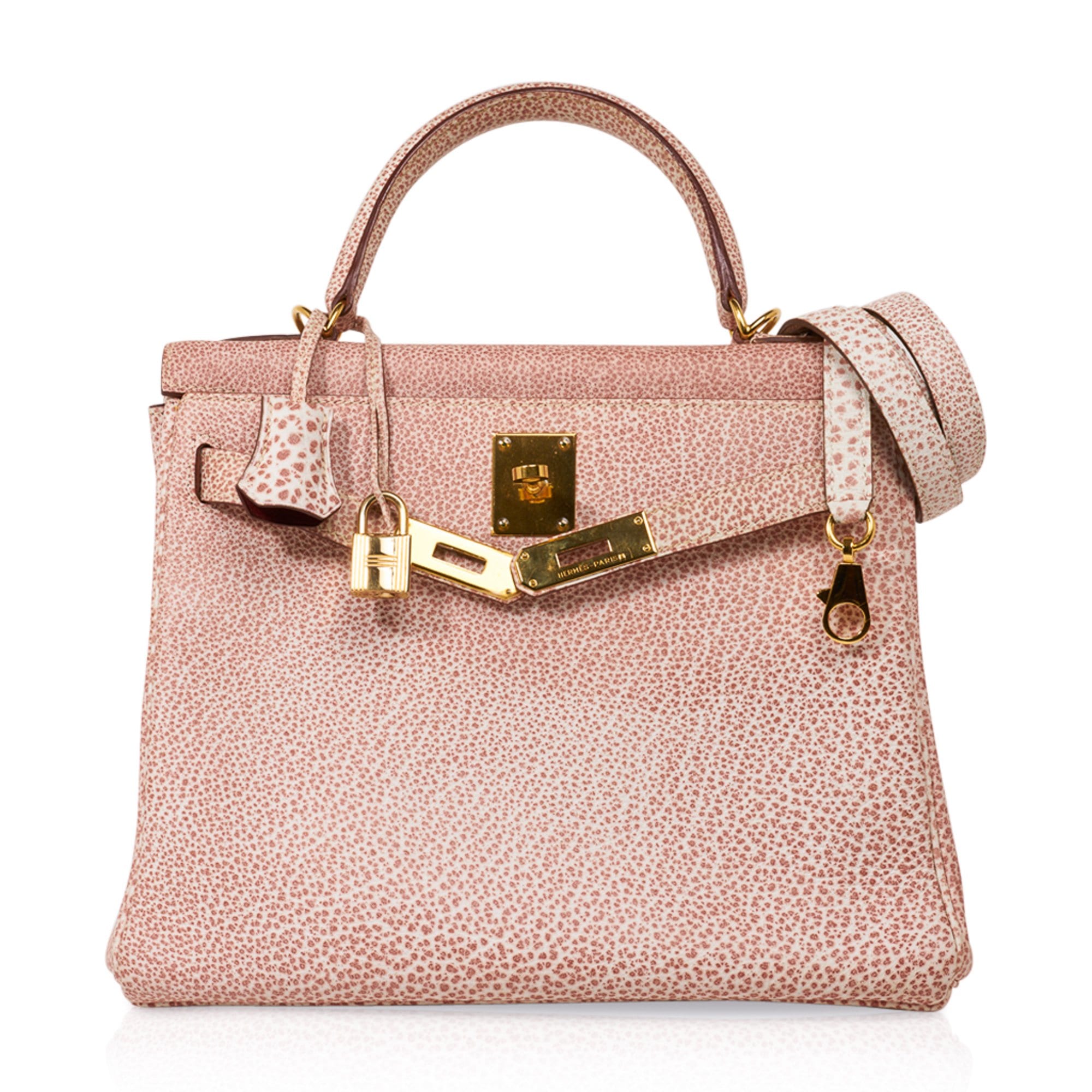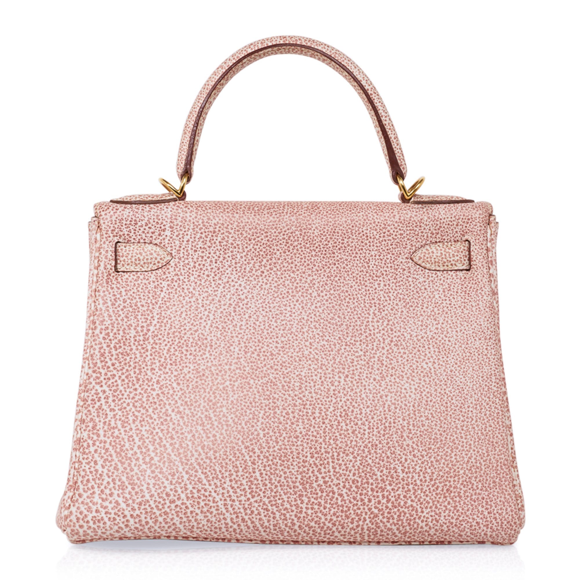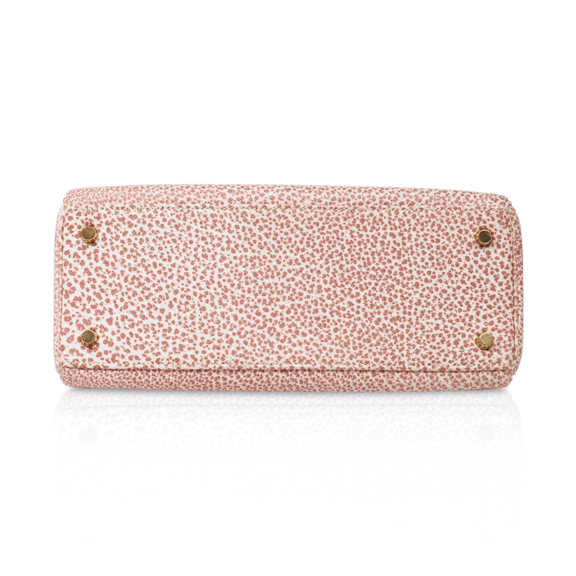 Guaranteed authentic Hermes Kelly 28 bag featured in Pink and White Dalmation Buffalo Skipper leather.