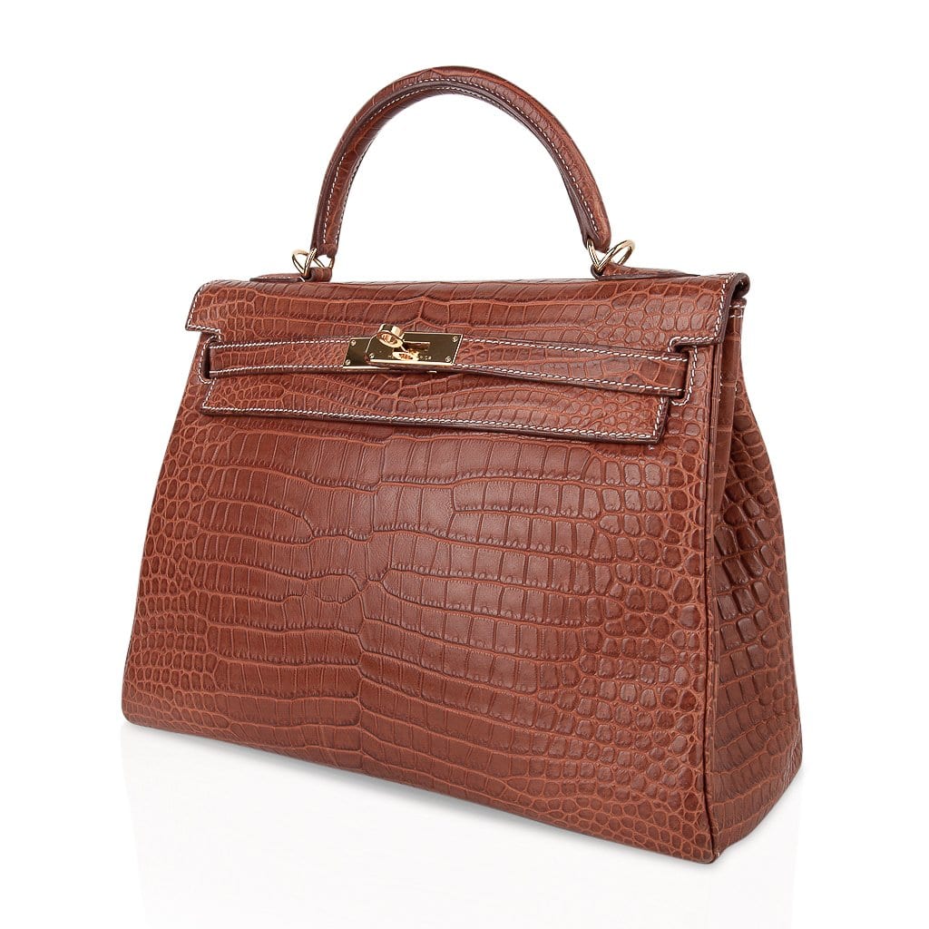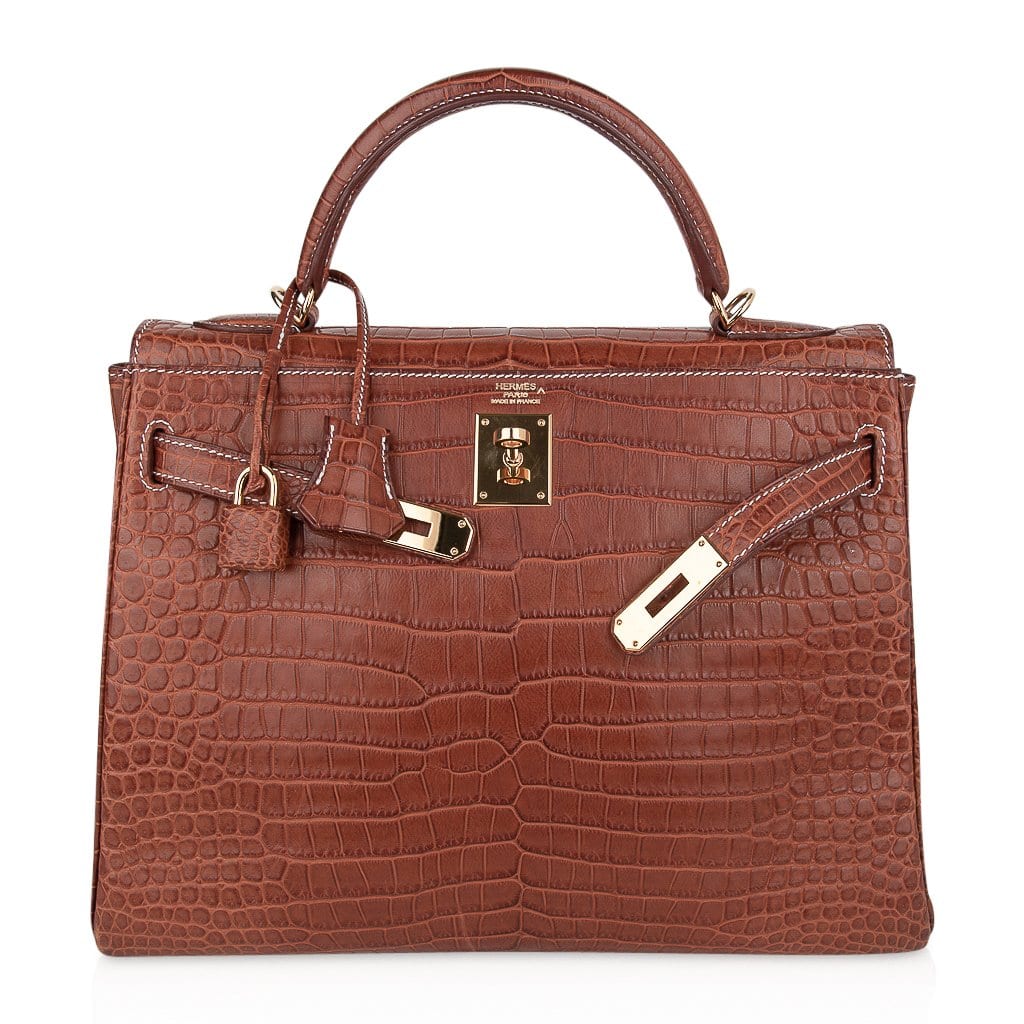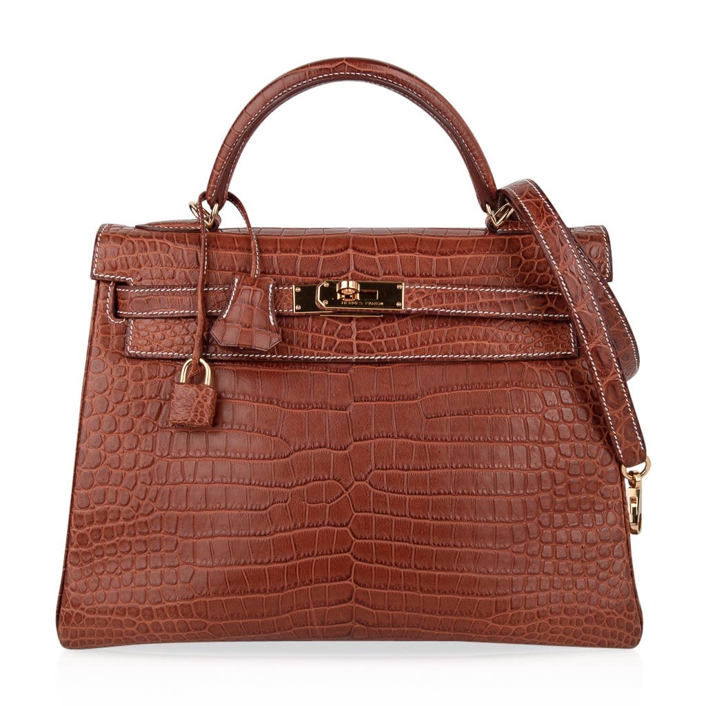 Guaranteed authentic very rare Hermes 32 Kelly bag featured in coveted matte Fauve Barenia Porosus crocodile.