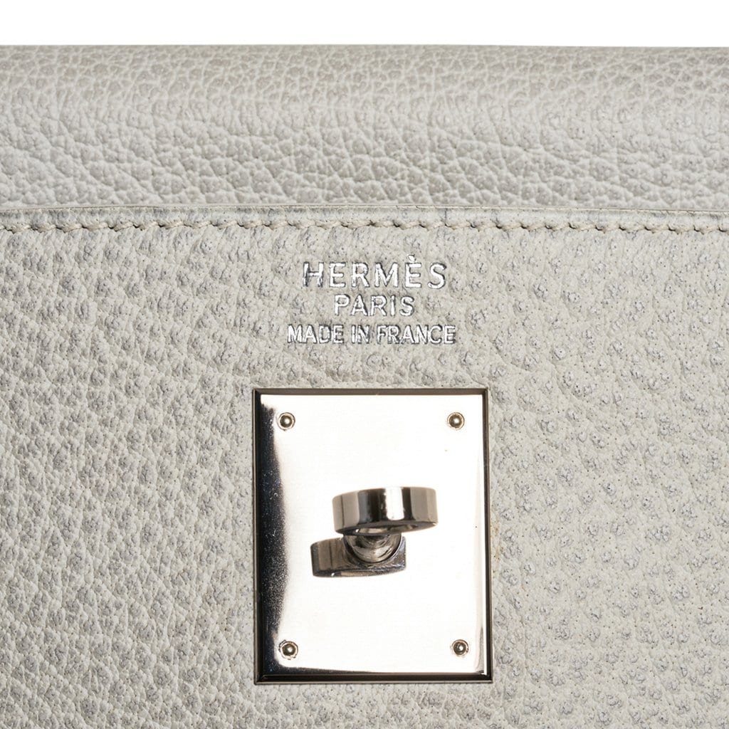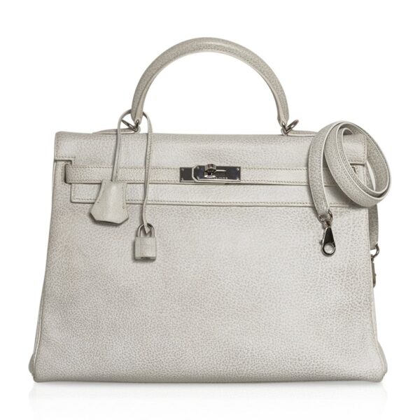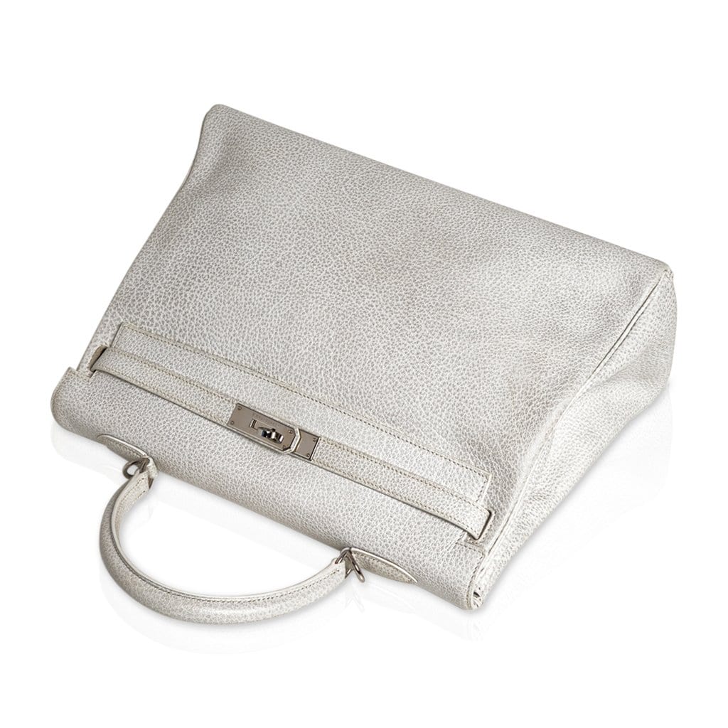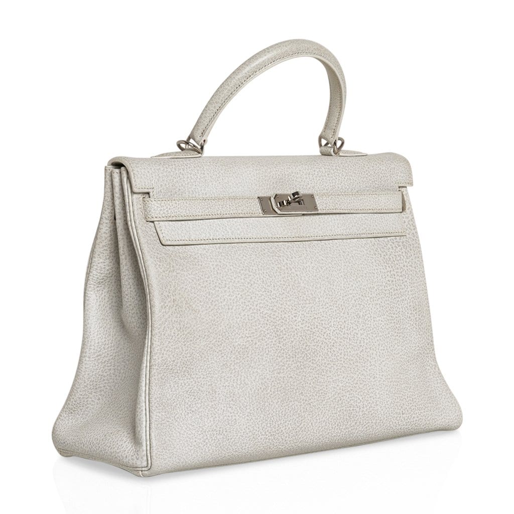 Guaranteed authentic Hermes Kelly Retourne 35 rare Gris Perle and White Dalmation featured in Buffalo Skipper leather.