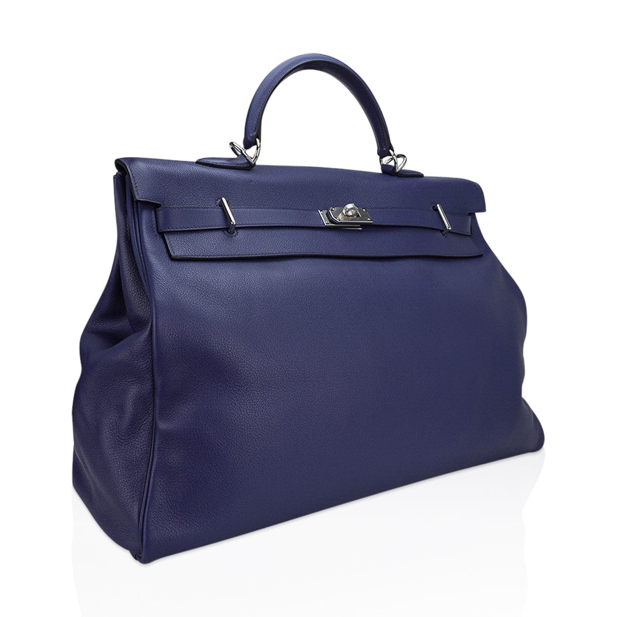 Guaranteed authentic limited edition Hermes Kelly 50 Voyage Relax bag featured in Blue de Malte.