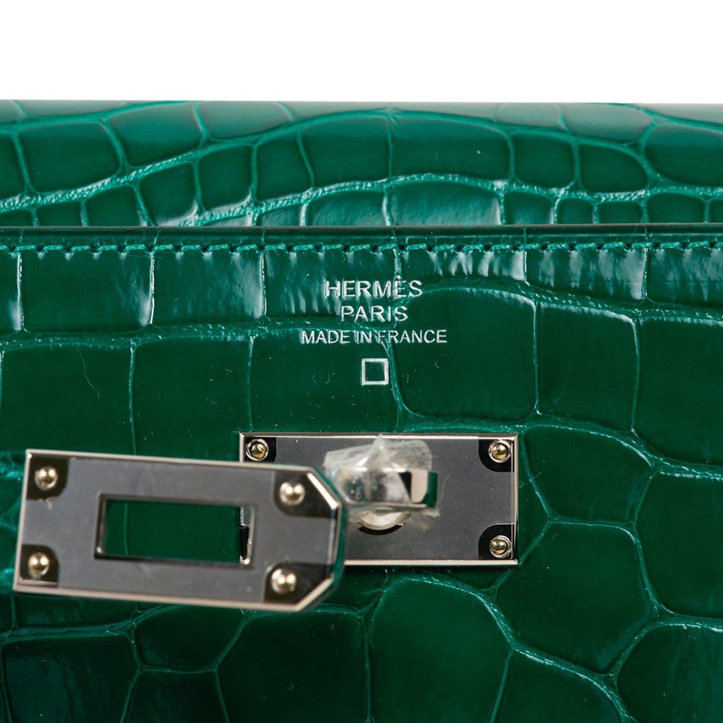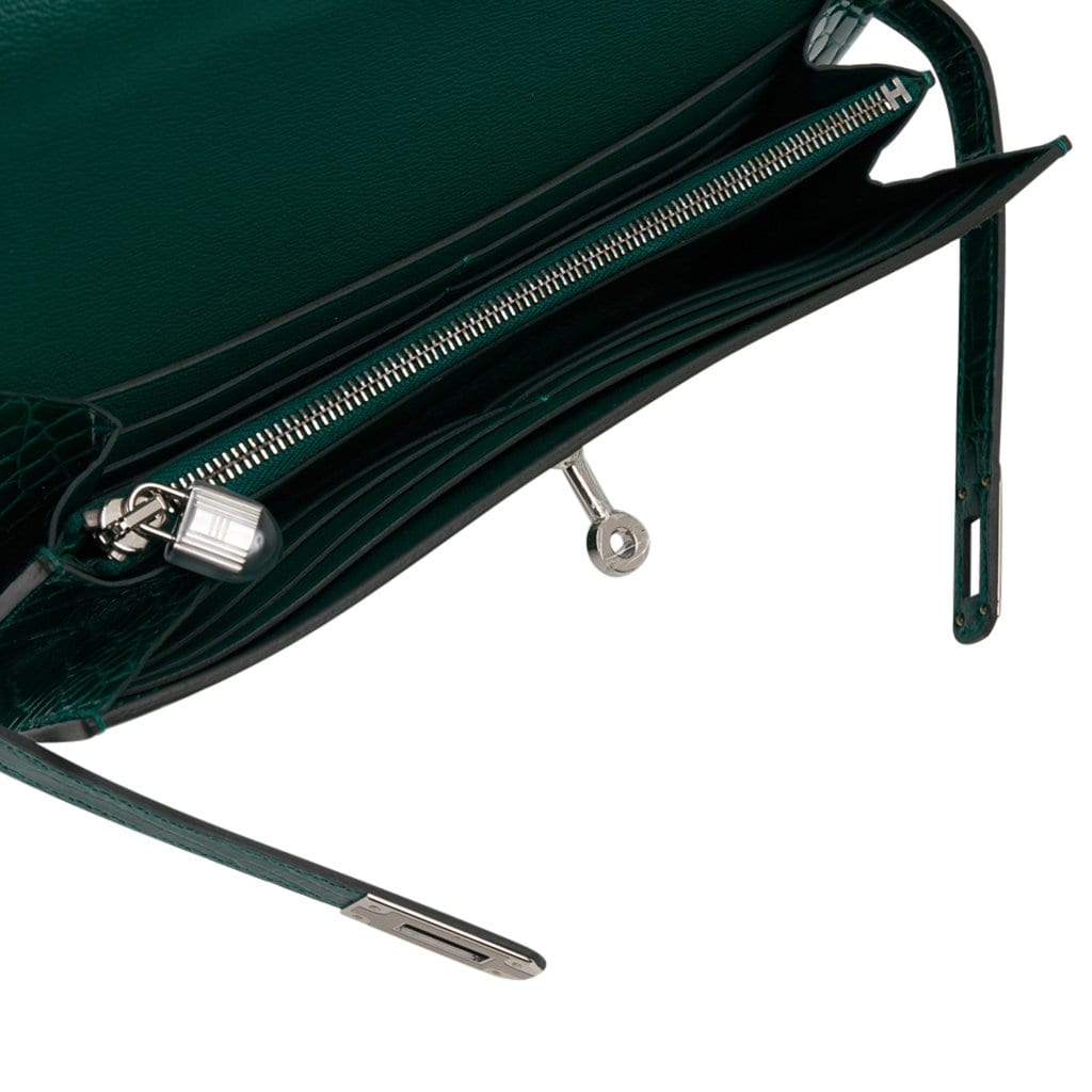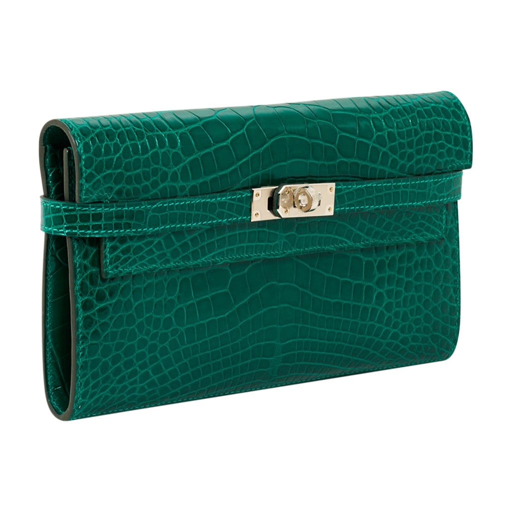 Guaranteed authentic Hermes Kelly Classic Long (Longue) wallet featured in rare Emerald Vert Emeraude) matte Alligator