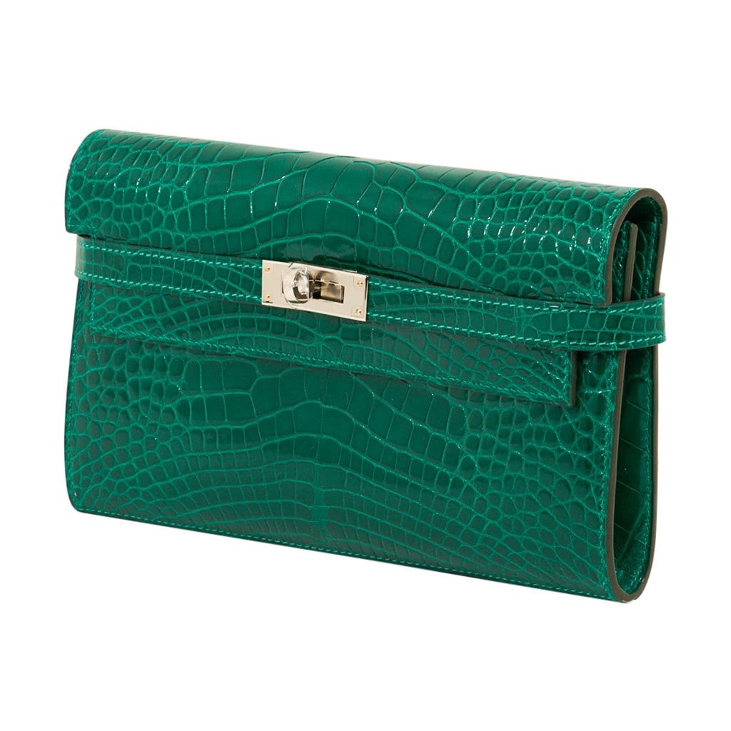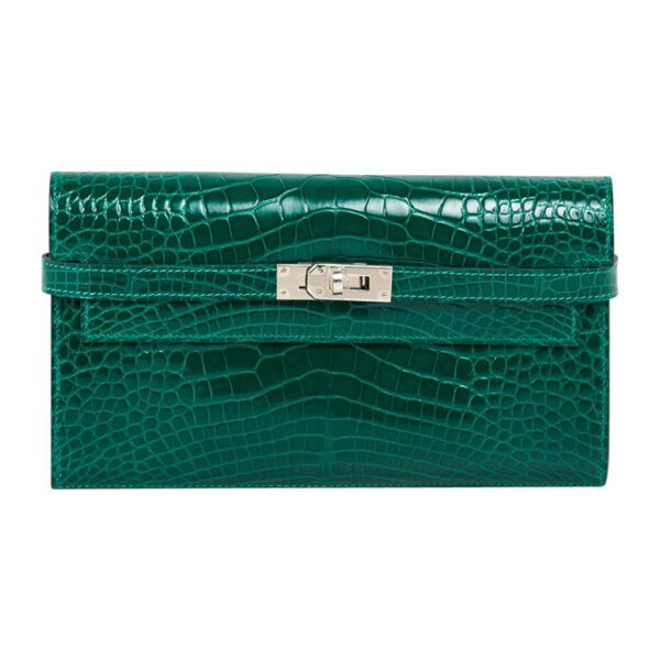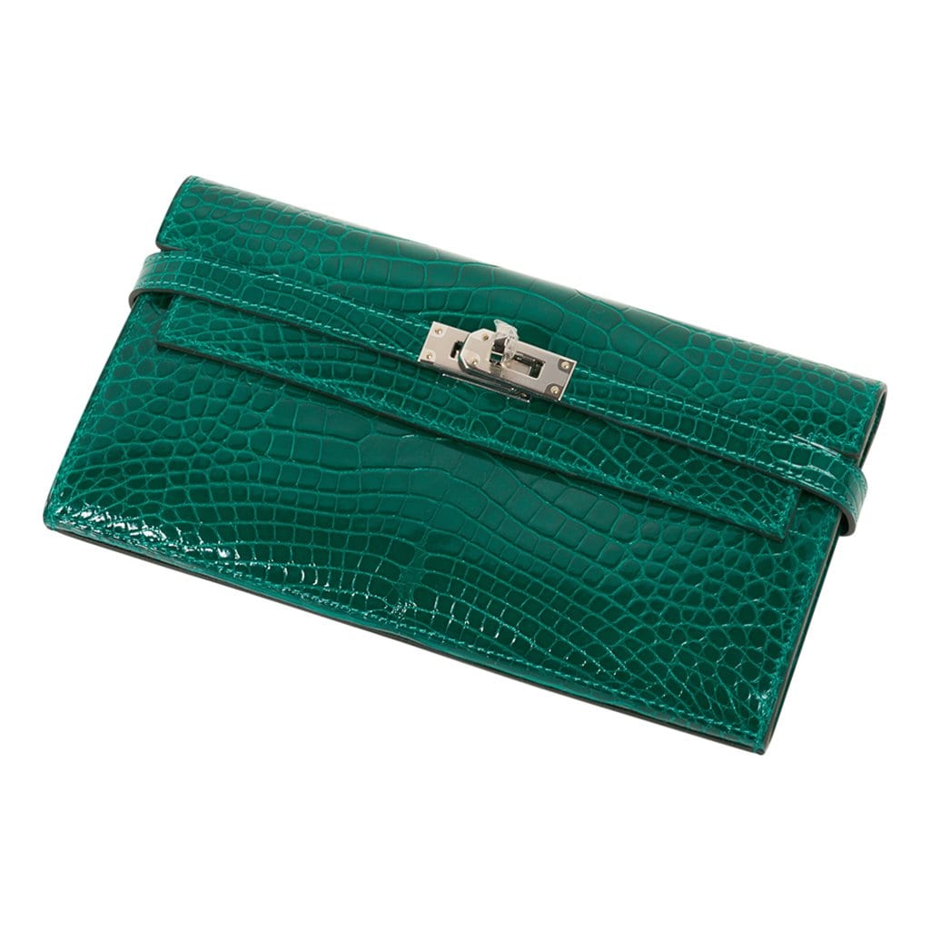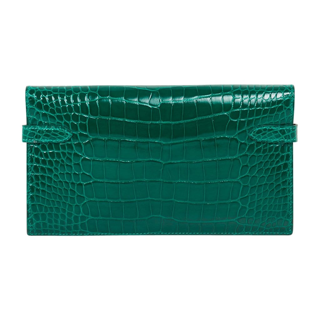 Guaranteed authentic Hermes Kelly Classic Long (Longue) wallet featured in rare Emerald Vert Emeraude) matte Alligator