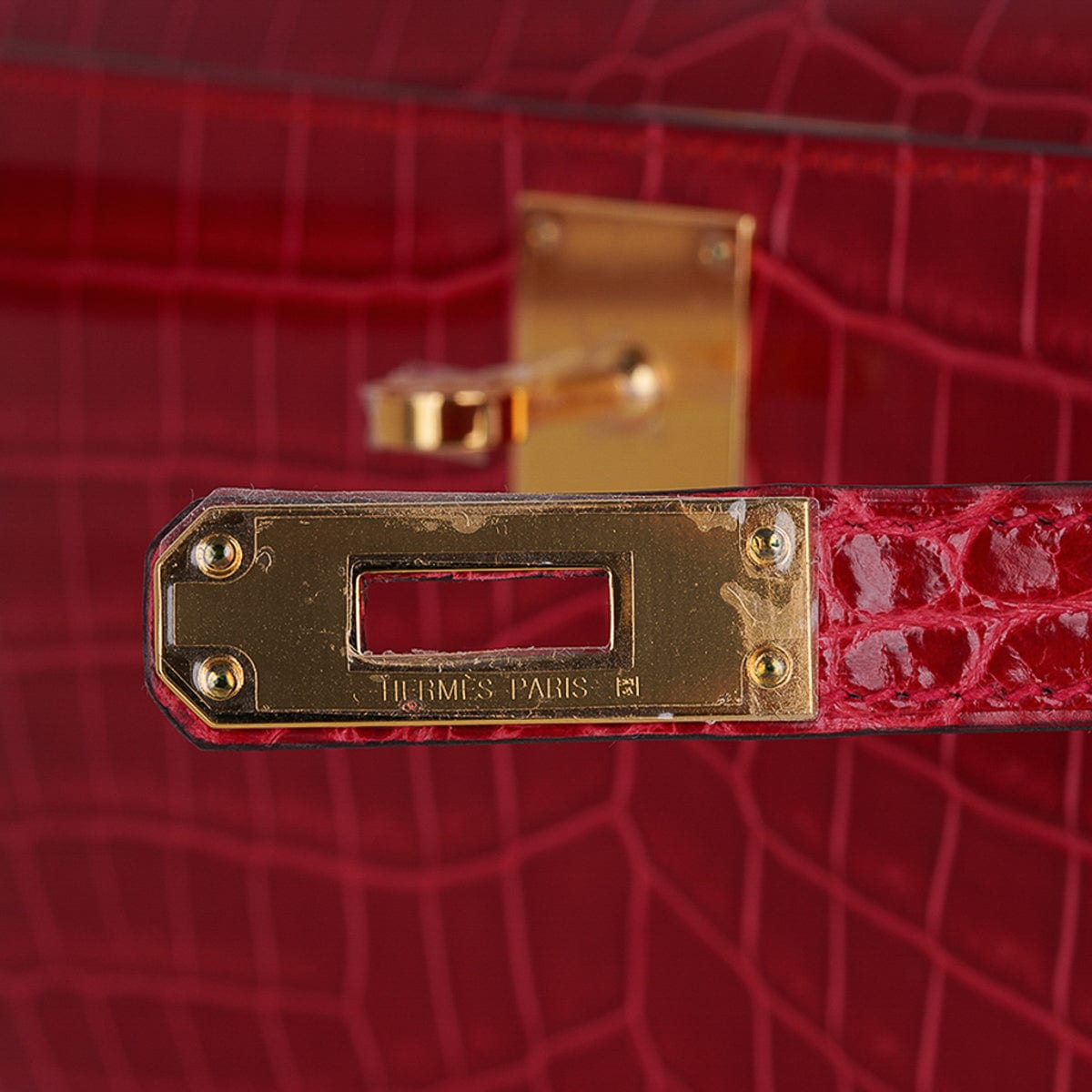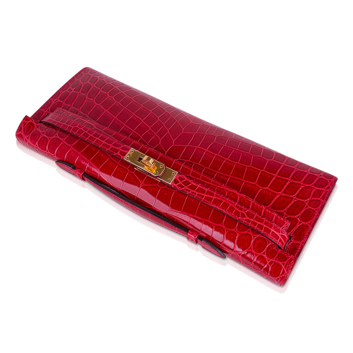 Guaranteed authentic timeless Hermes Kelly Cut bag featured in vivid Braise Niloticus Crocodile.