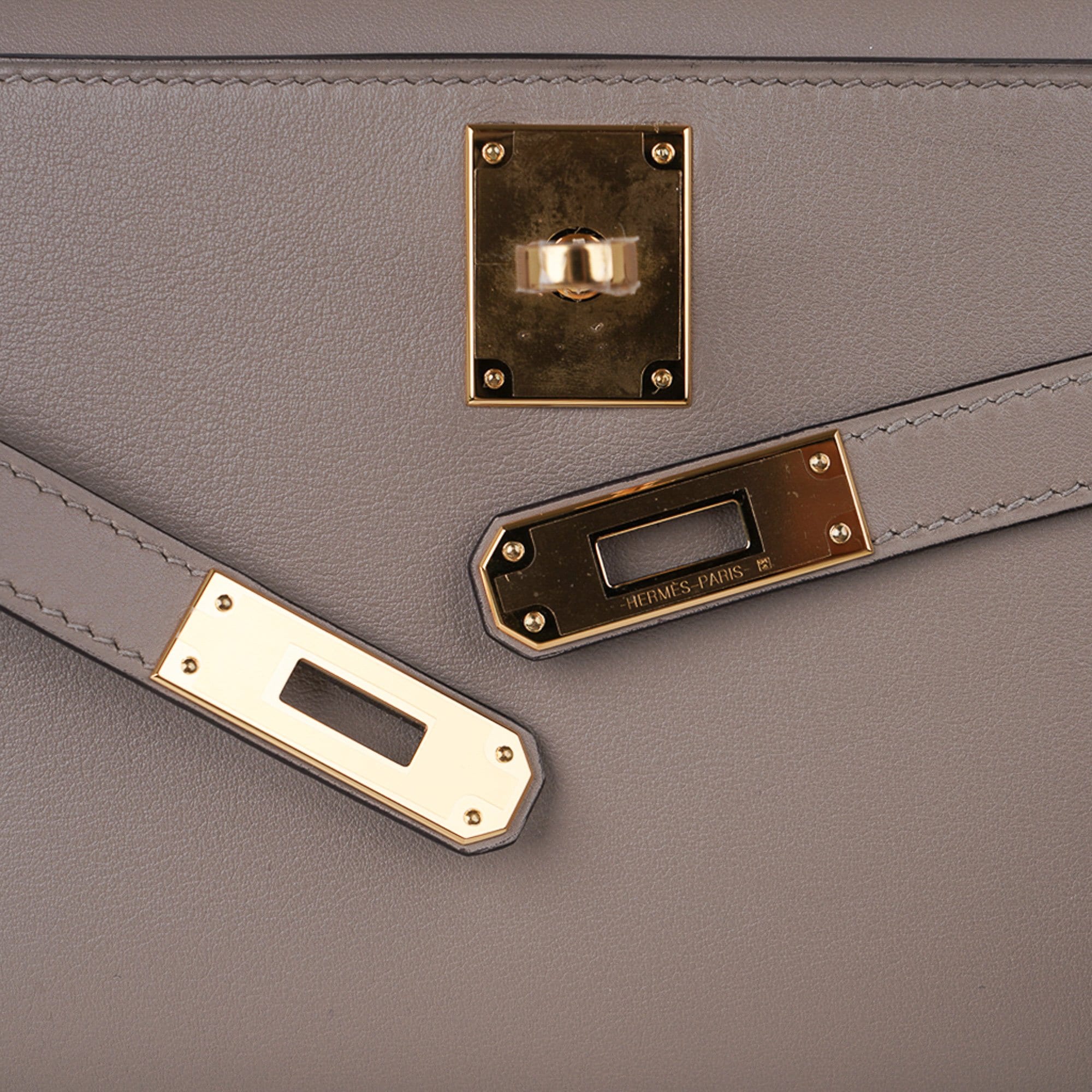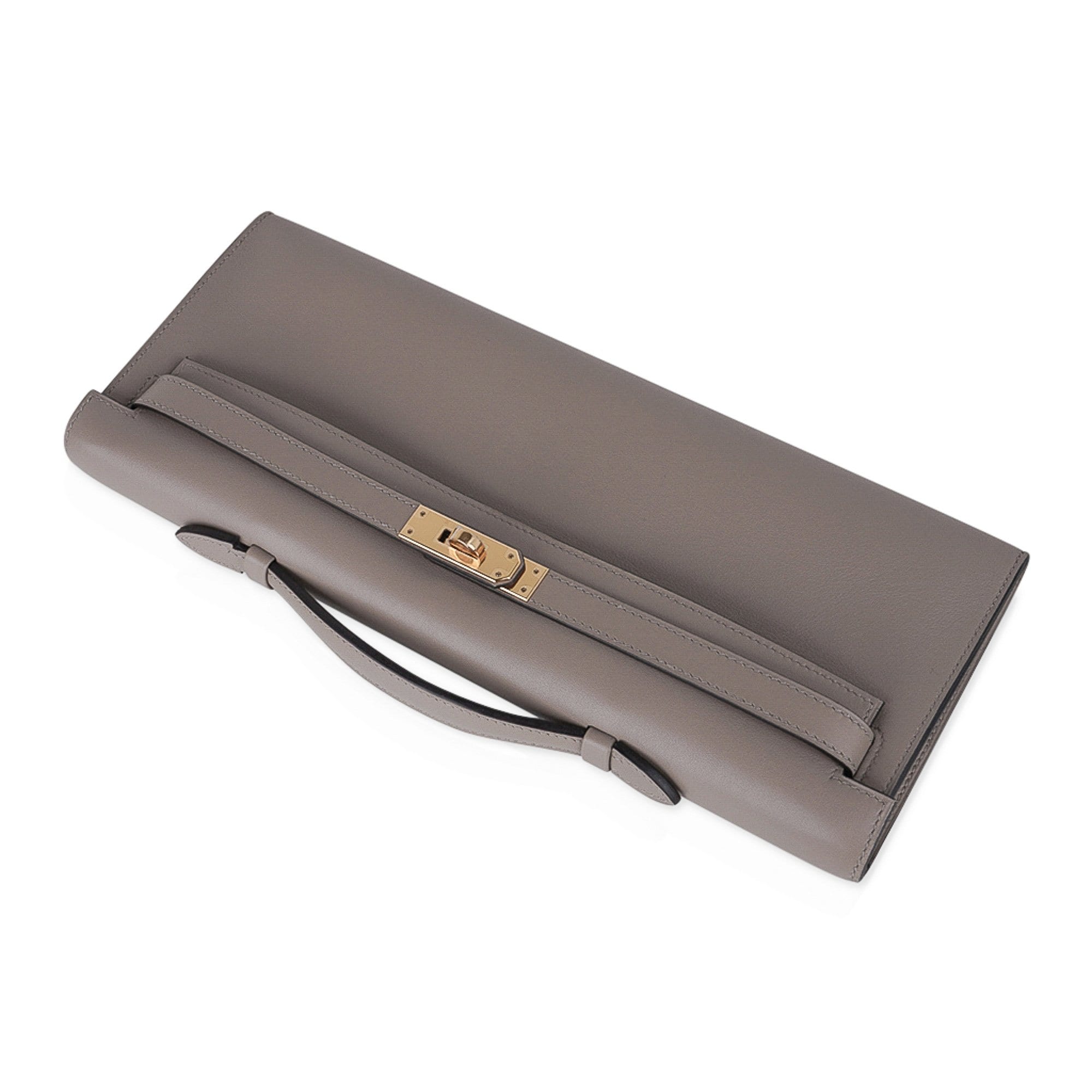 Sophisticated Hermes Kelly grey clutch in Swift leather with rich gold hardware – the perfect day to evening bag!