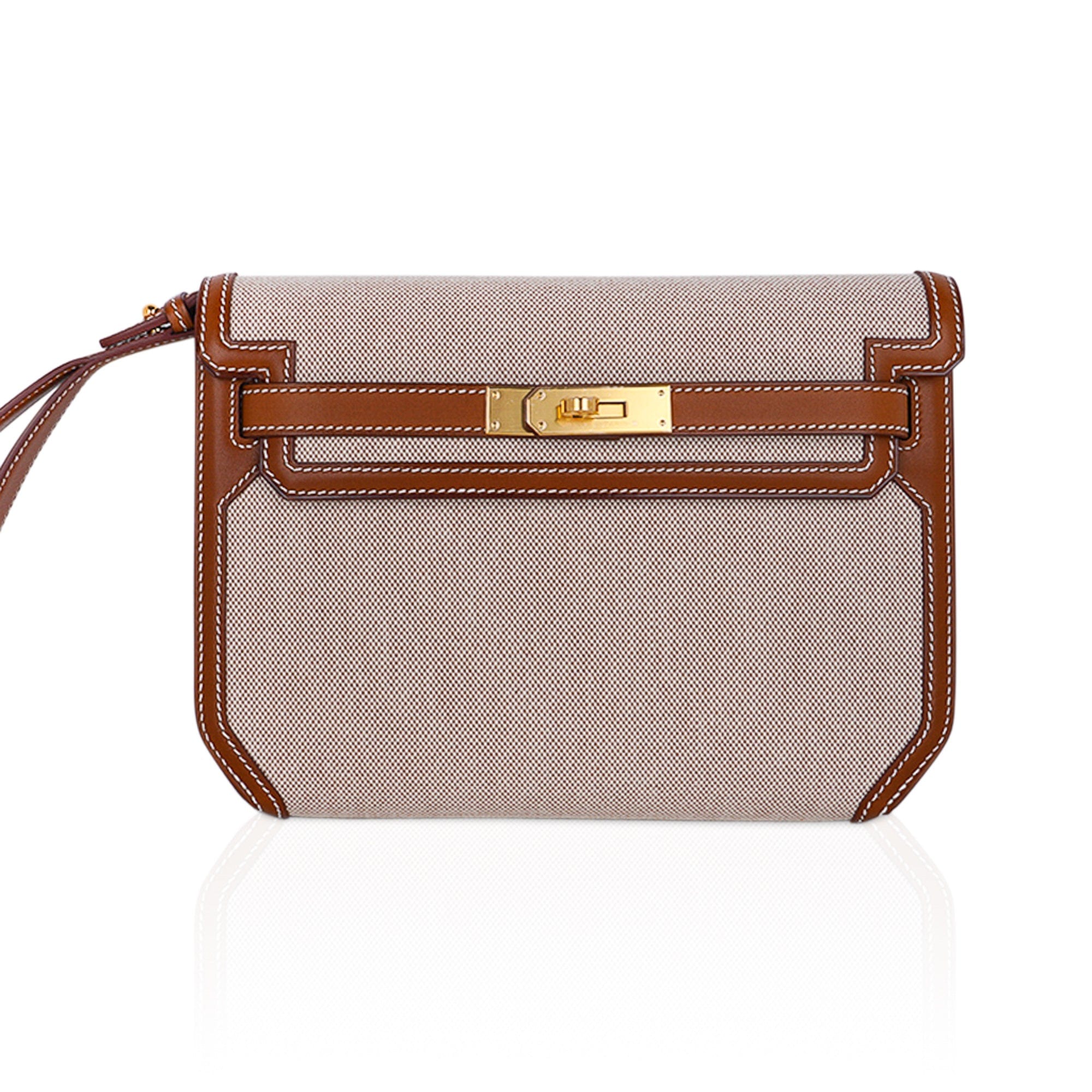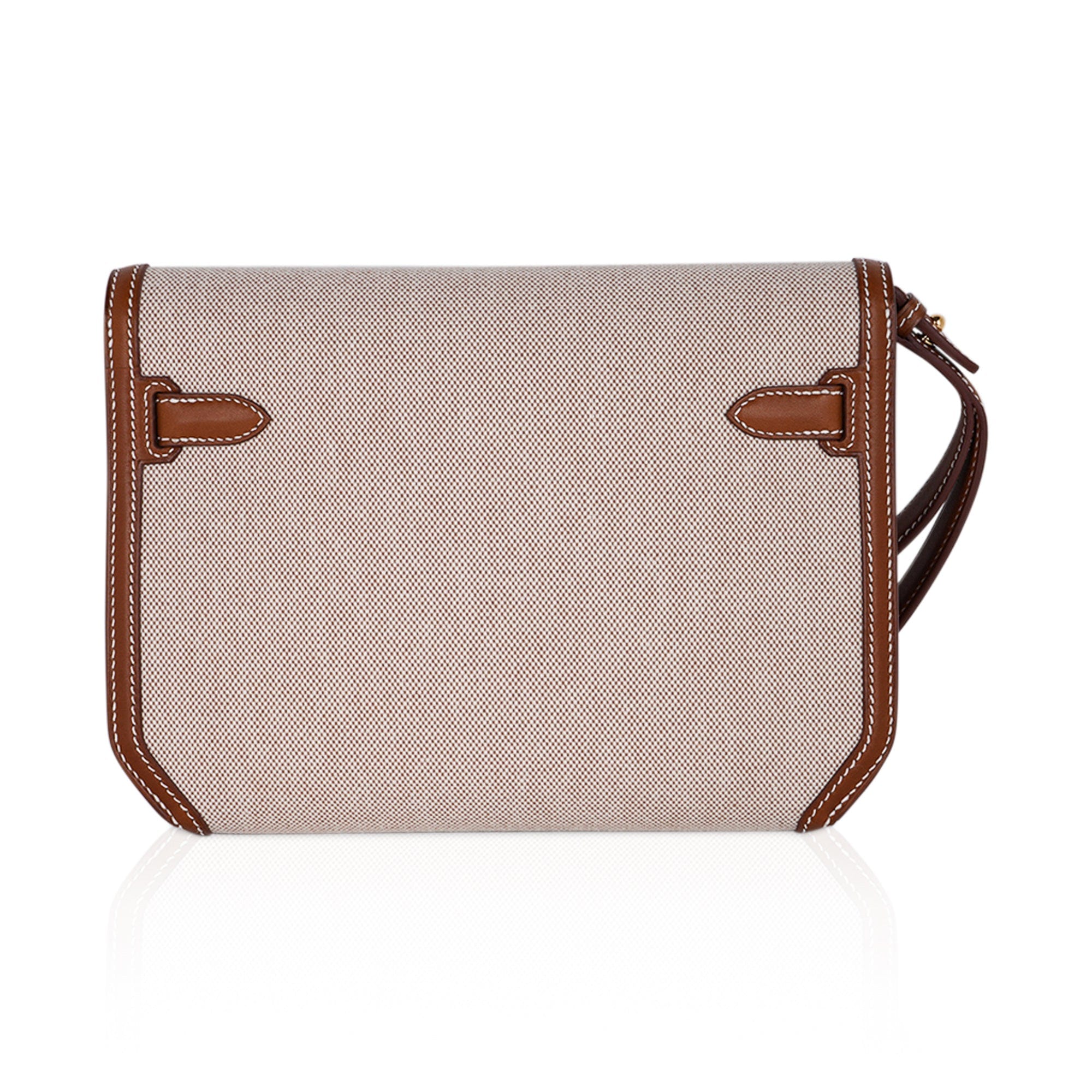 Guaranteed authentic Hermes Kelly Depeches 25 Pouch featured in Toile and Fauve Barenia.