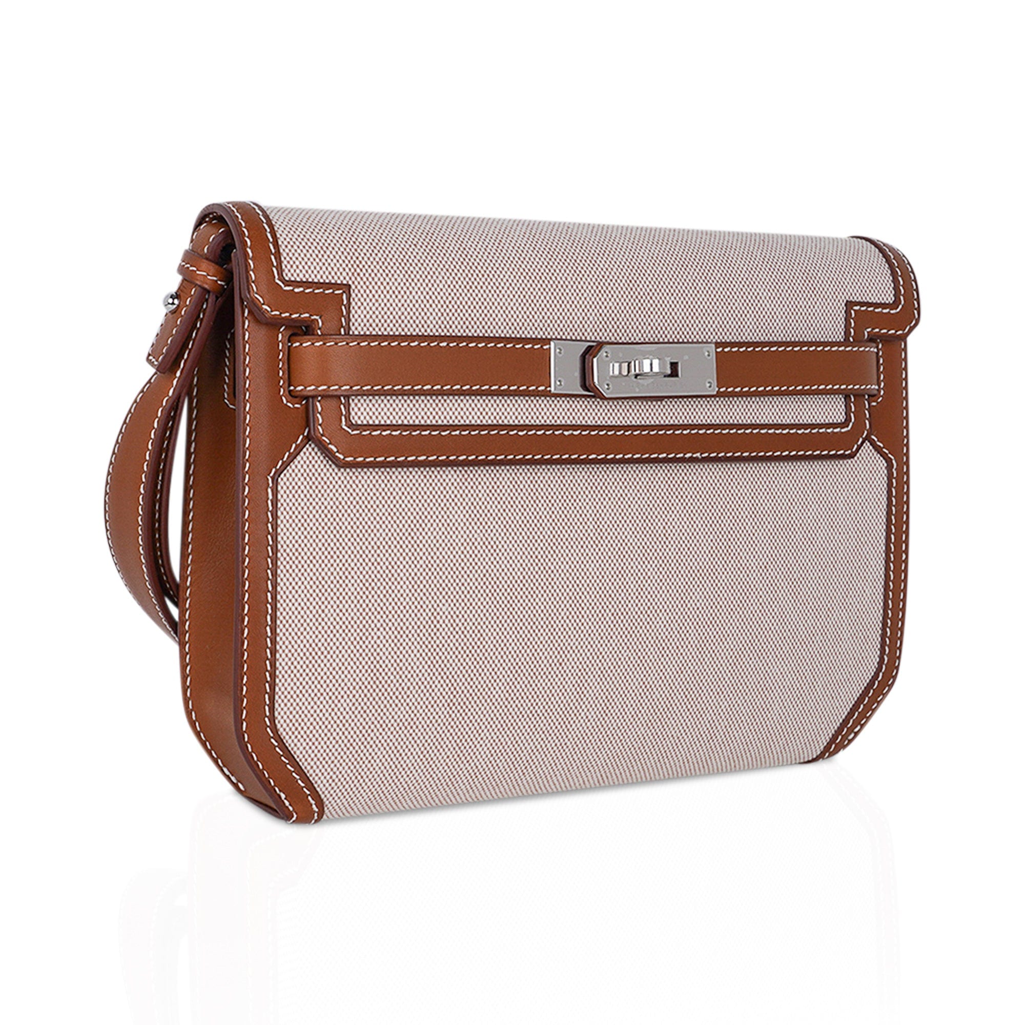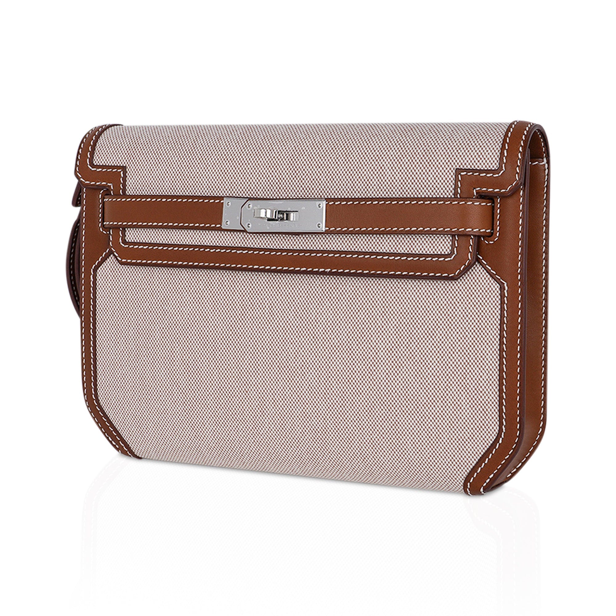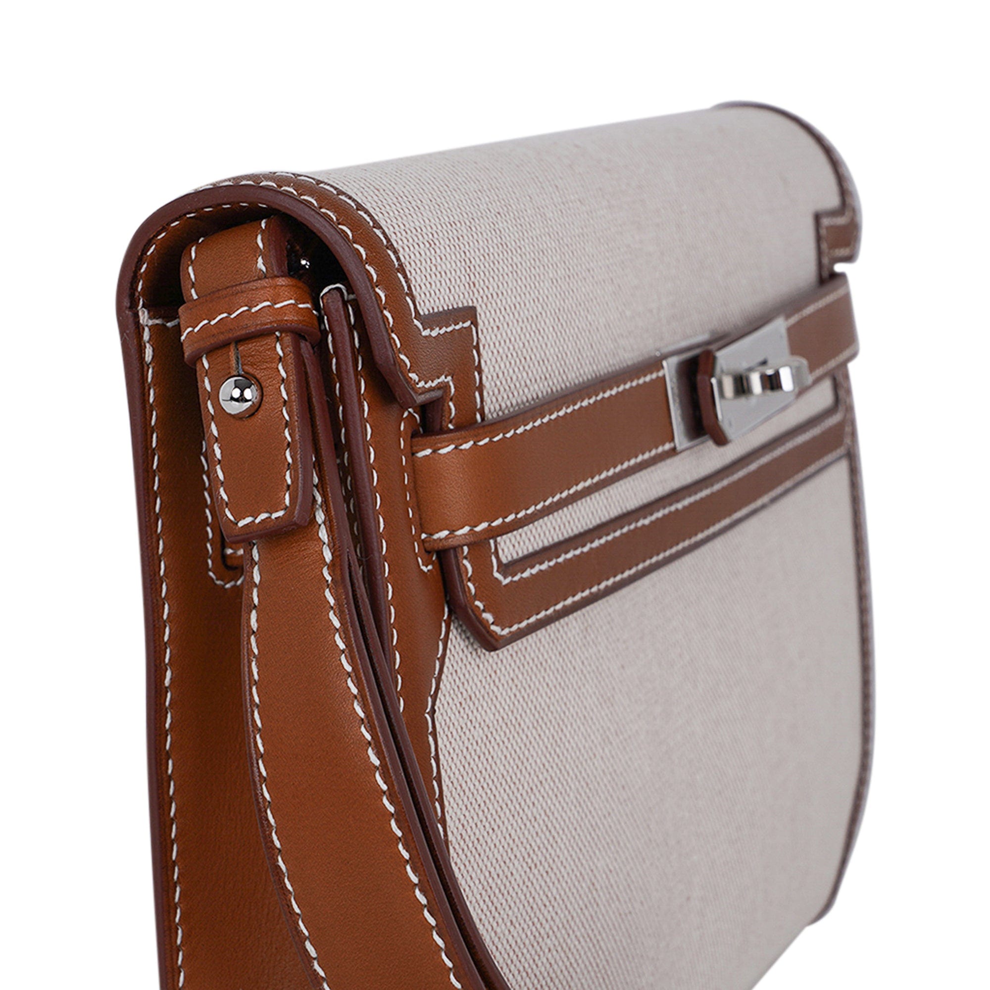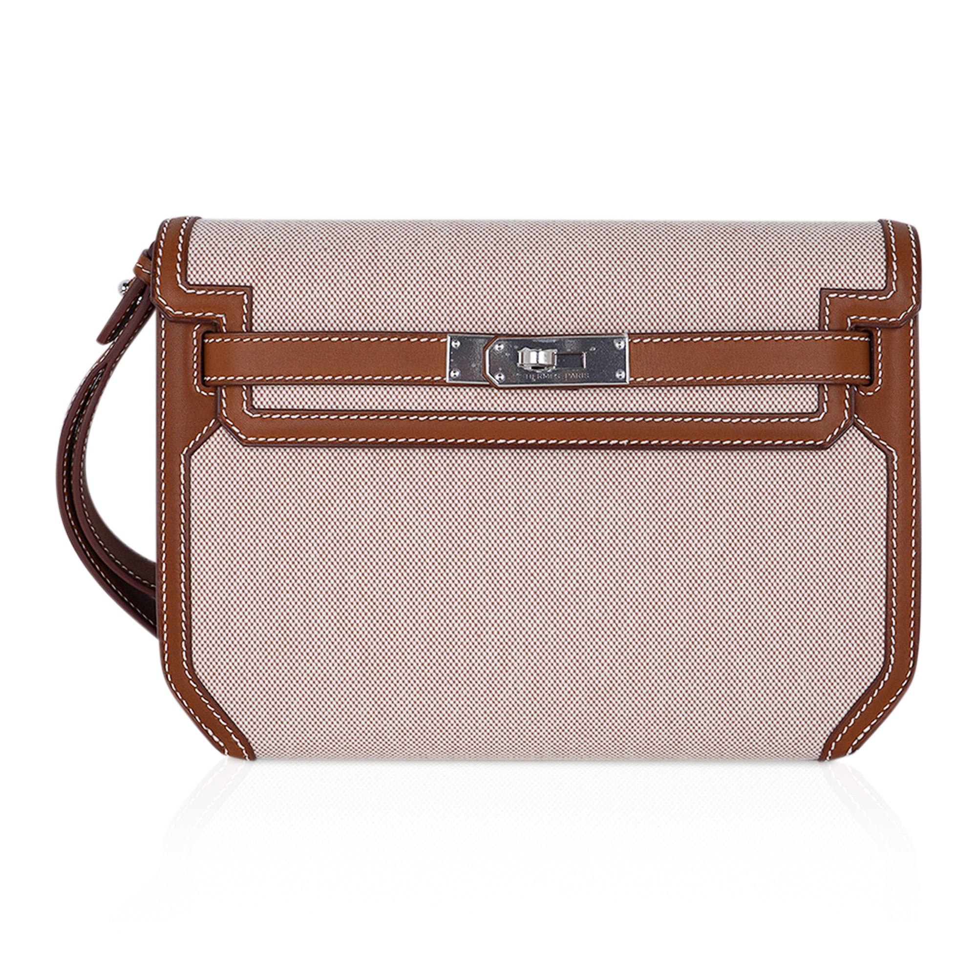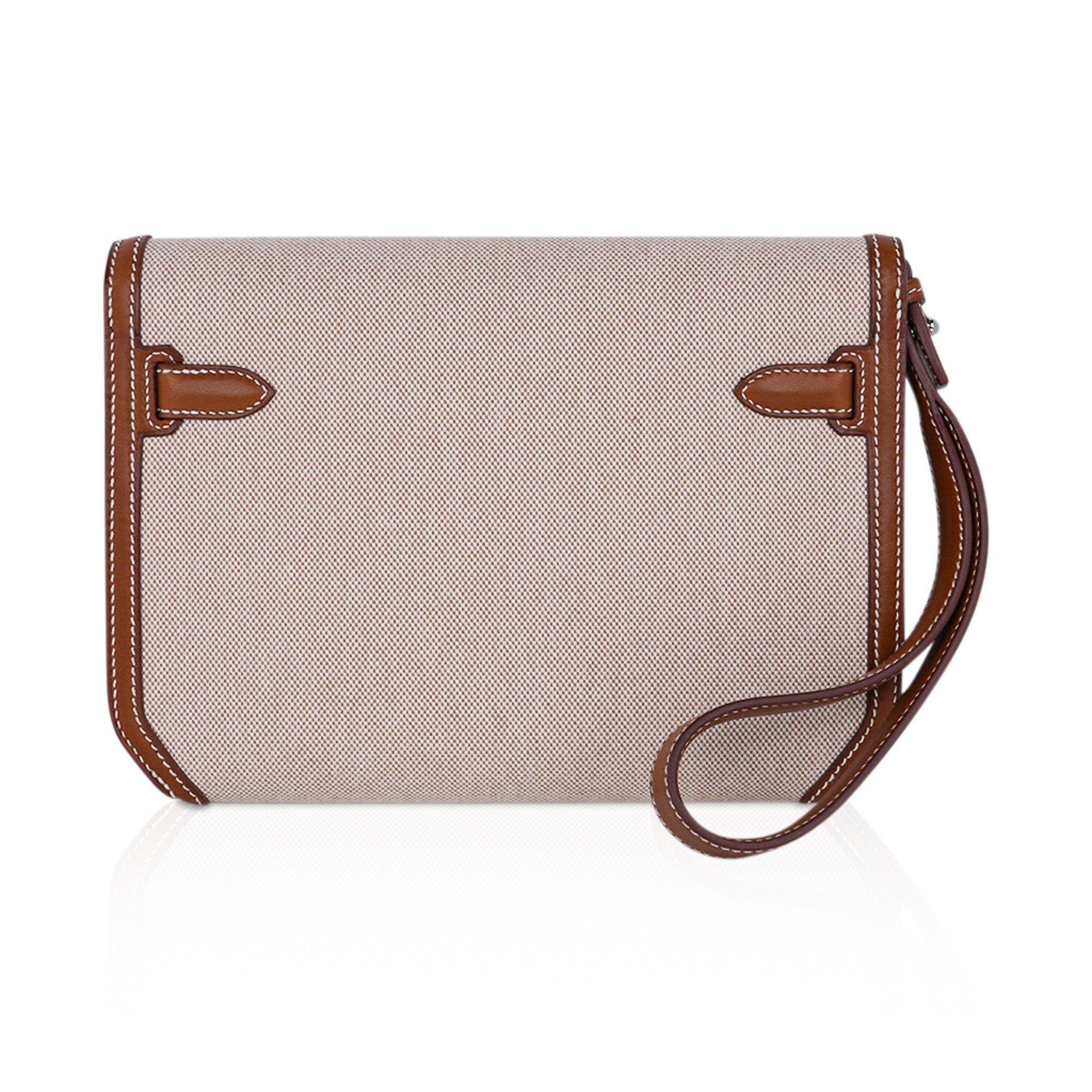 Guaranteed authentic Hermes Kelly Depeches 25 Pouch featured in Toile and Fauve Barenia.