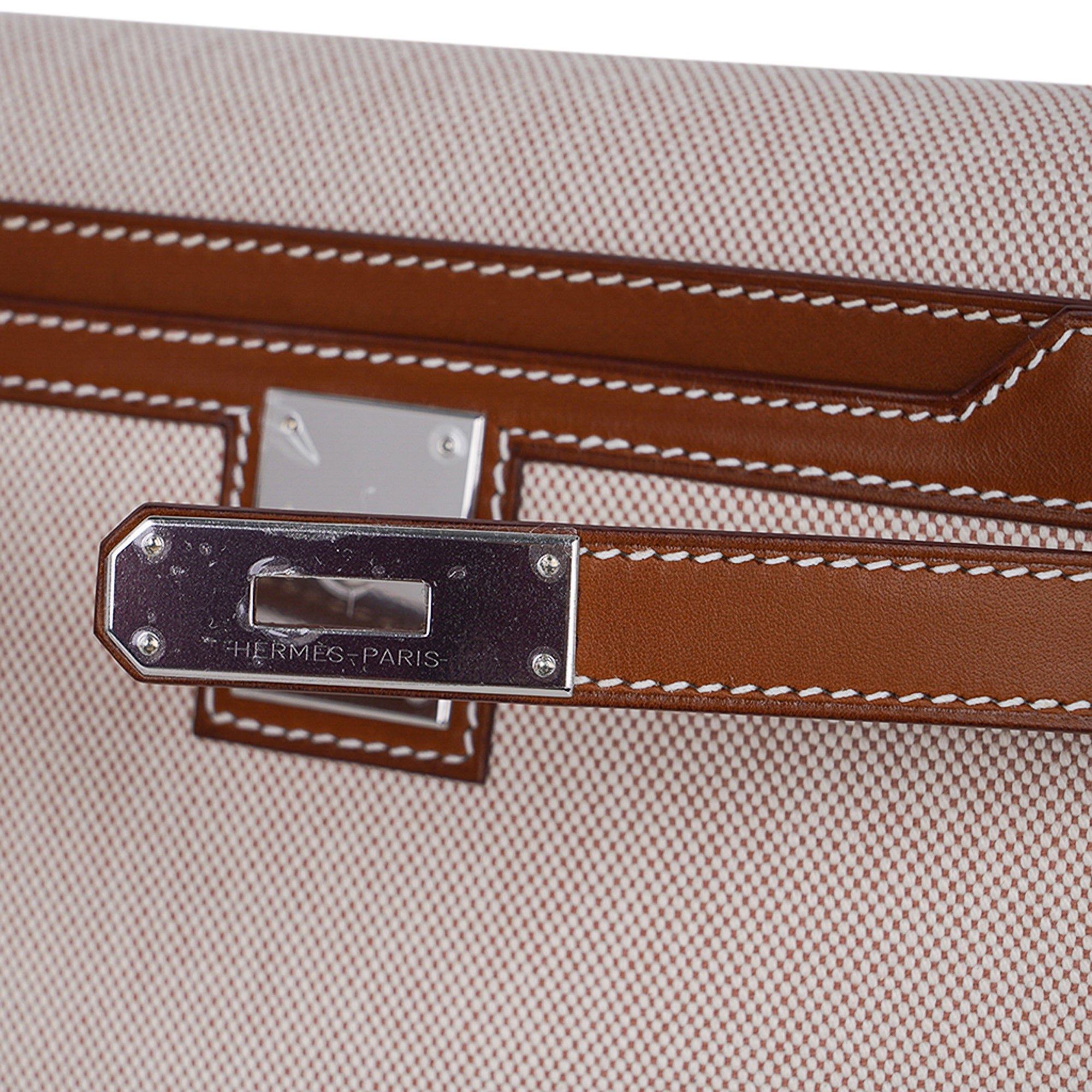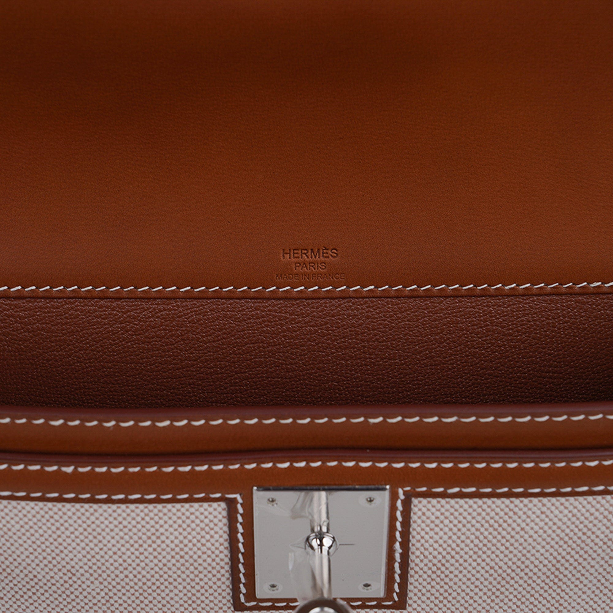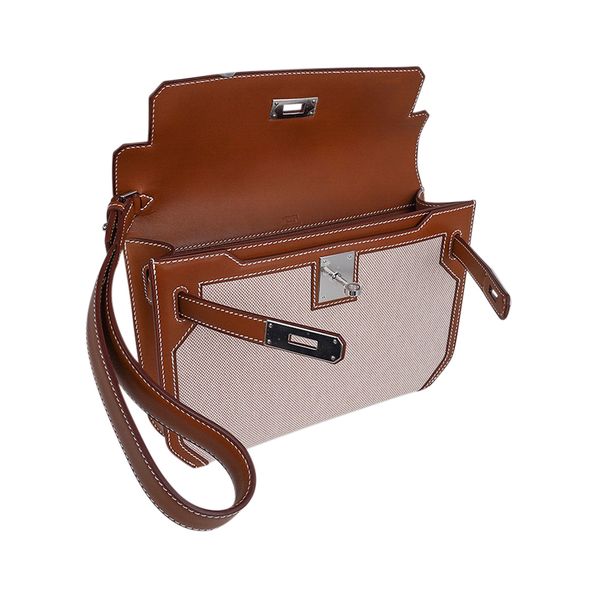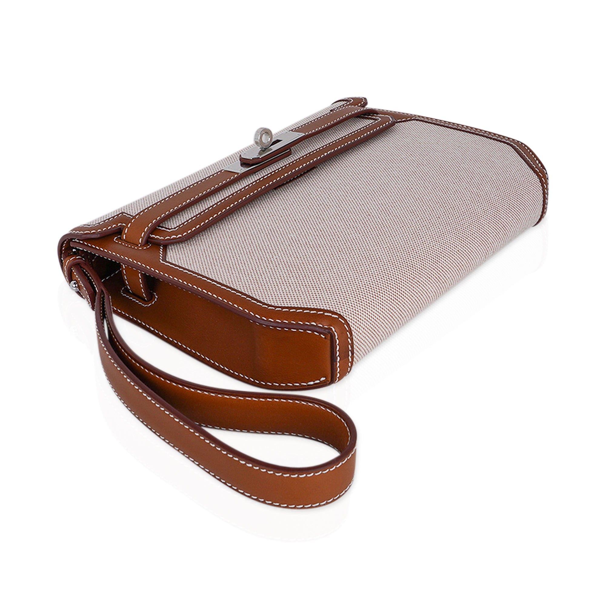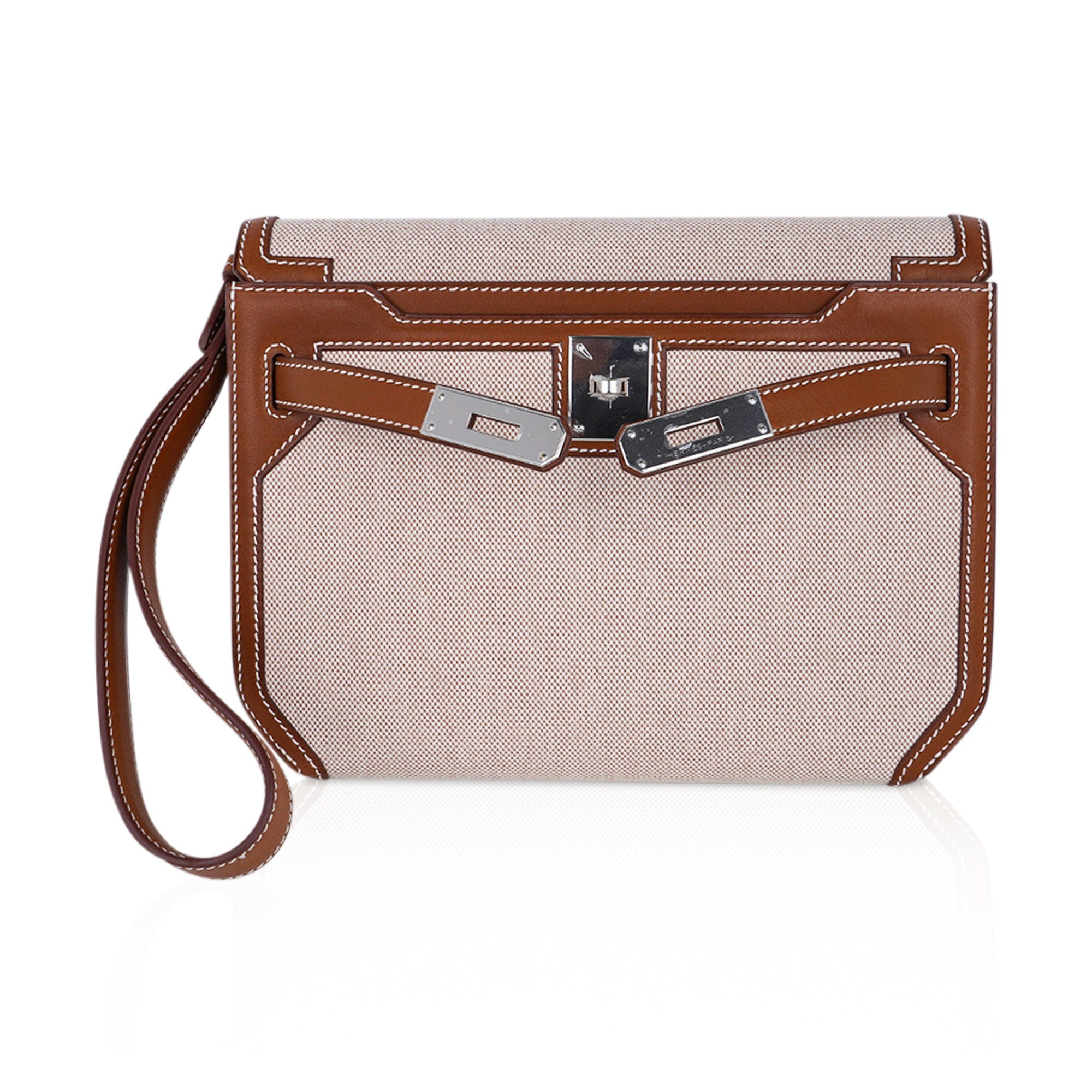 Guaranteed authentic Hermes Kelly Depeches 25 Pouch featured in Toile and Fauve Barenia.