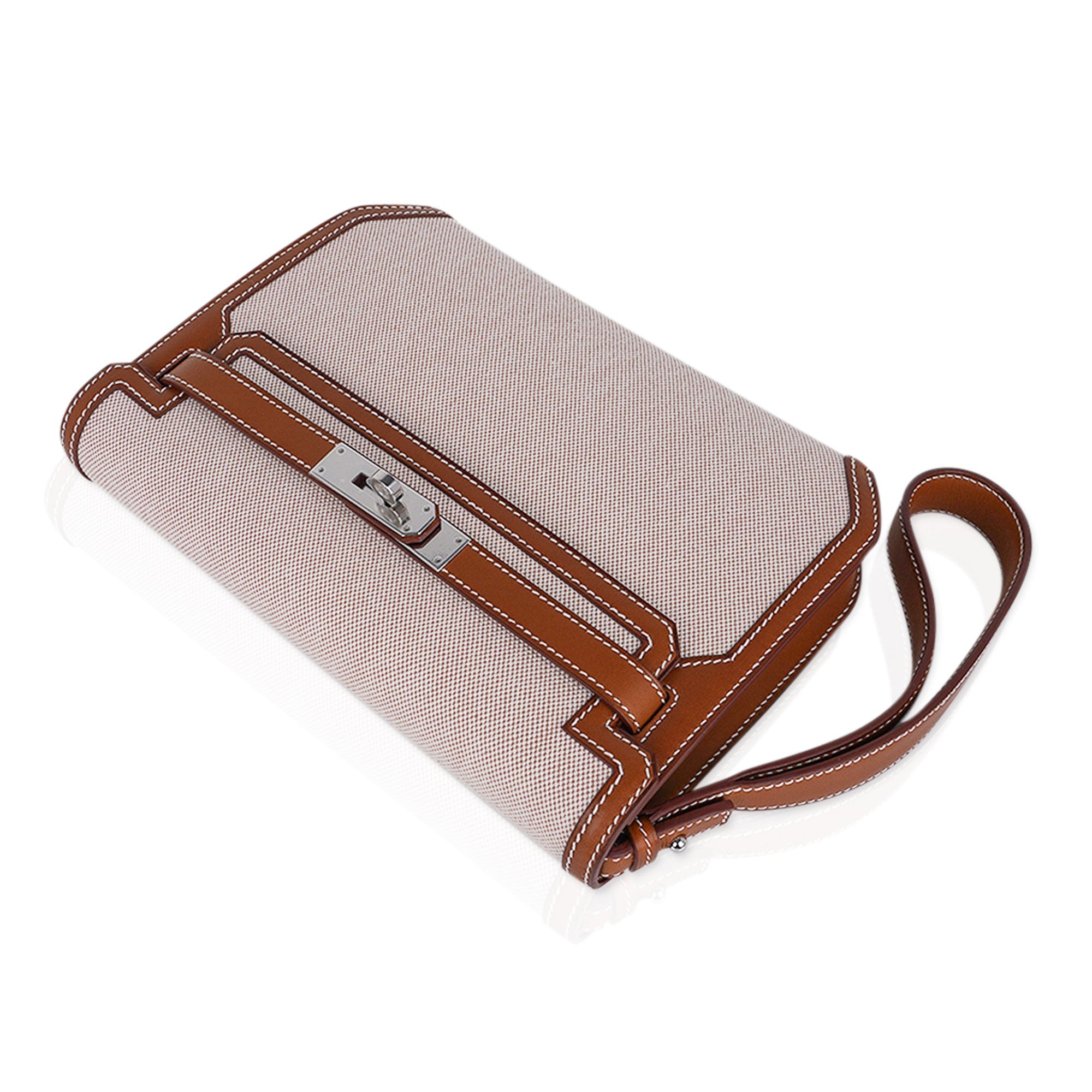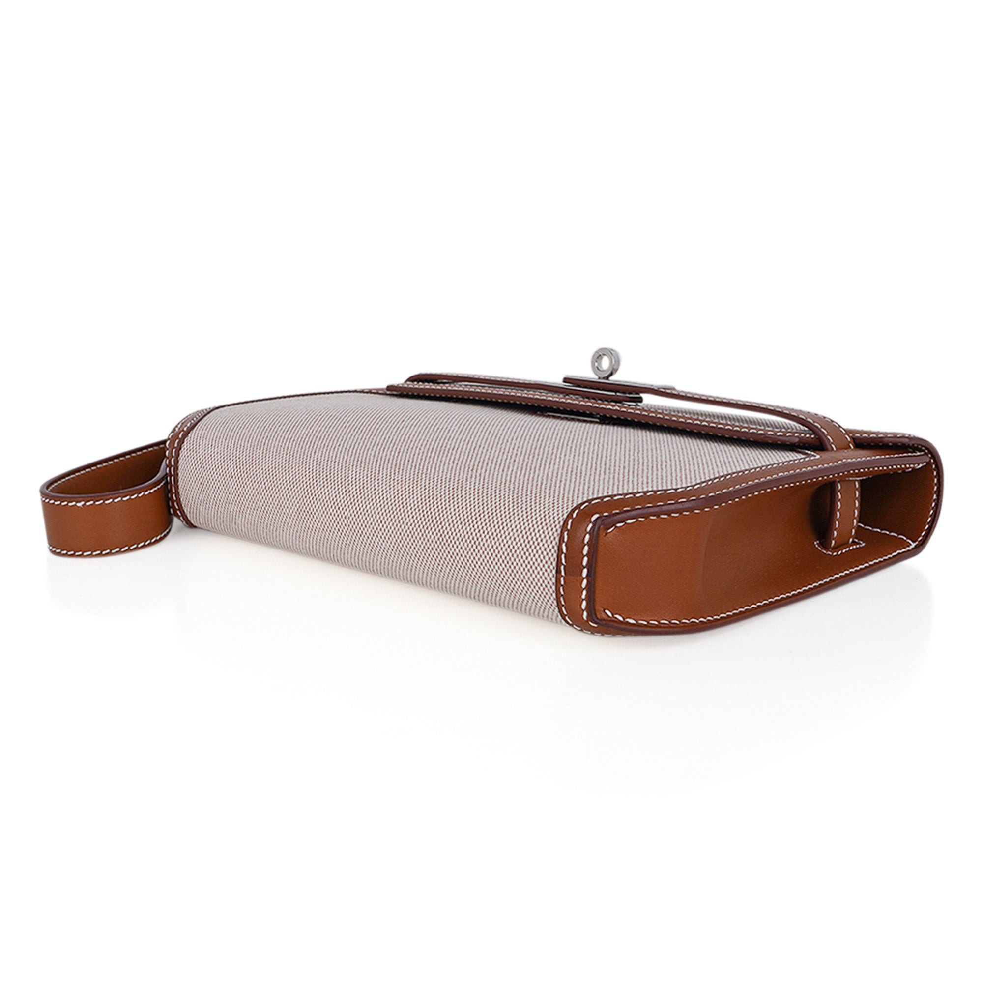 Guaranteed authentic Hermes Kelly Depeches 25 Pouch featured in Toile and Fauve Barenia.