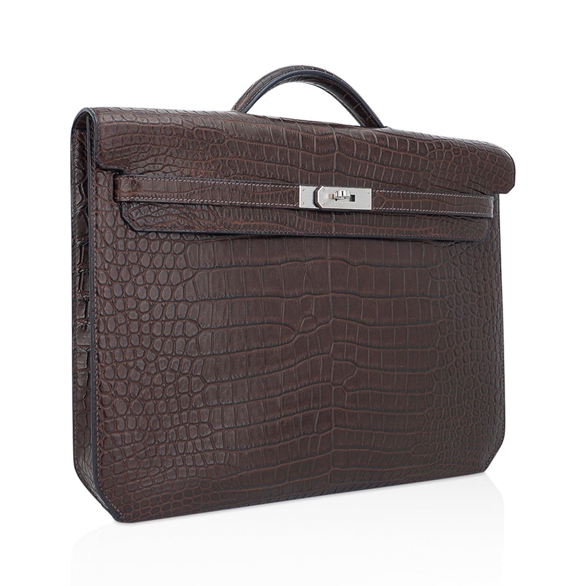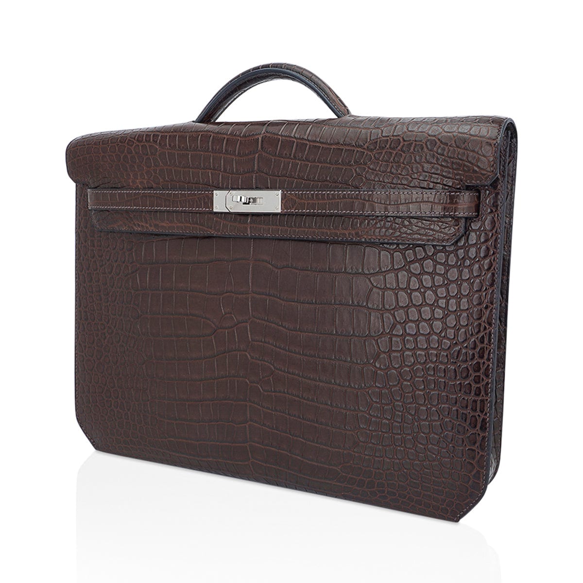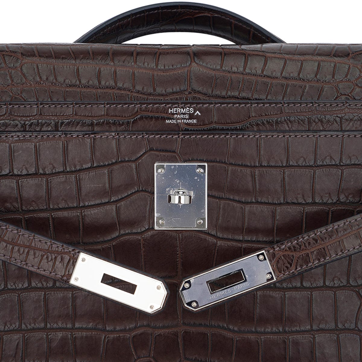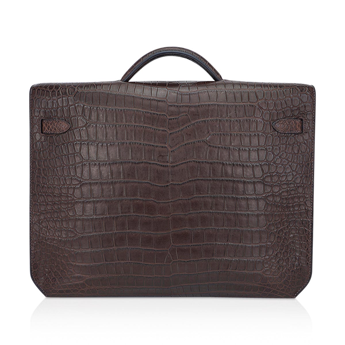 Guaranteed authentic Hermes coveted Kelly Depeches 36 briefcase featured in Matte Havane Porosus Crocodile.