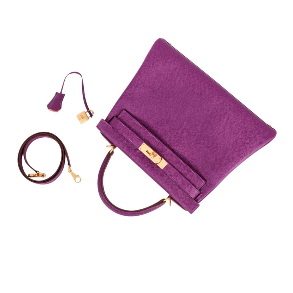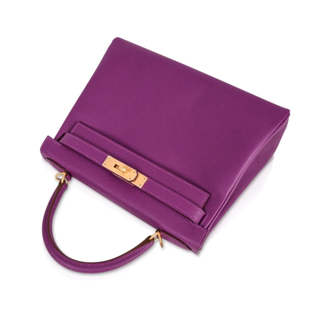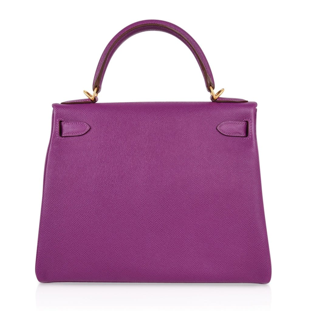 A magnificent Hermes Kelly purple bag in Epsom leather with coveted brushed gold hardware.