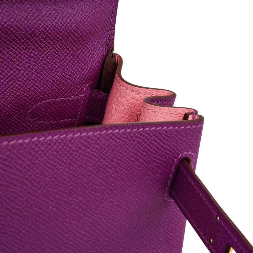 Guaranteed authentic rare Hermes HSS Kelly 28 bag Retourne bag divine in Purple Anemone with Rose Confetti interior.