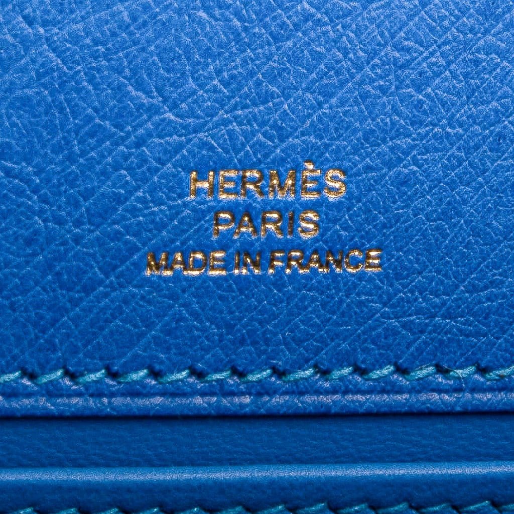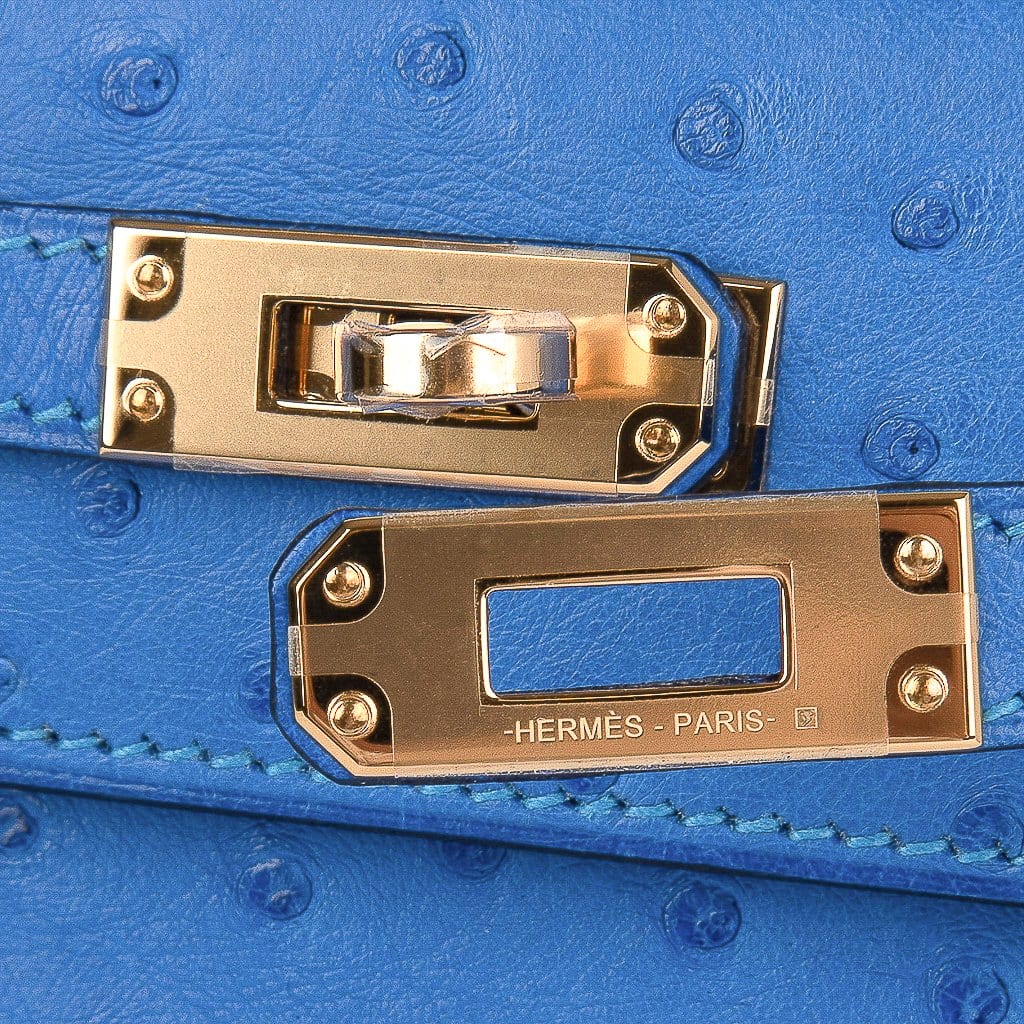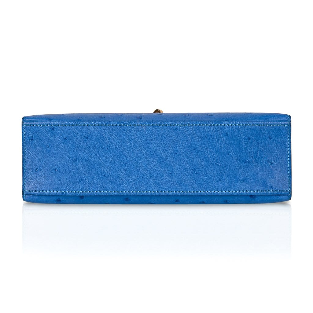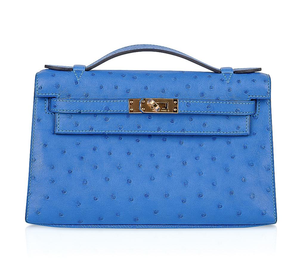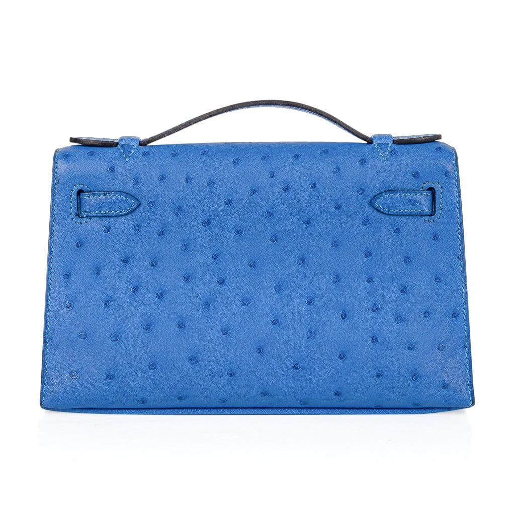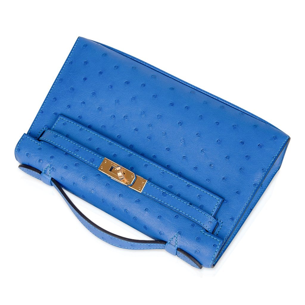 Guaranteed authentic Hermes Kelly Pochette bag features Bleuet Ostrich.