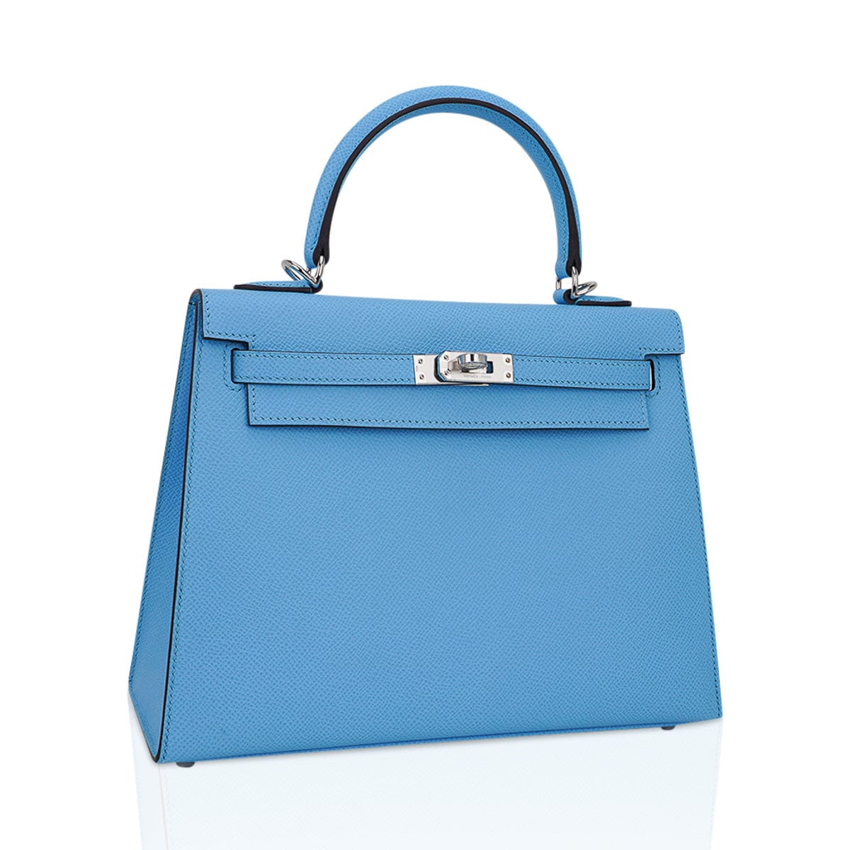Guaranteed authentic exquisite Hermes Kelly 25 Sellier bag featured in soft sky blue Bleu Celeste.