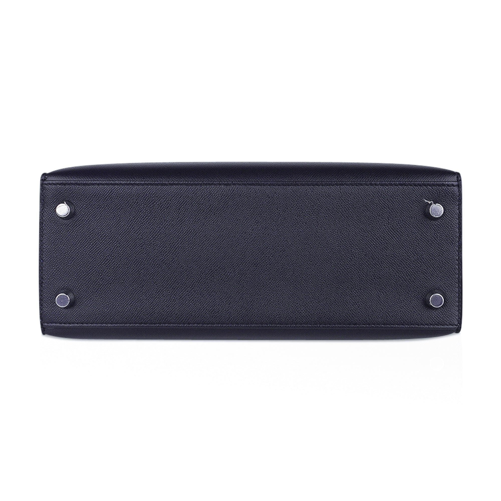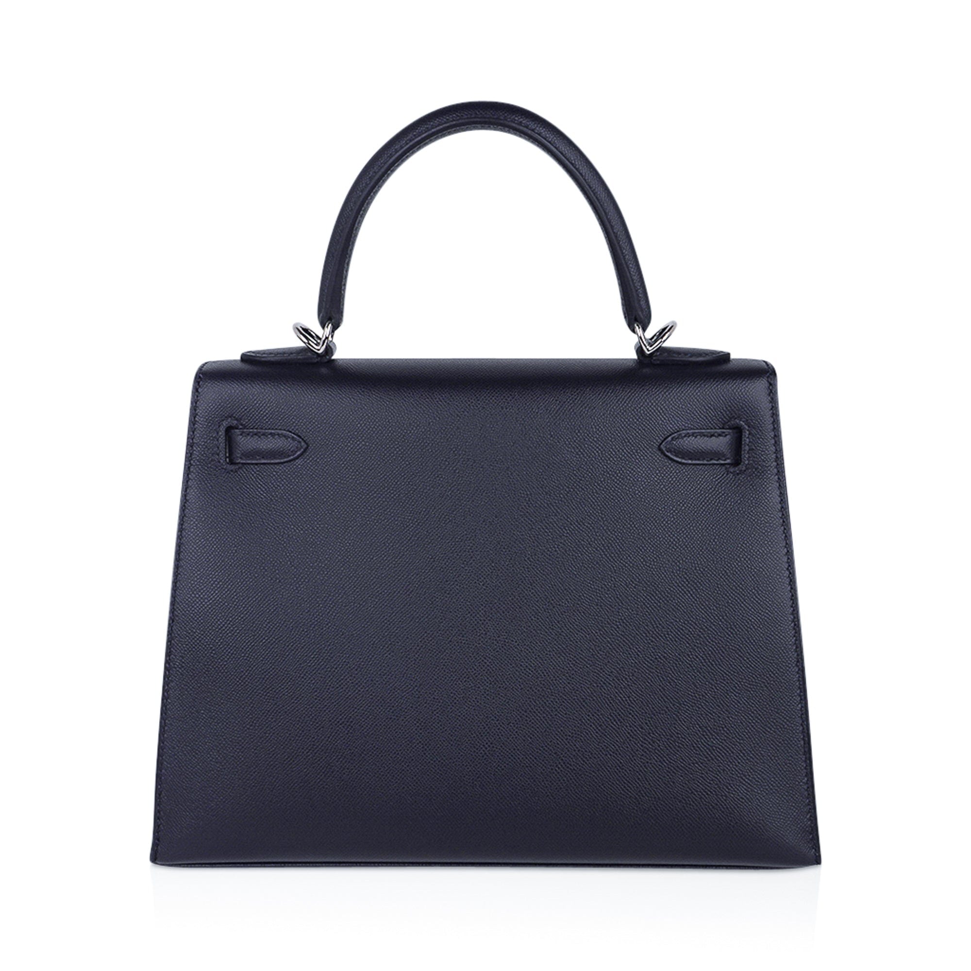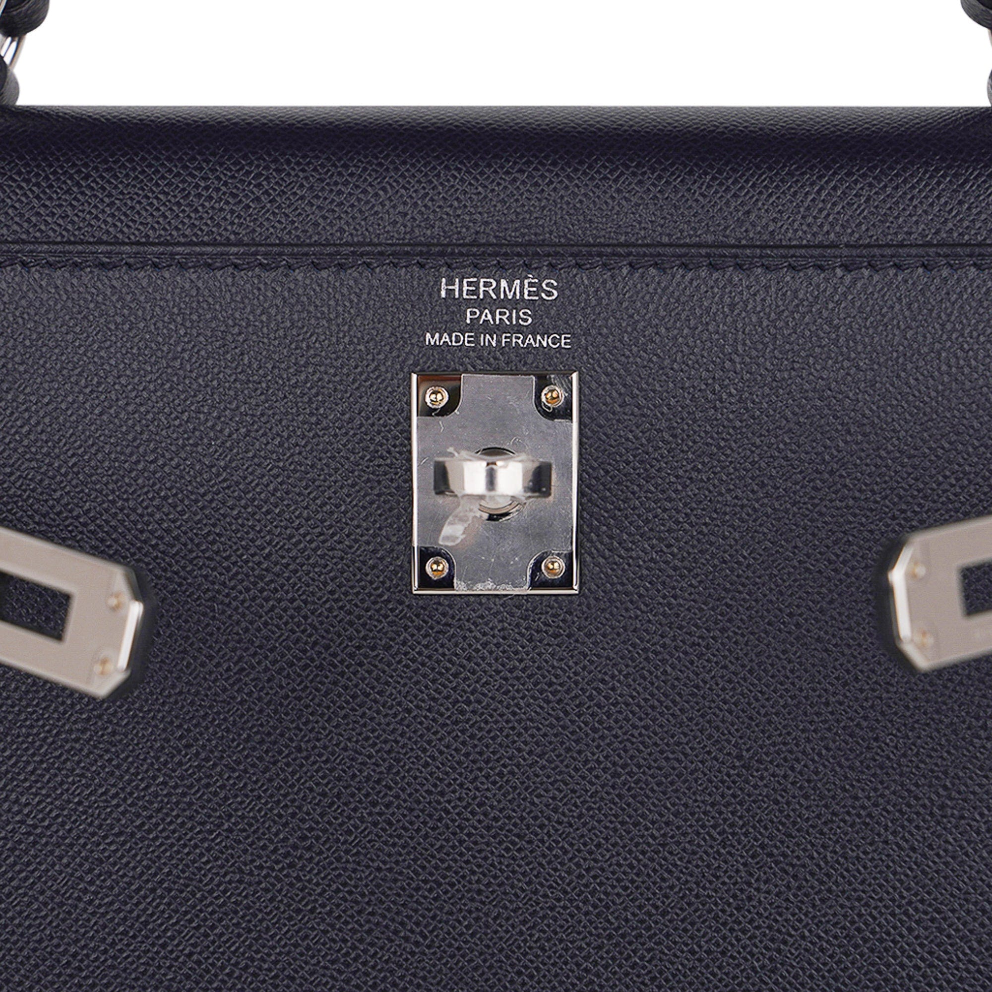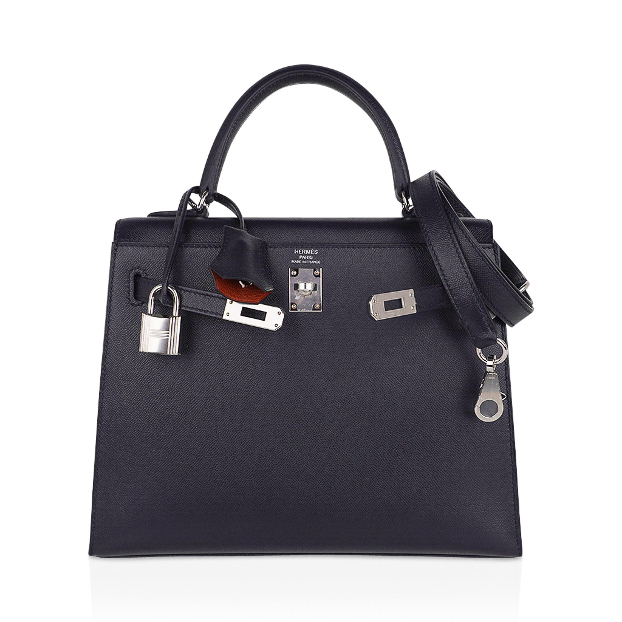 Guaranteed authentic Hermes Kelly Sellier 28 Verso bag featured in Bleu de Minuit with Noisette interior.