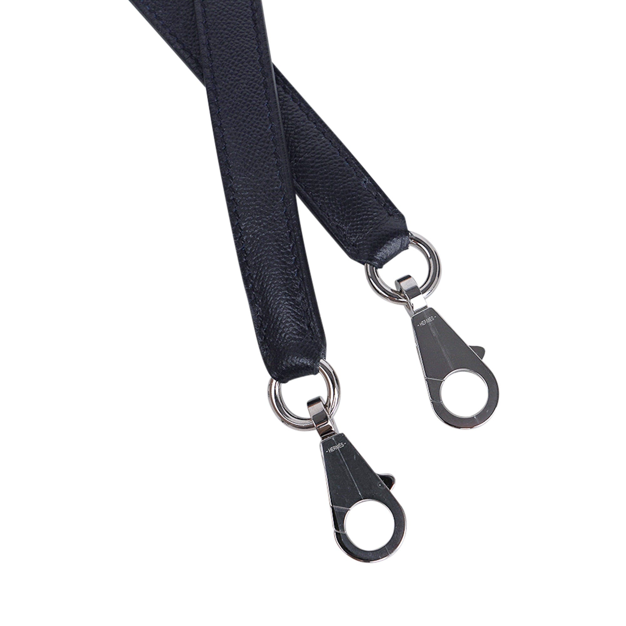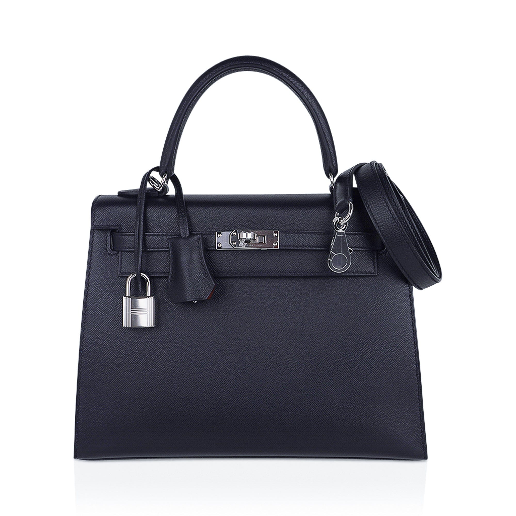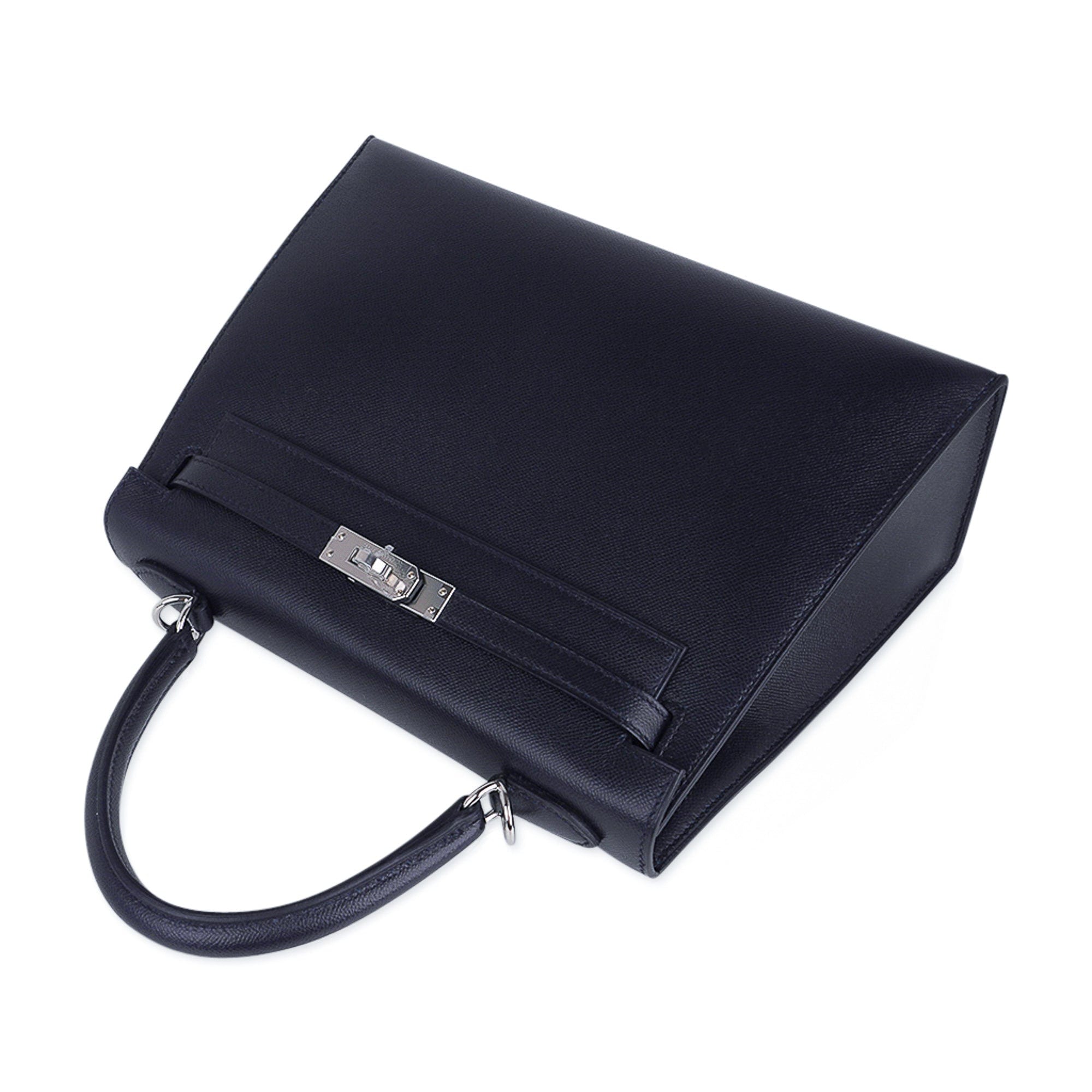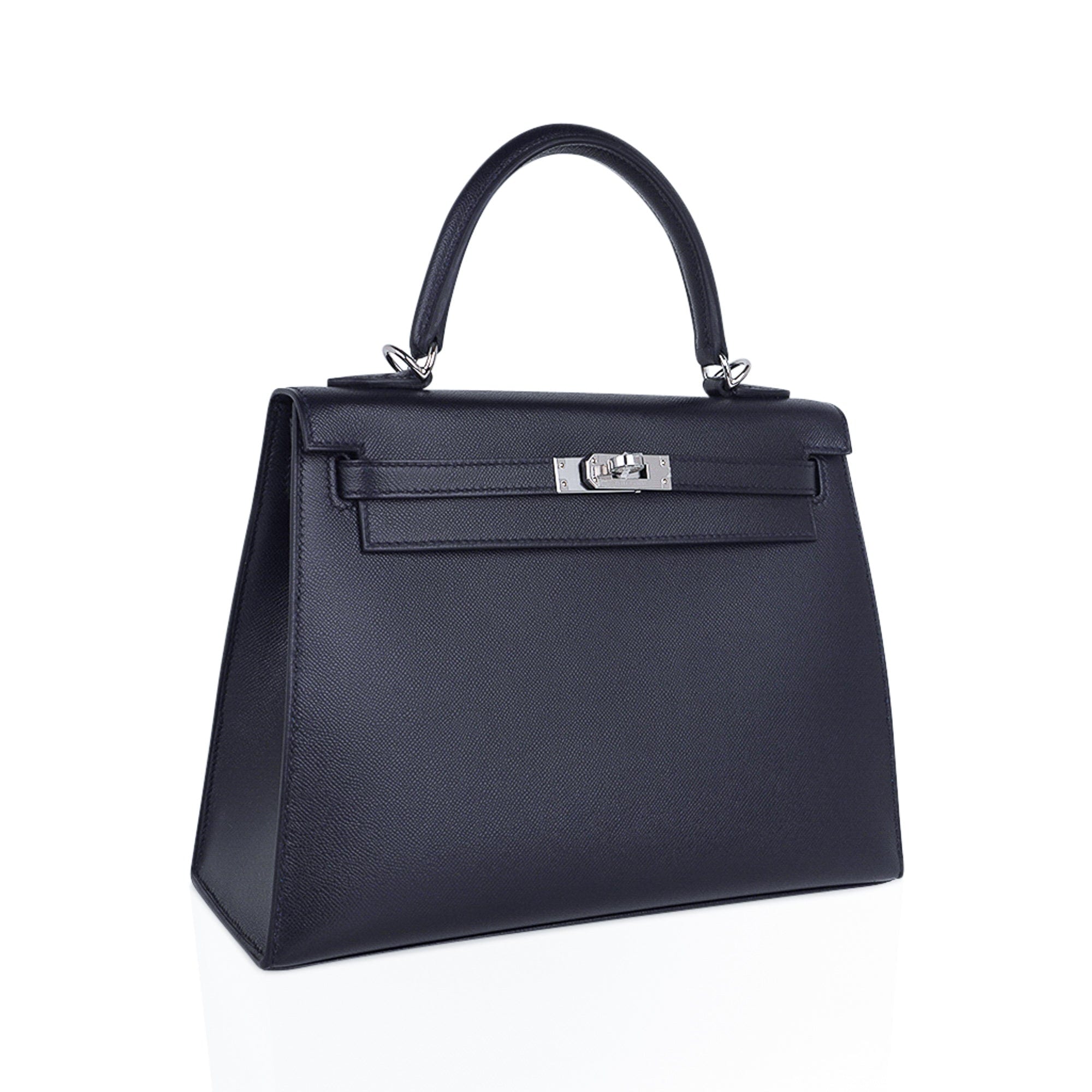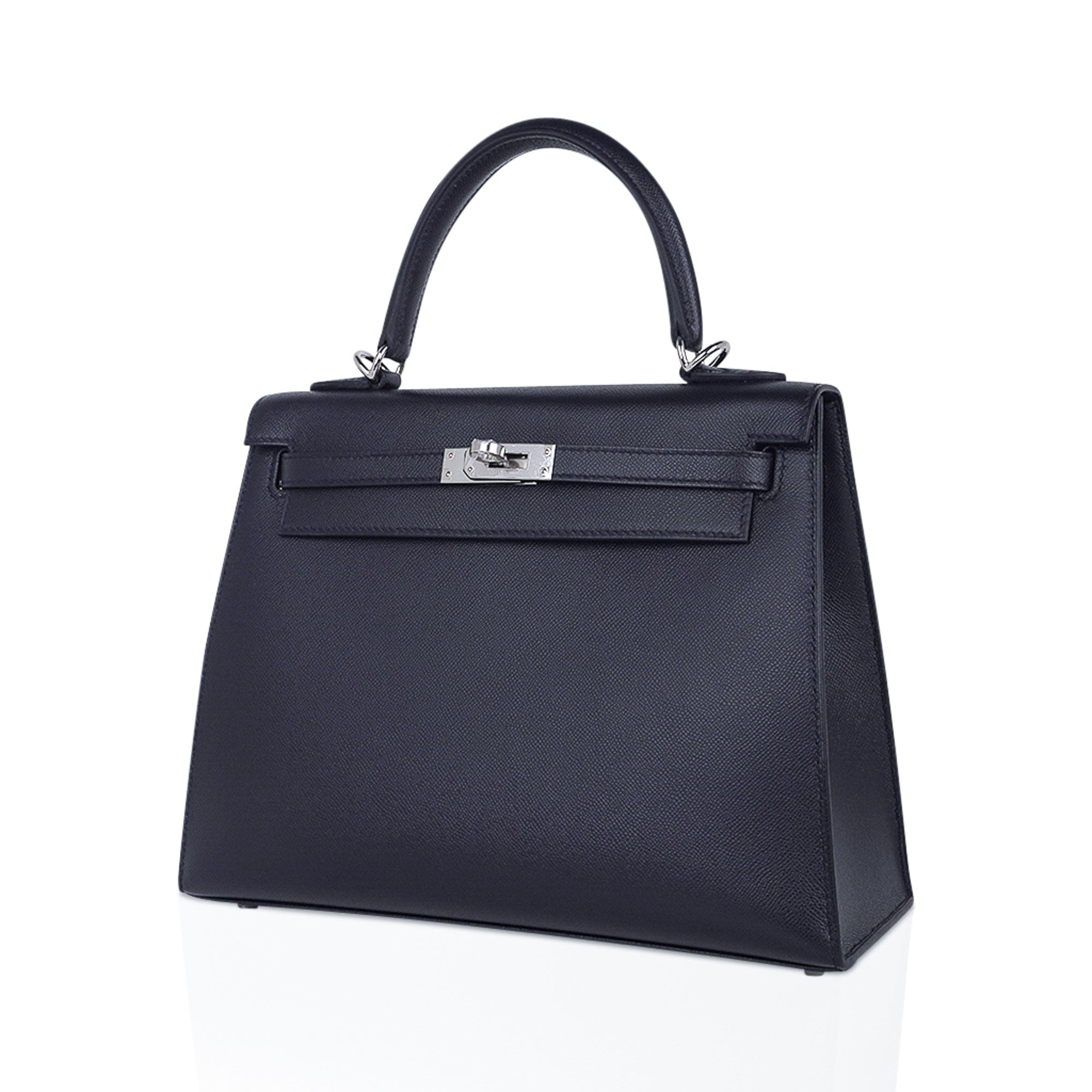 Guaranteed authentic Hermes Kelly Sellier 28 Verso bag featured in Bleu de Minuit with Noisette interior.