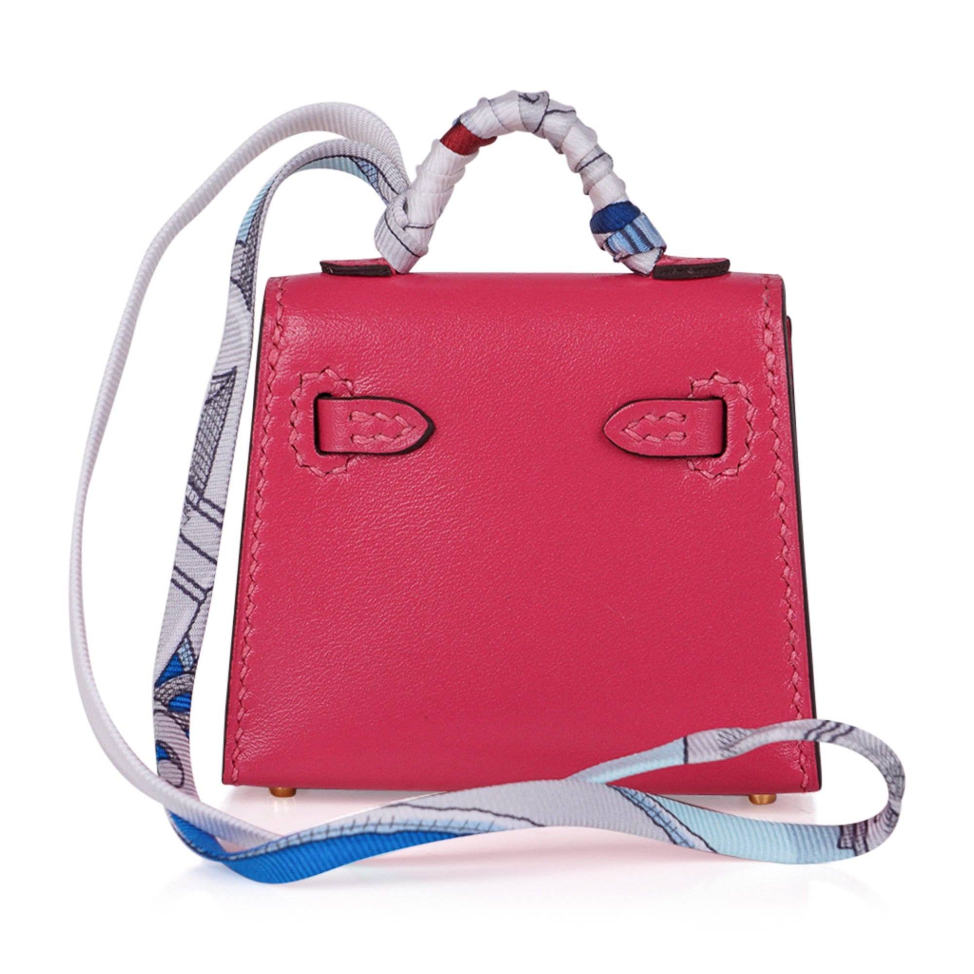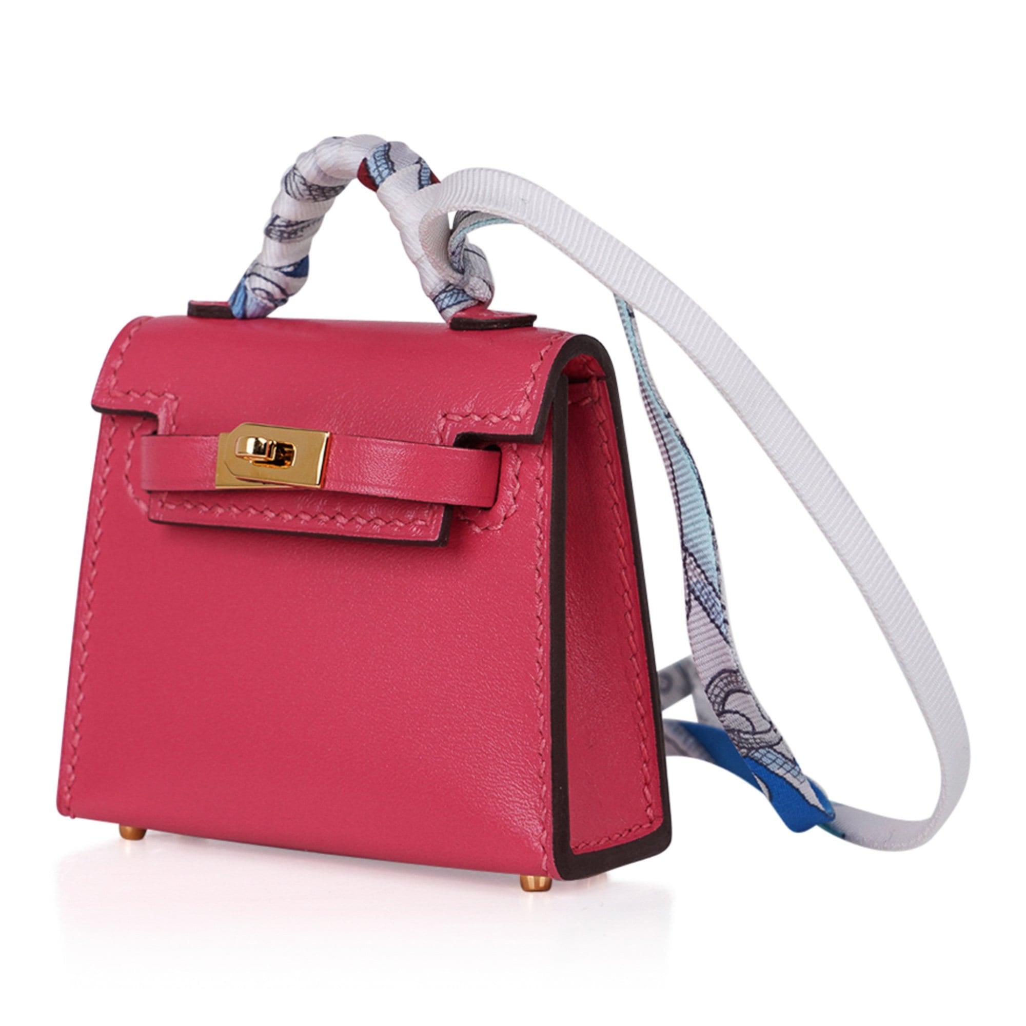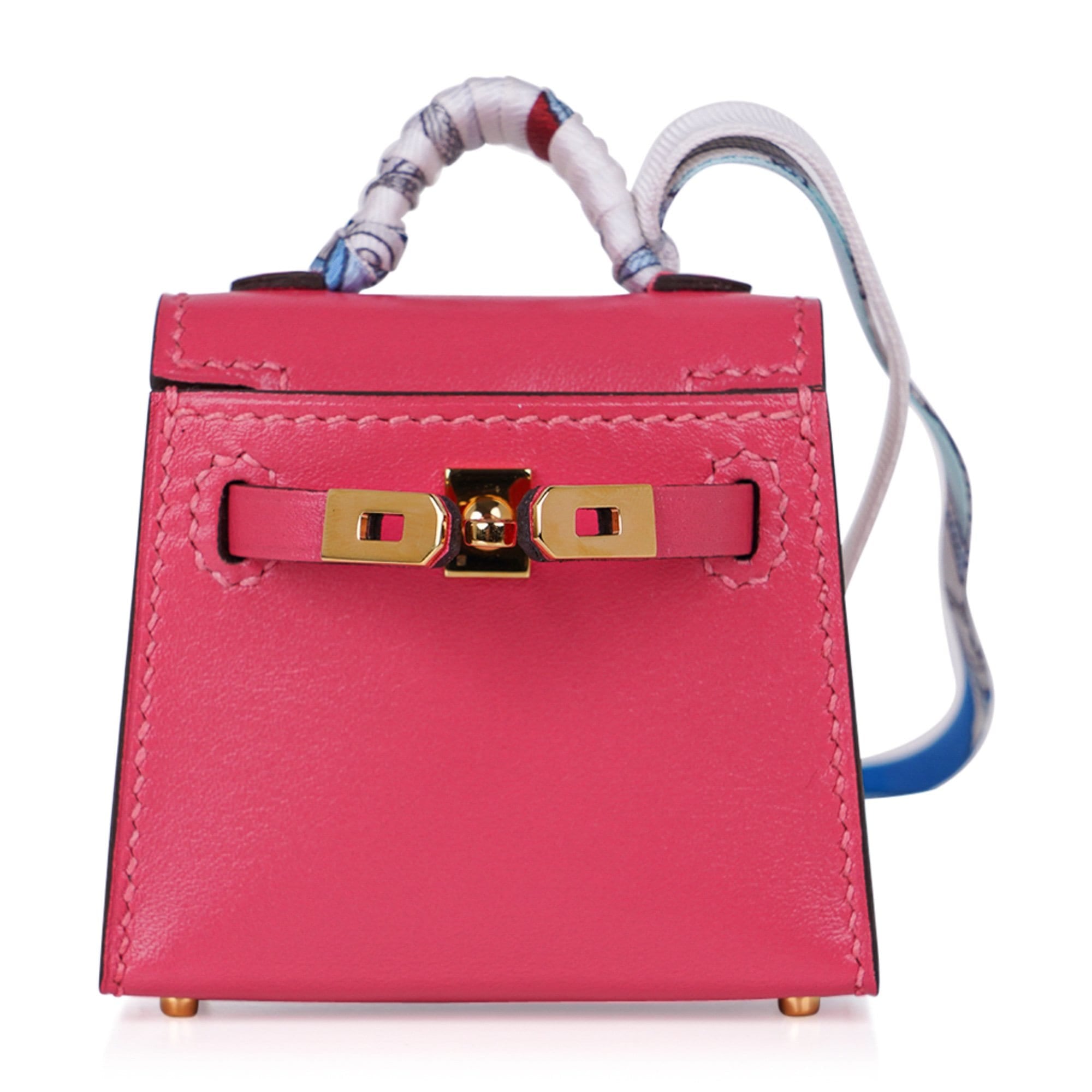 Guaranteed authentic very rare limited edition Hermes Kelly Twilly Bag Charm features a miniature Kelly in Rose Lipstick.