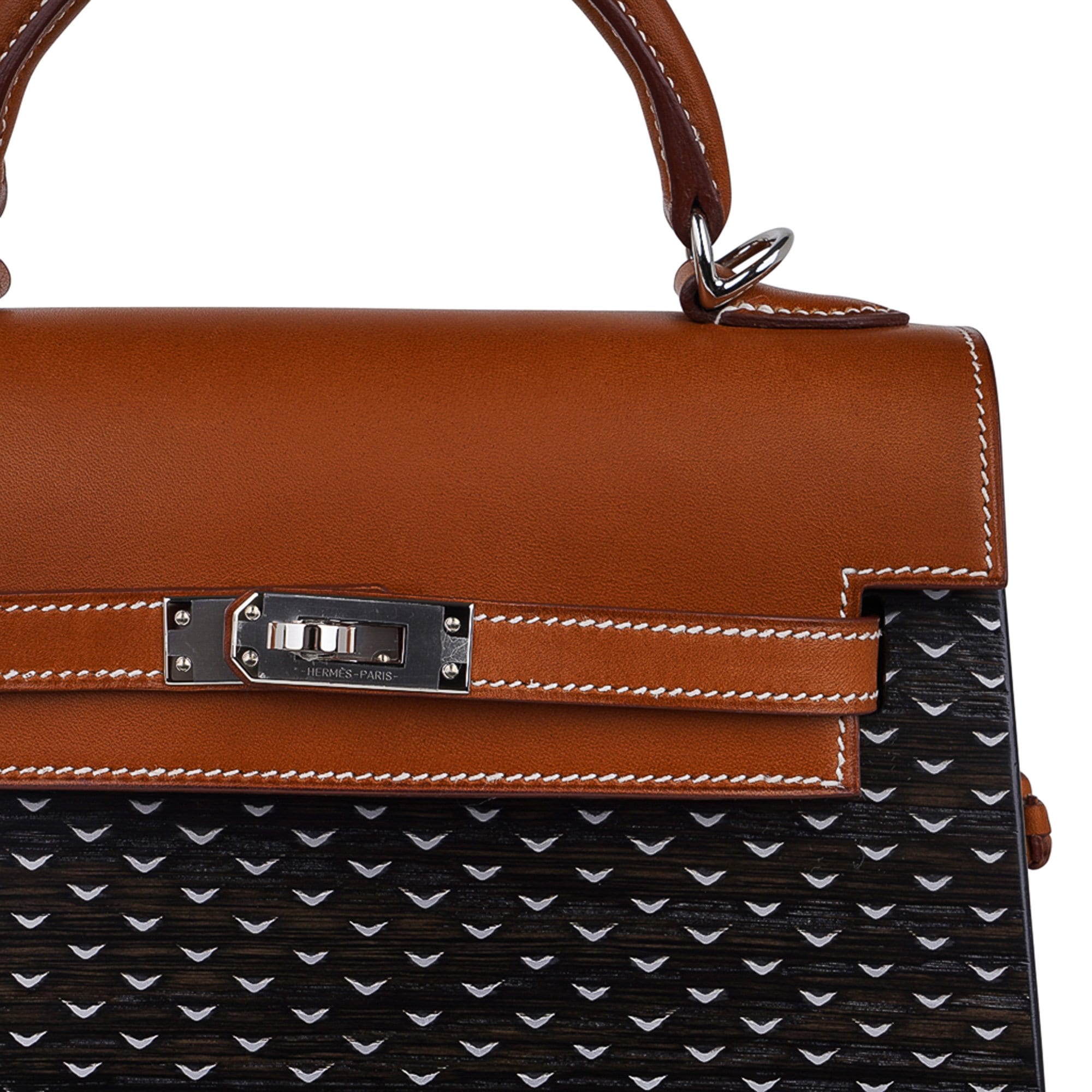 Guaranteed authentic exquisite limited edition Hermes Kellywood “Kelly Wood” 22 bag featured in bog oak and Barenia leather.