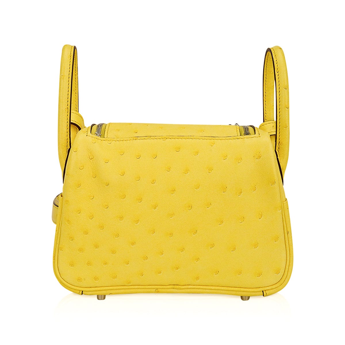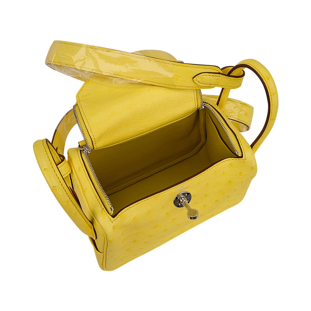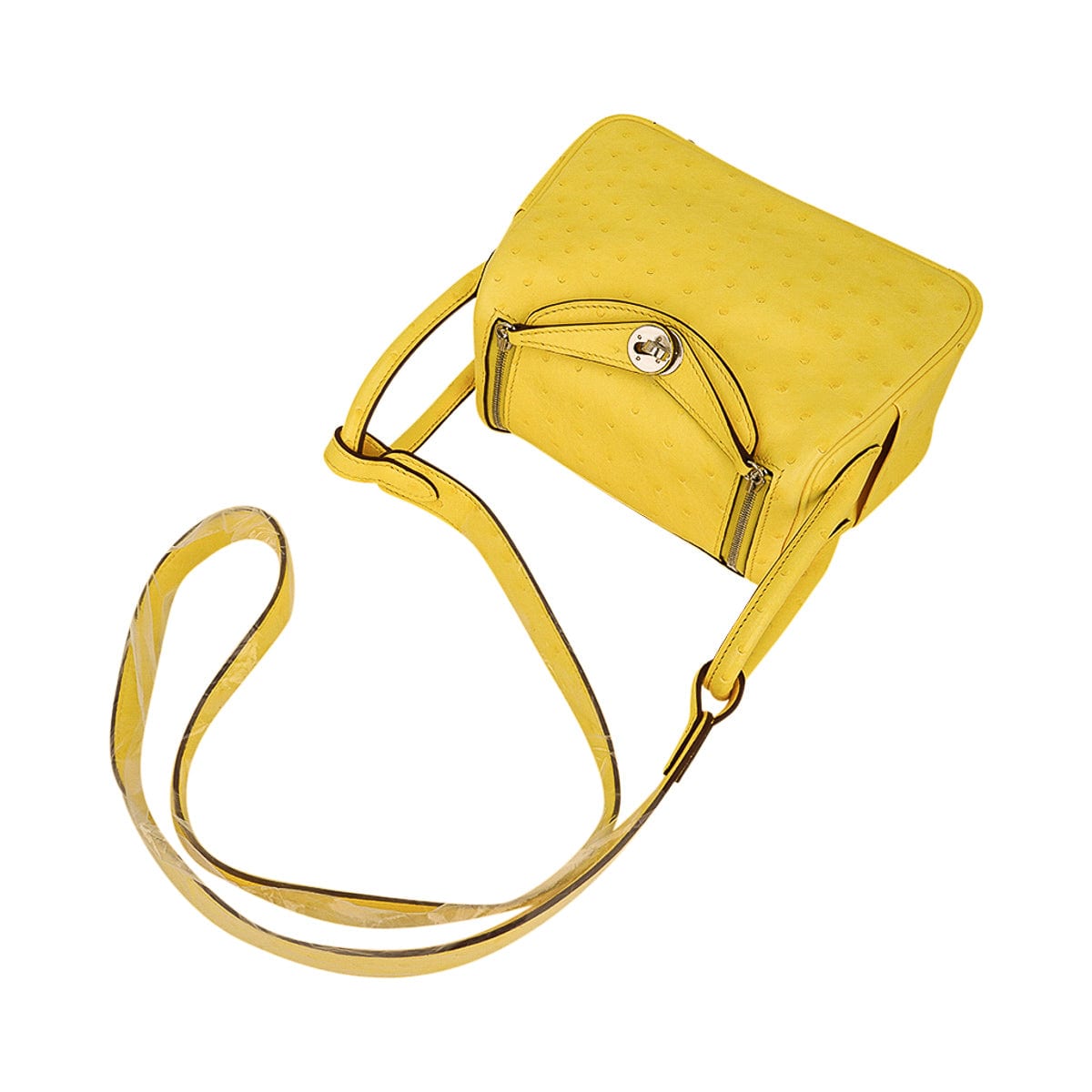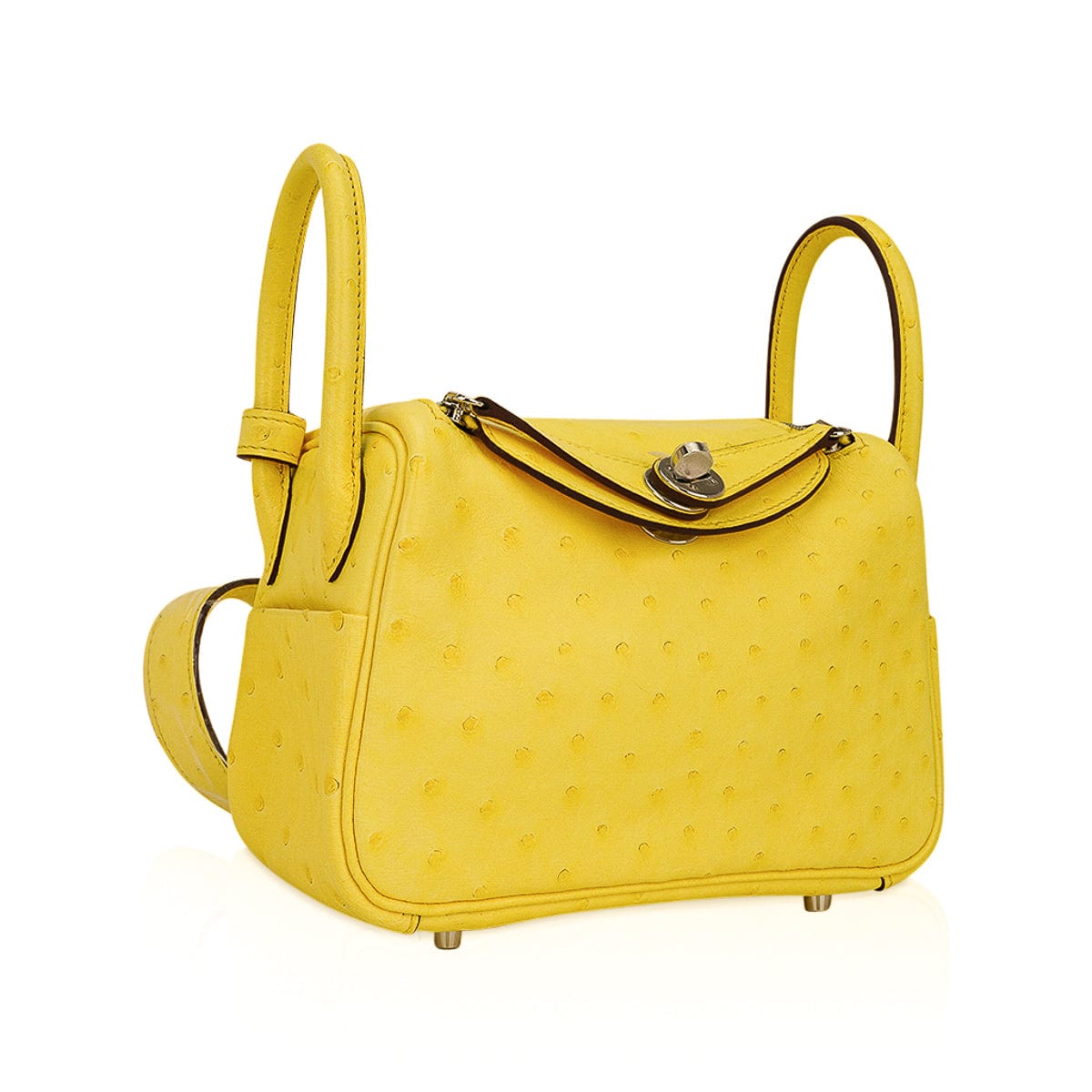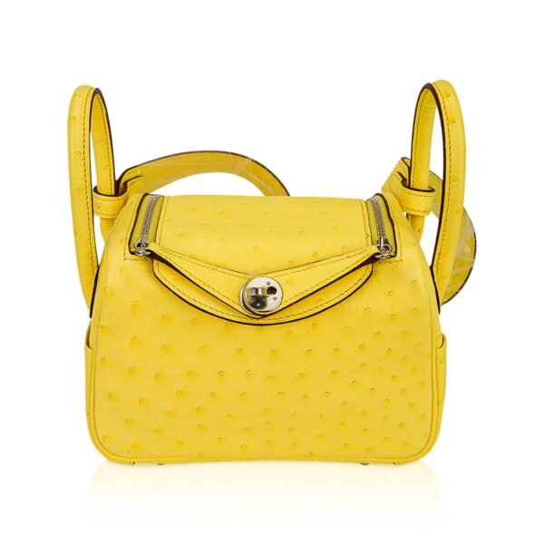 Guaranteed authentic Hermes Lindy Mini 20 bag featured in clear sunny yellow Jaune Citron Ostrich Boreal.