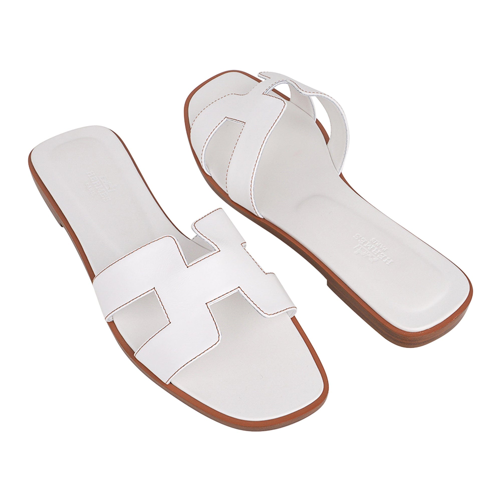 This Hermes Oran slide shoe is accentuated with Havane topstitch.