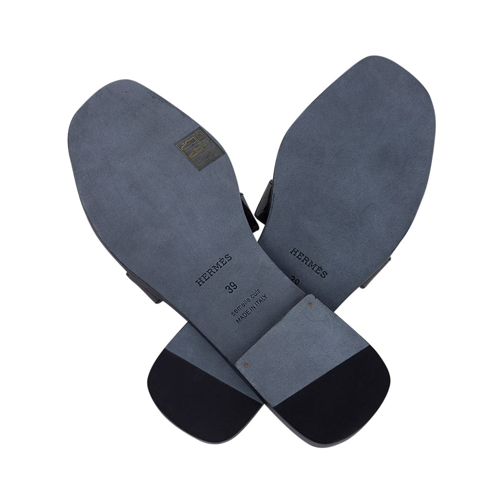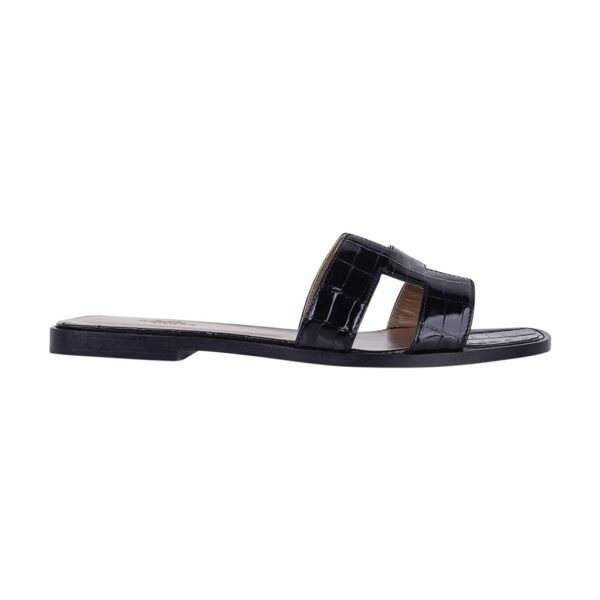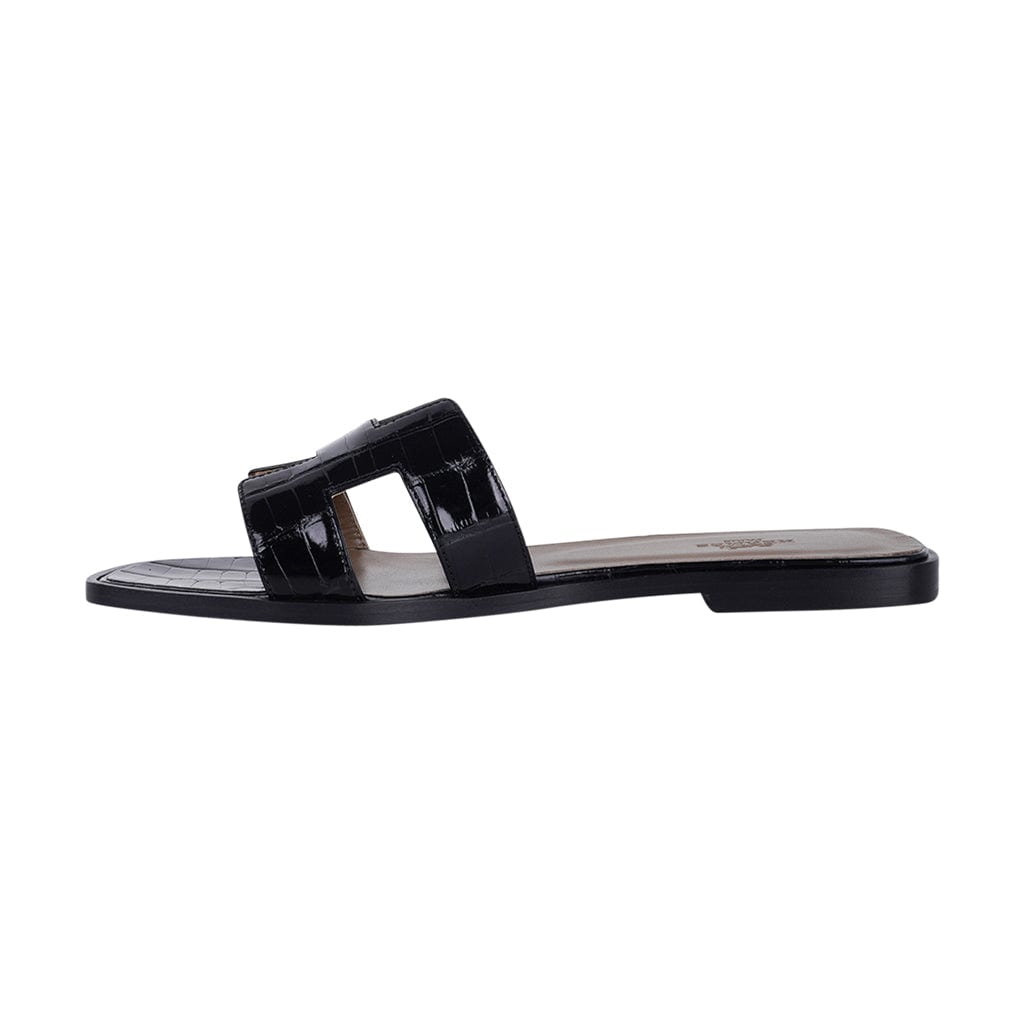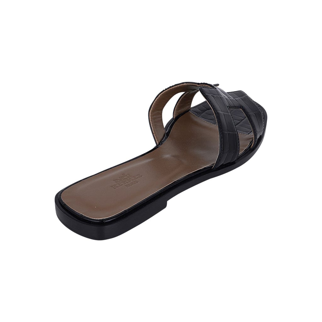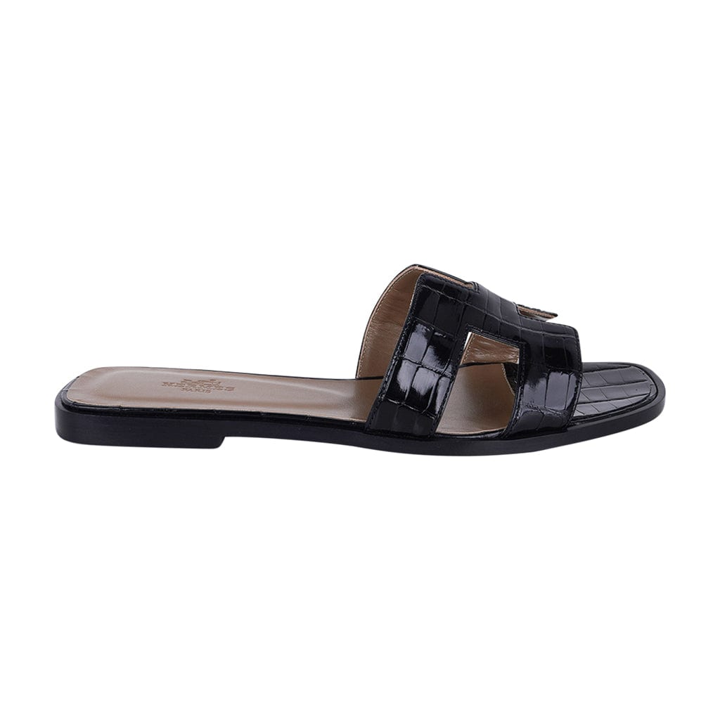 Guaranteed authentic Hermes Oran Sandals featured in Black Alligator.