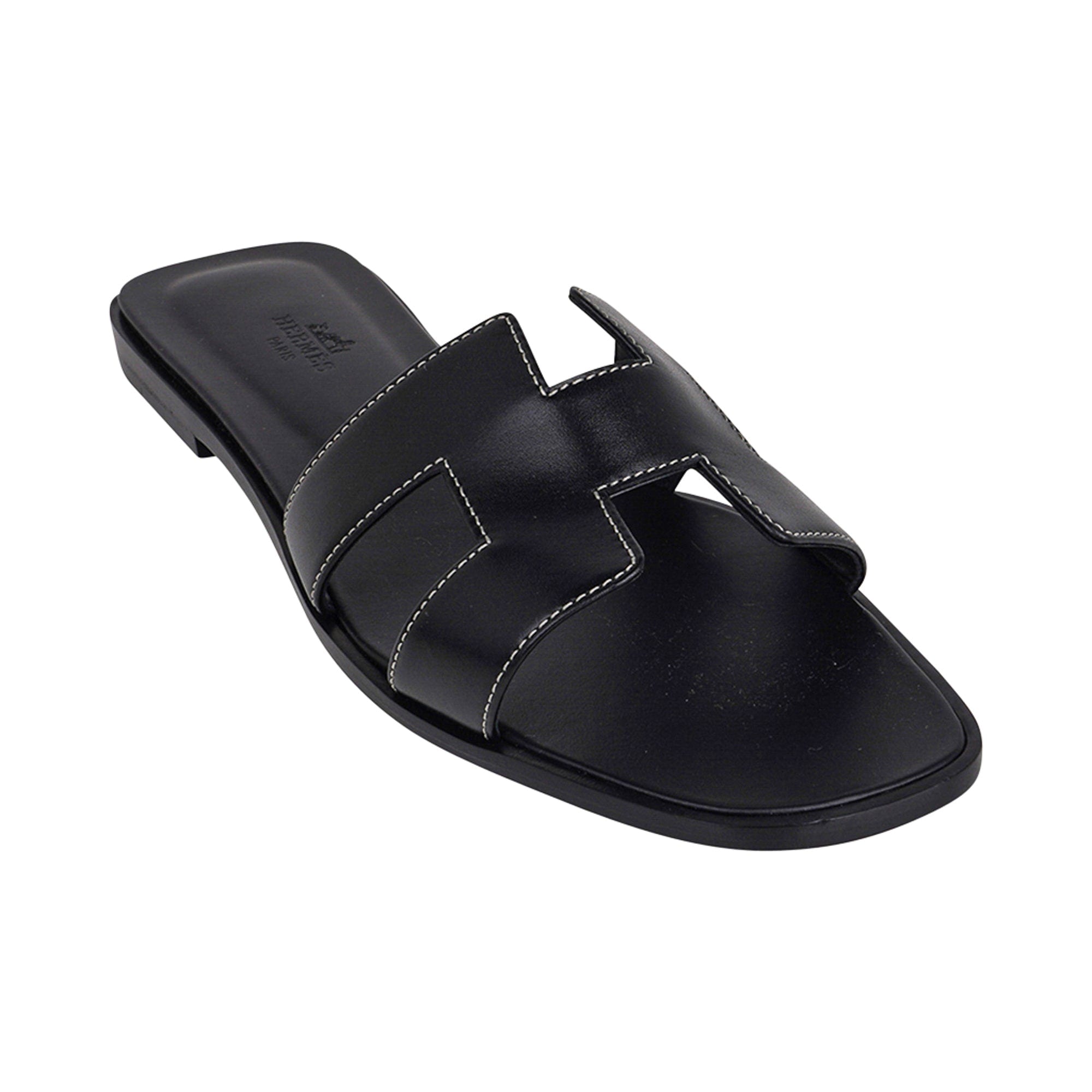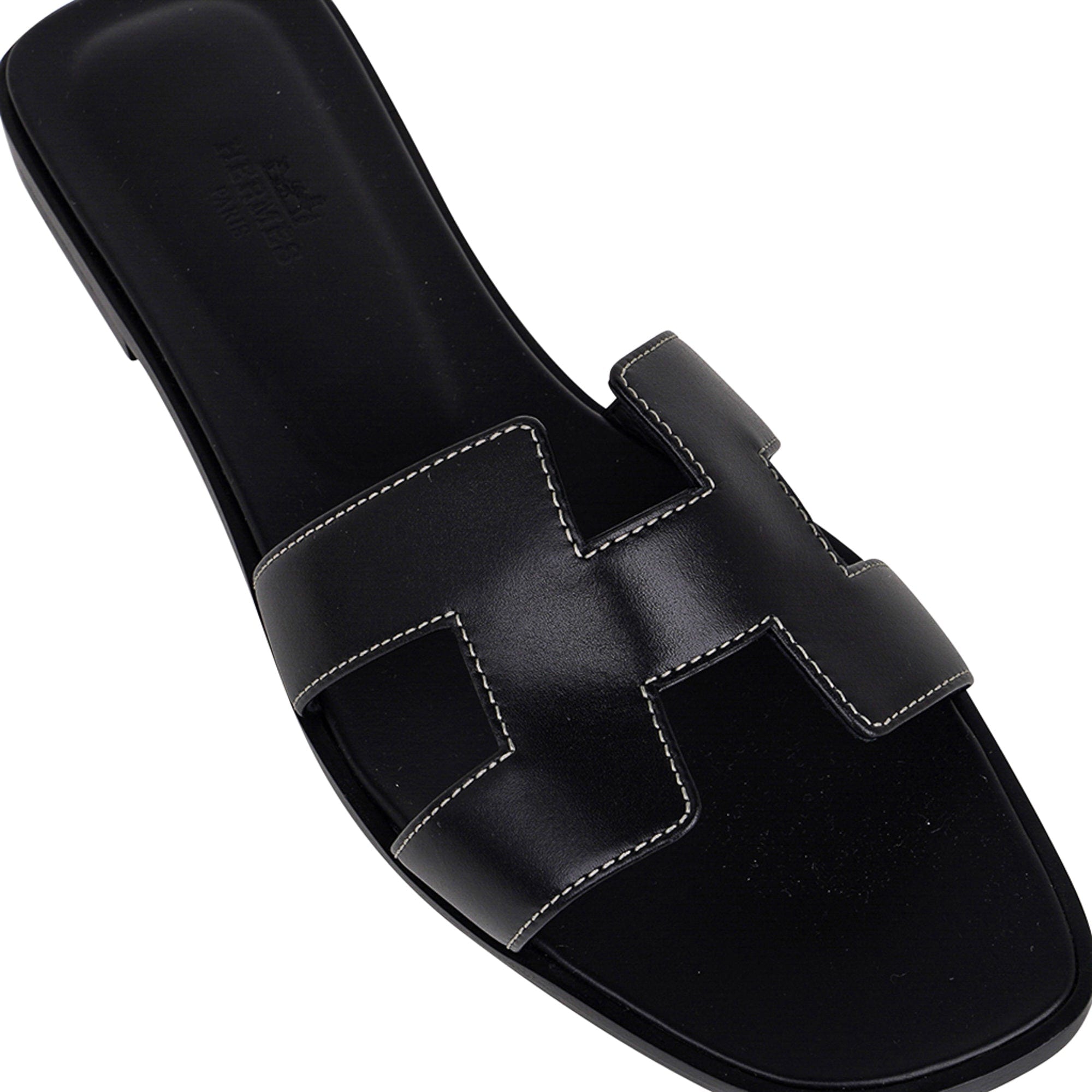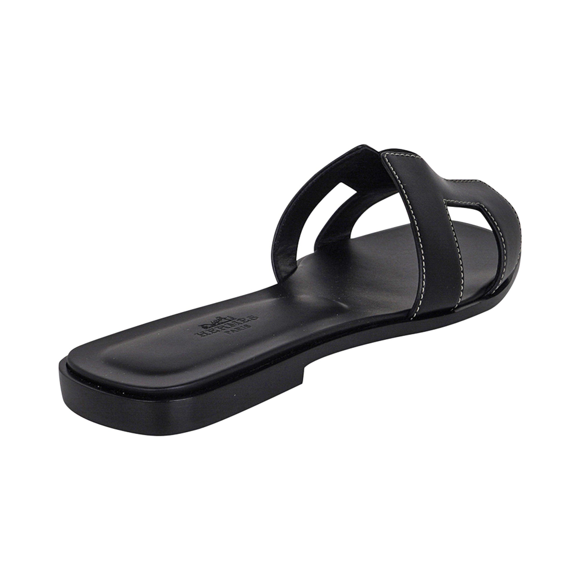 Guaranteed authentic Hermes Oran exquisite Black calfskin slide.