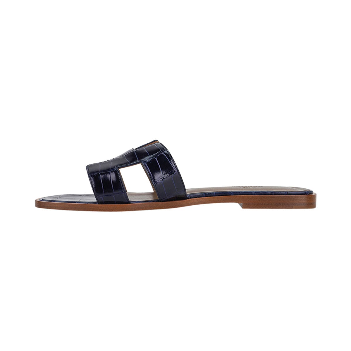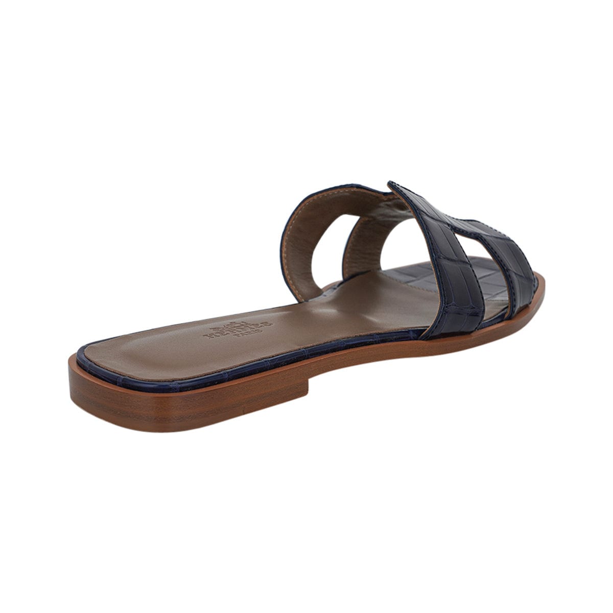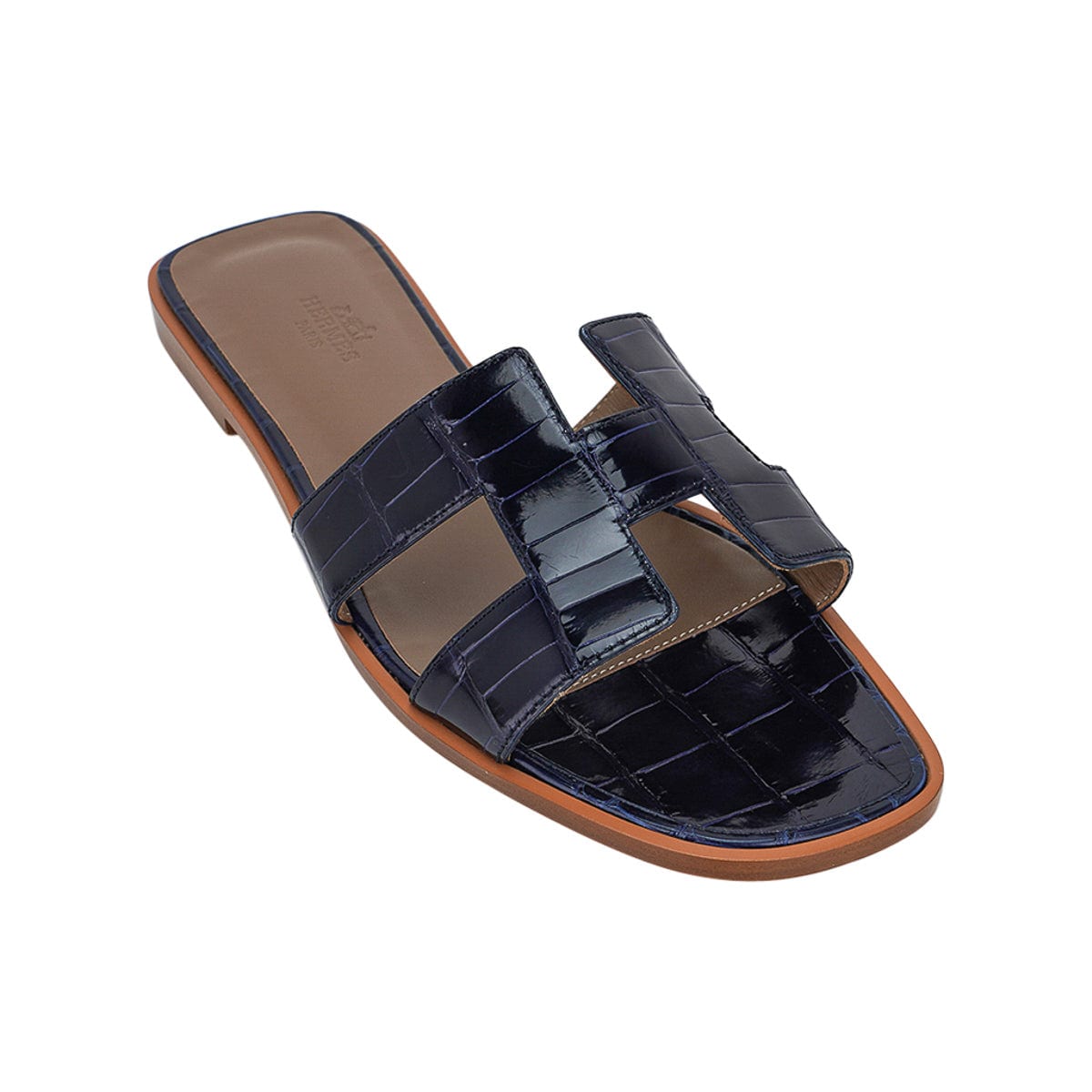 Guaranteed authentic Hermes Oran sandals featured in Bleu Marine Alligator.