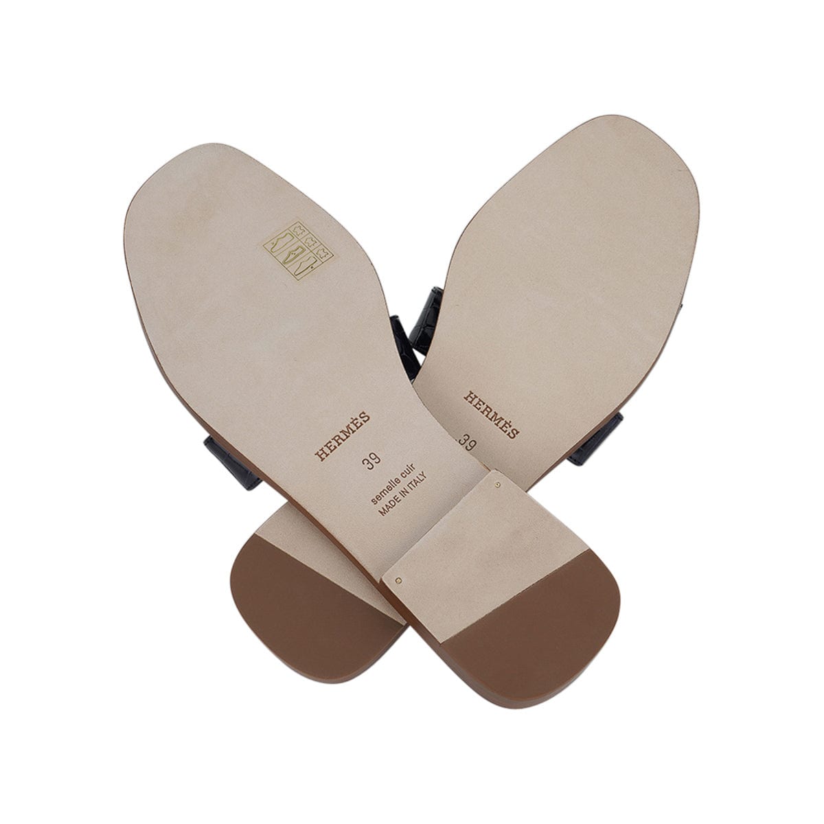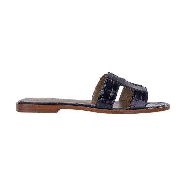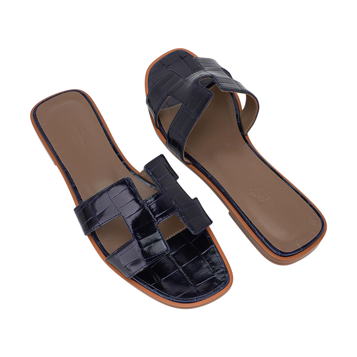 Guaranteed authentic Hermes Oran sandals featured in Bleu Marine Alligator.