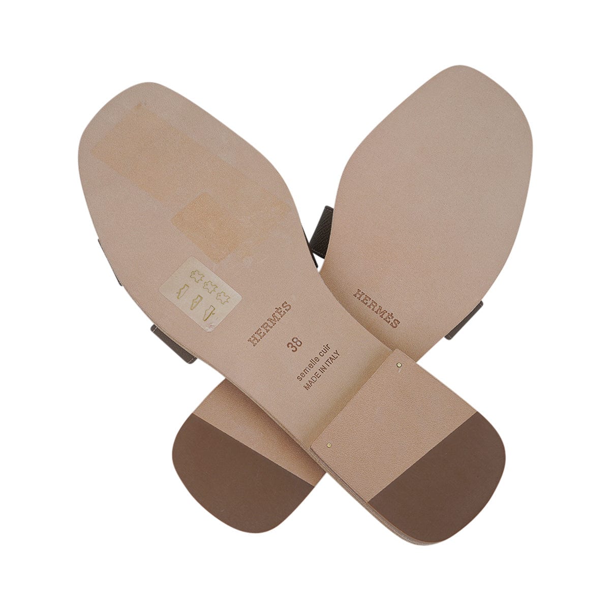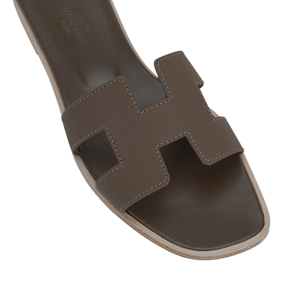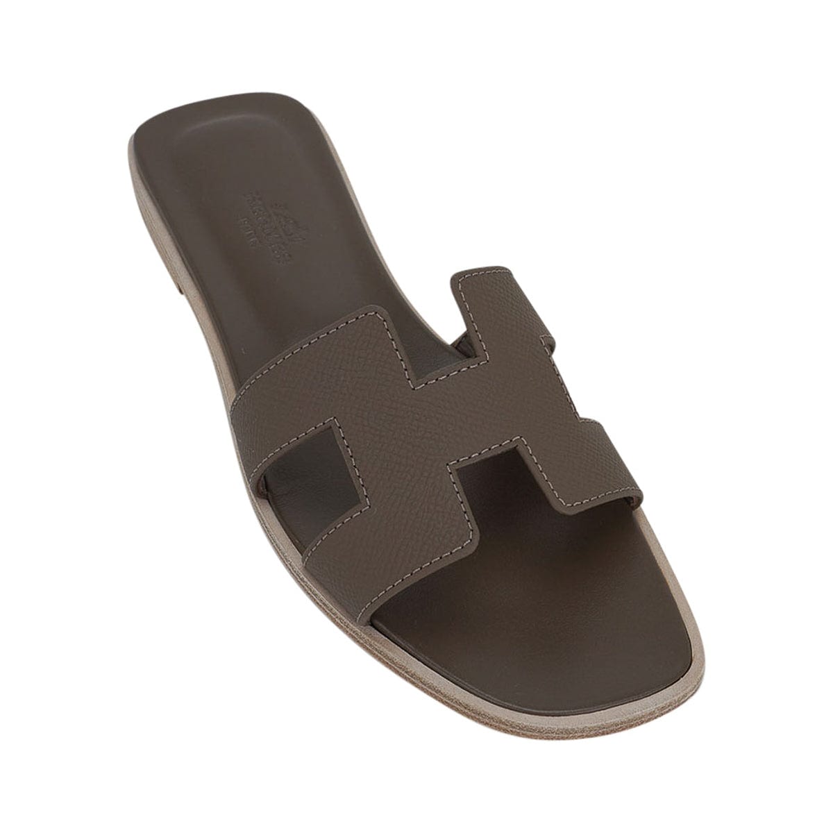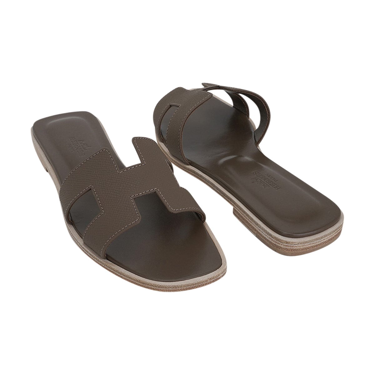 Guaranteed authentic Hermes Oran sandal shoes featured in neutral Etoupe Epsom leather.