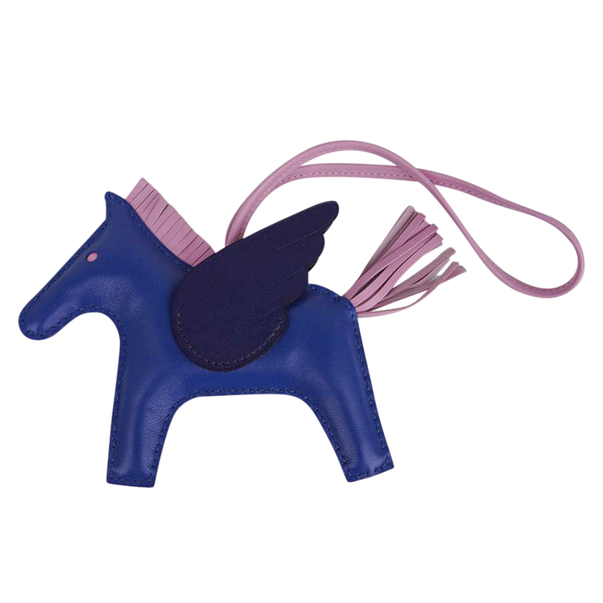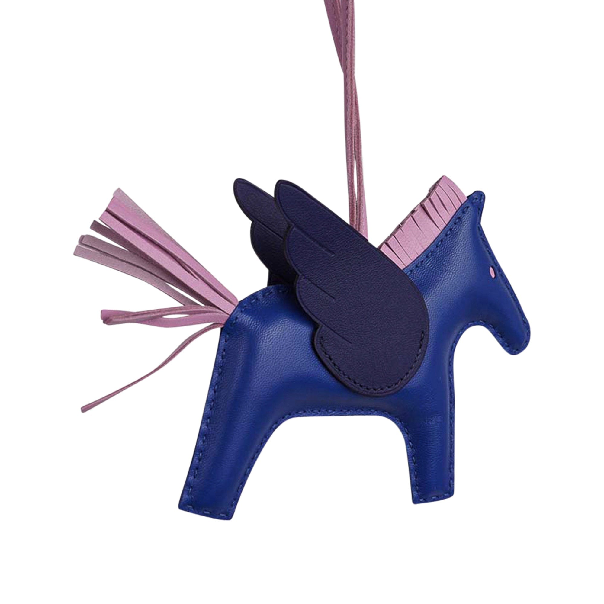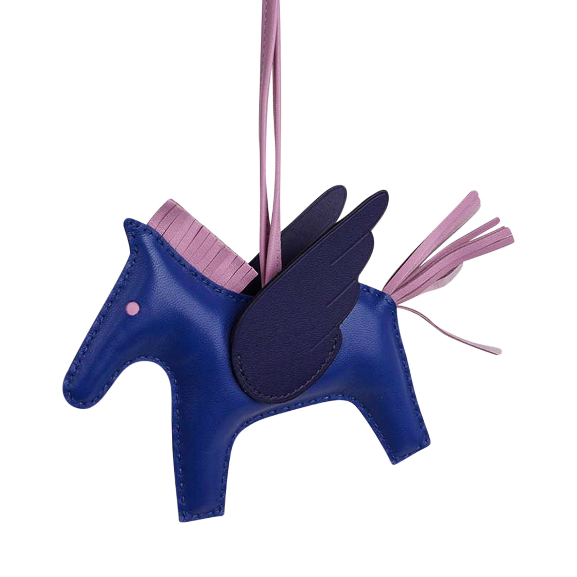 Hermes Grigri Pegase Rodeo MM featured in Bleu de France with Mauve Sylvestre mane and tail, and Bleu Saphir wings.