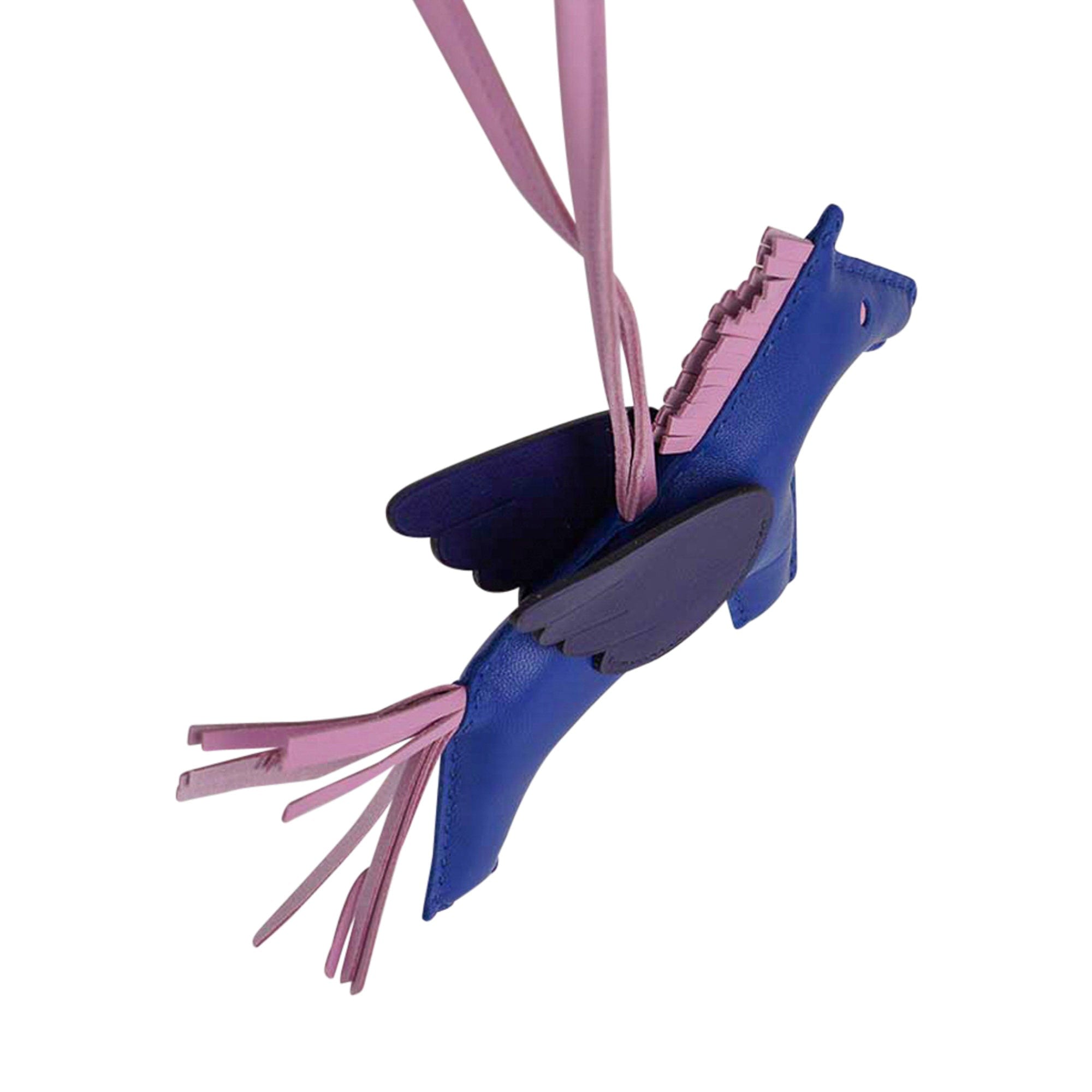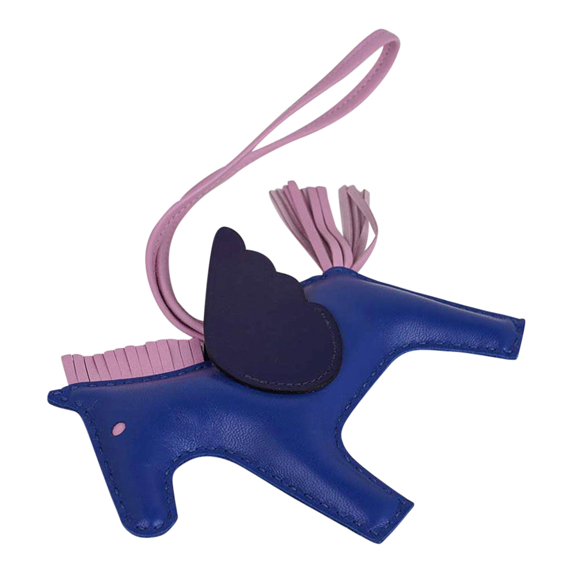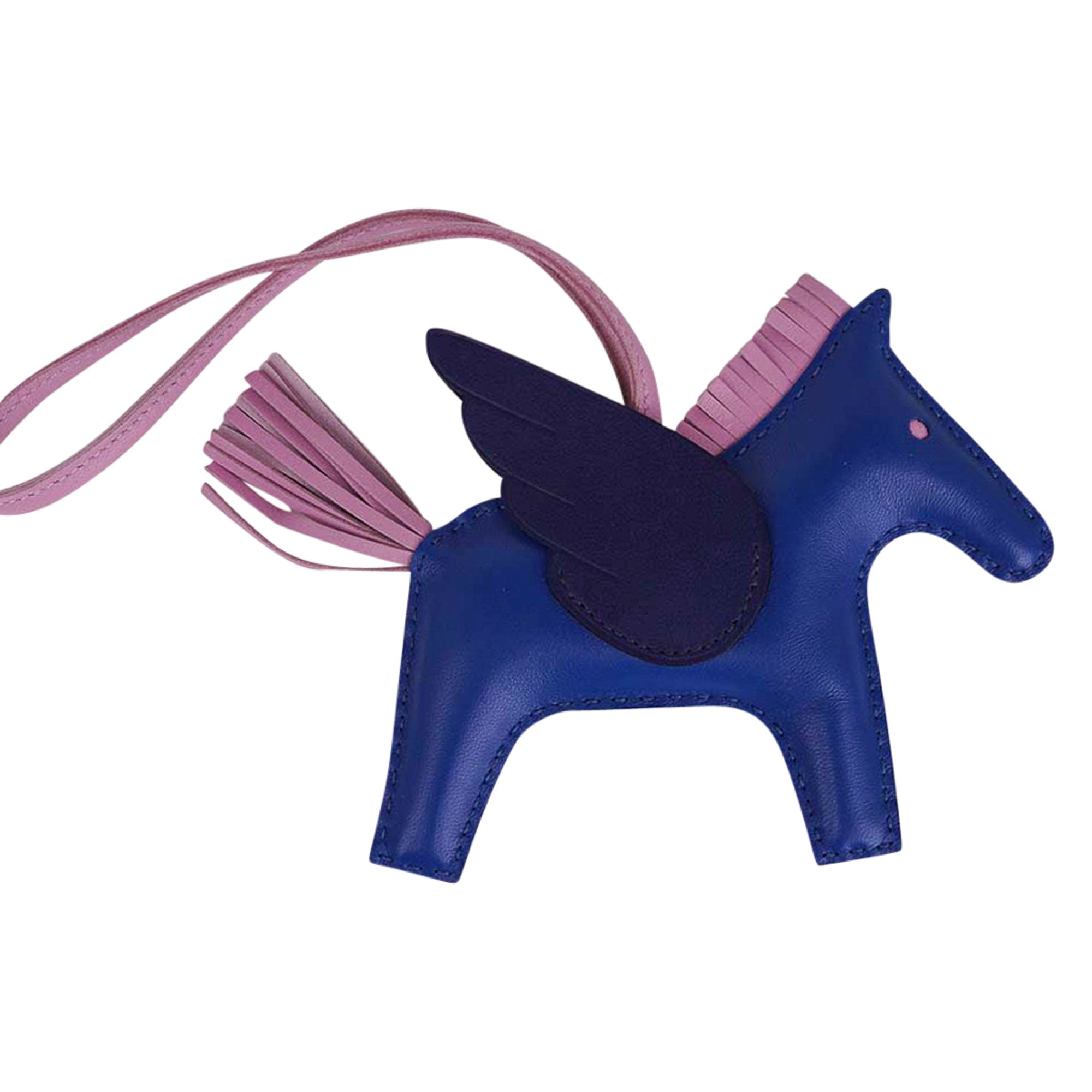 Hermes Grigri Pegase Rodeo MM featured in Bleu de France with Mauve Sylvestre mane and tail, and Bleu Saphir wings.