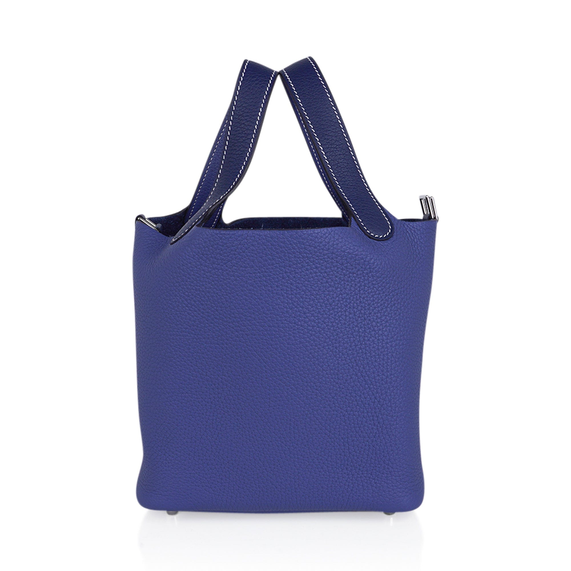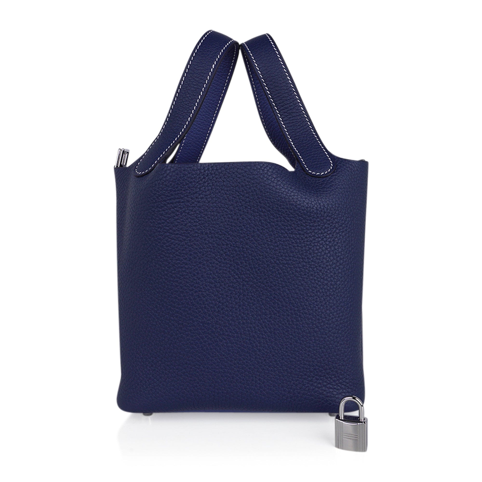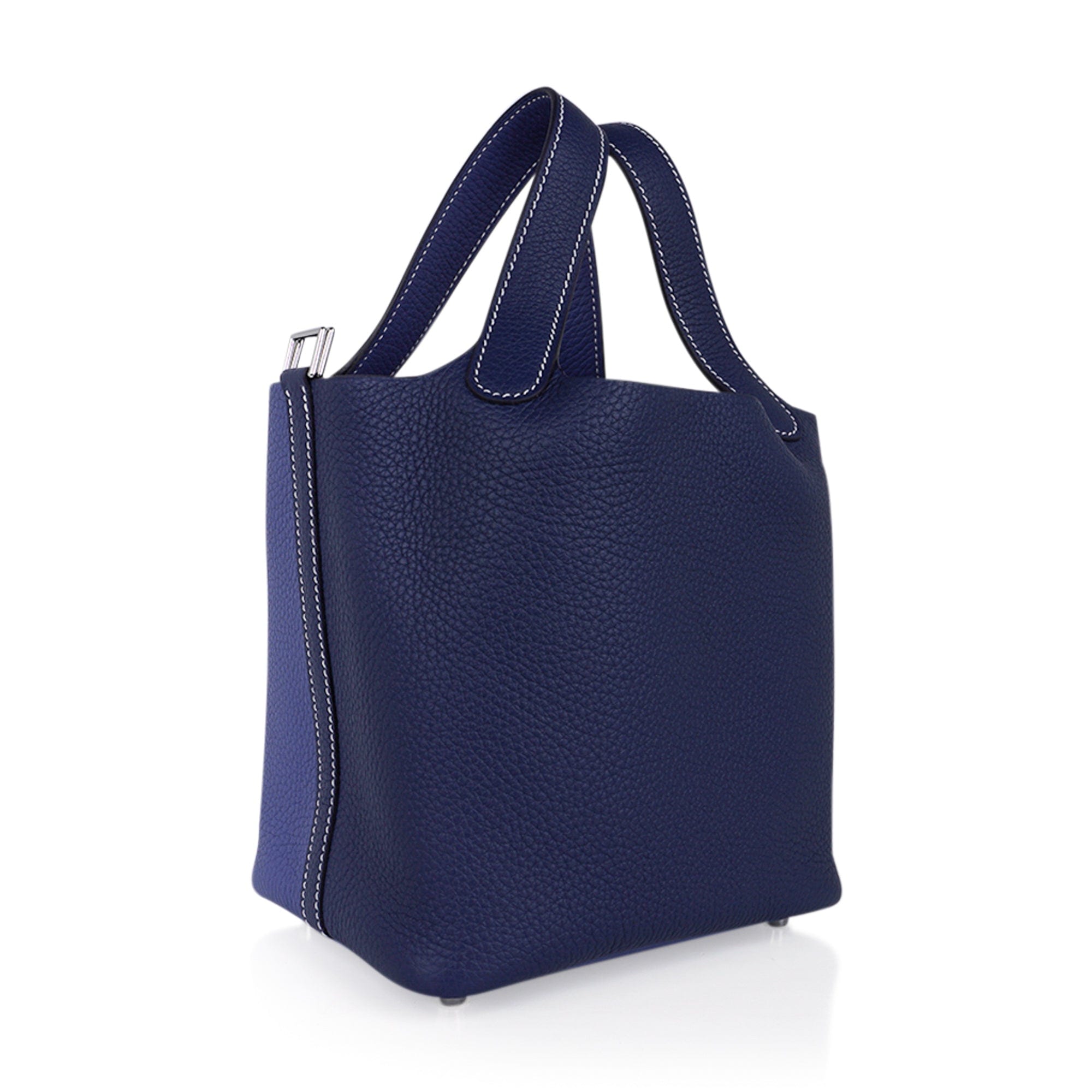Guaranteed authentic Hermes Picotin Eclat Lock 18 tote bag featured in Bleu Saphir and Bleu Brighton.
