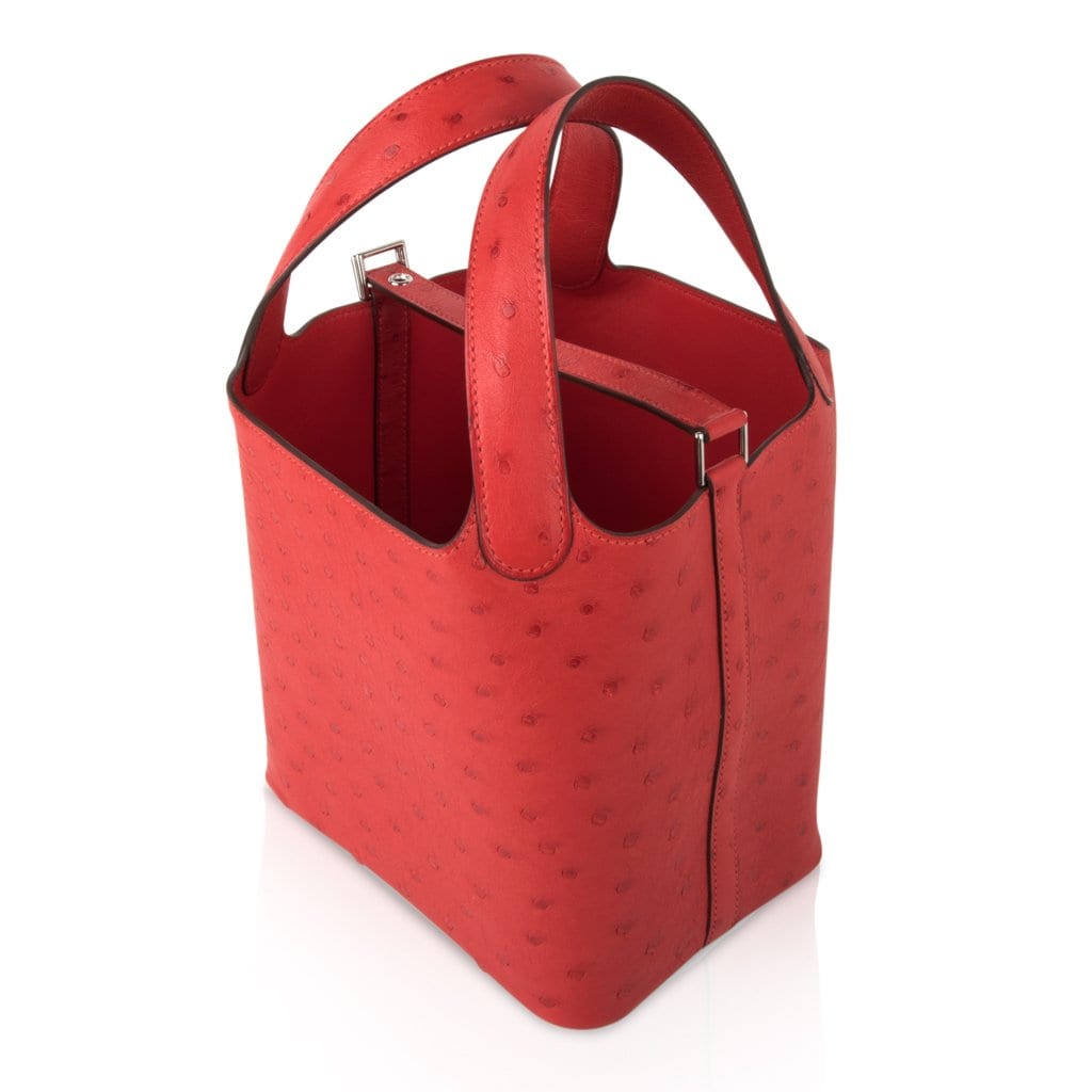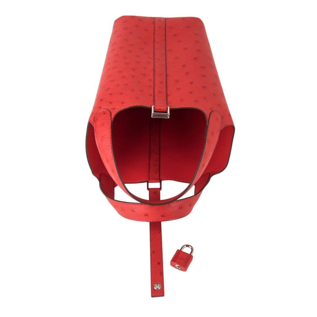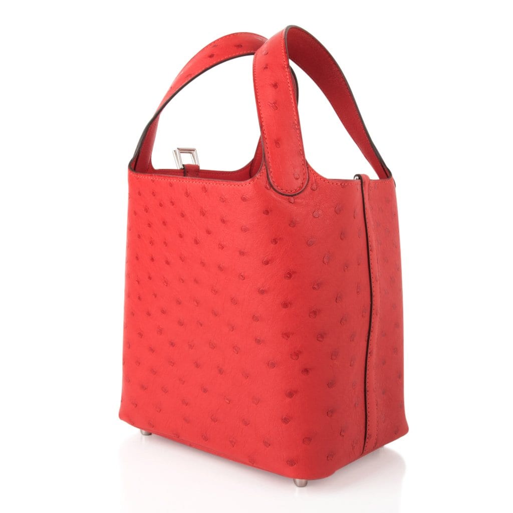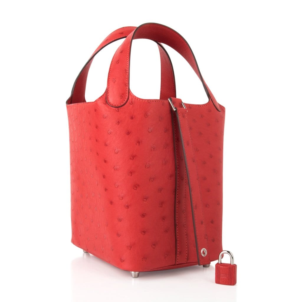Guaranteed authentic Hermes Picotin Lock 18cm features vivid red Rouge Exotique Ostrich tote bag.