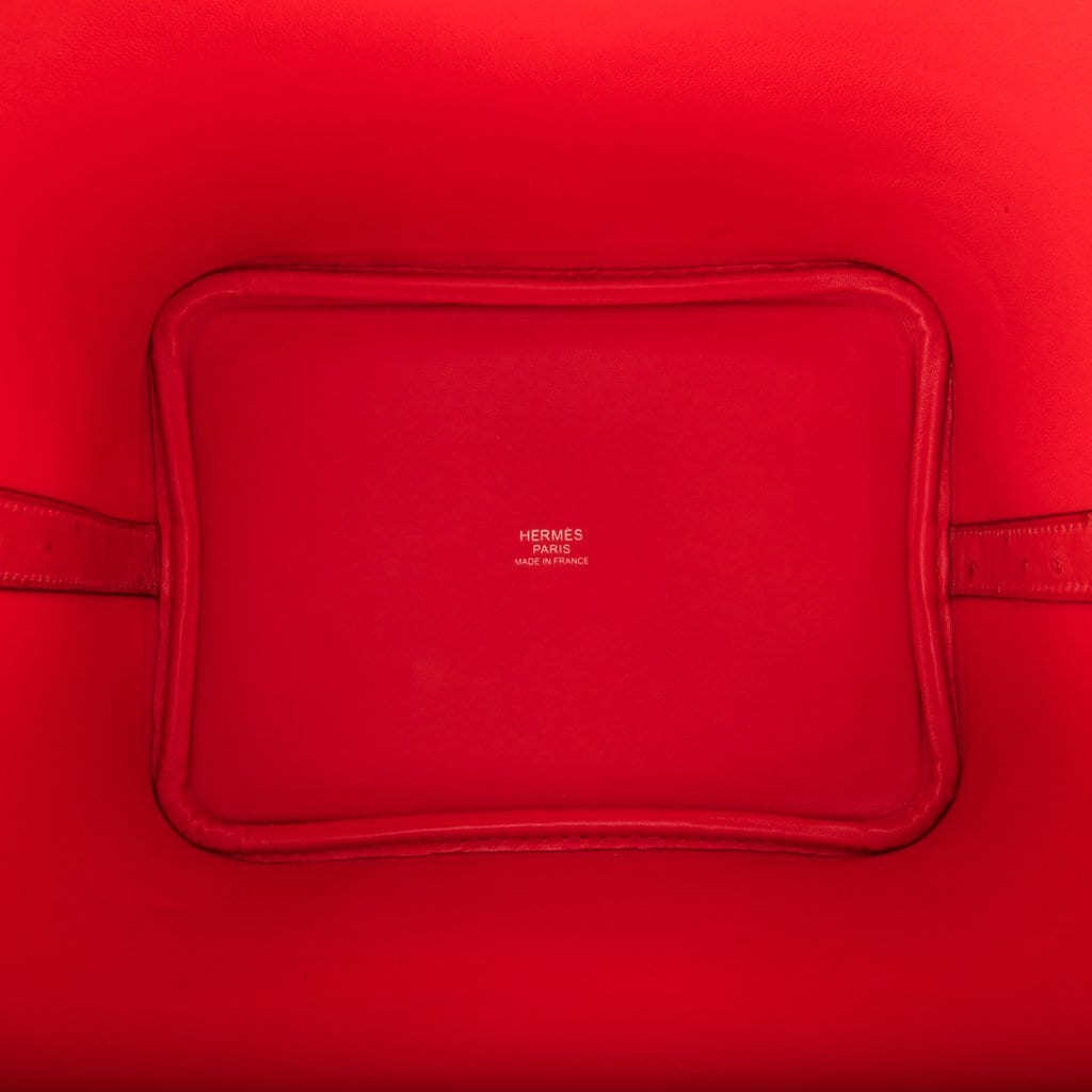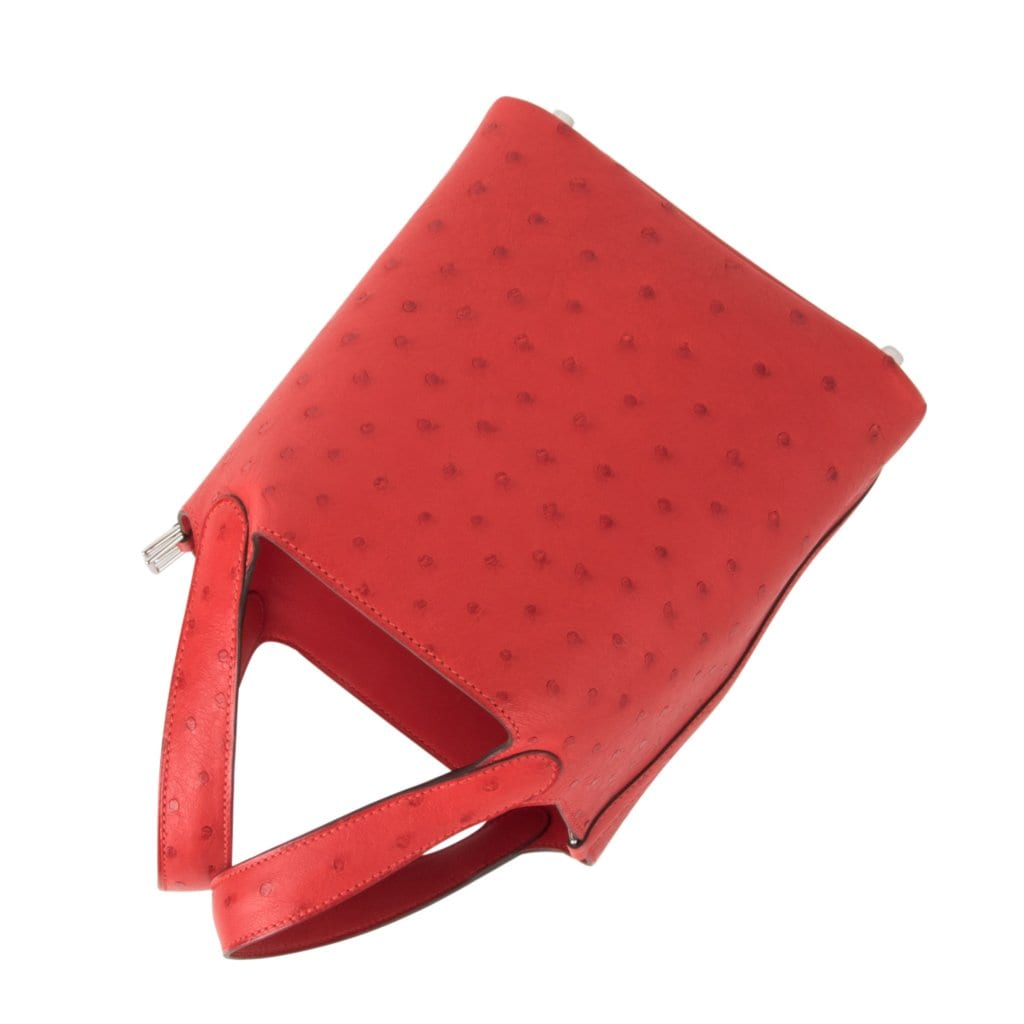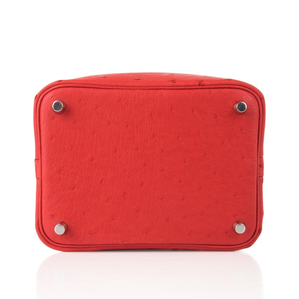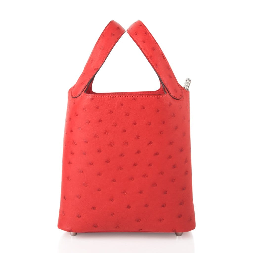 Guaranteed authentic Hermes Picotin Lock 18cm features vivid red Rouge Exotique Ostrich tote bag.