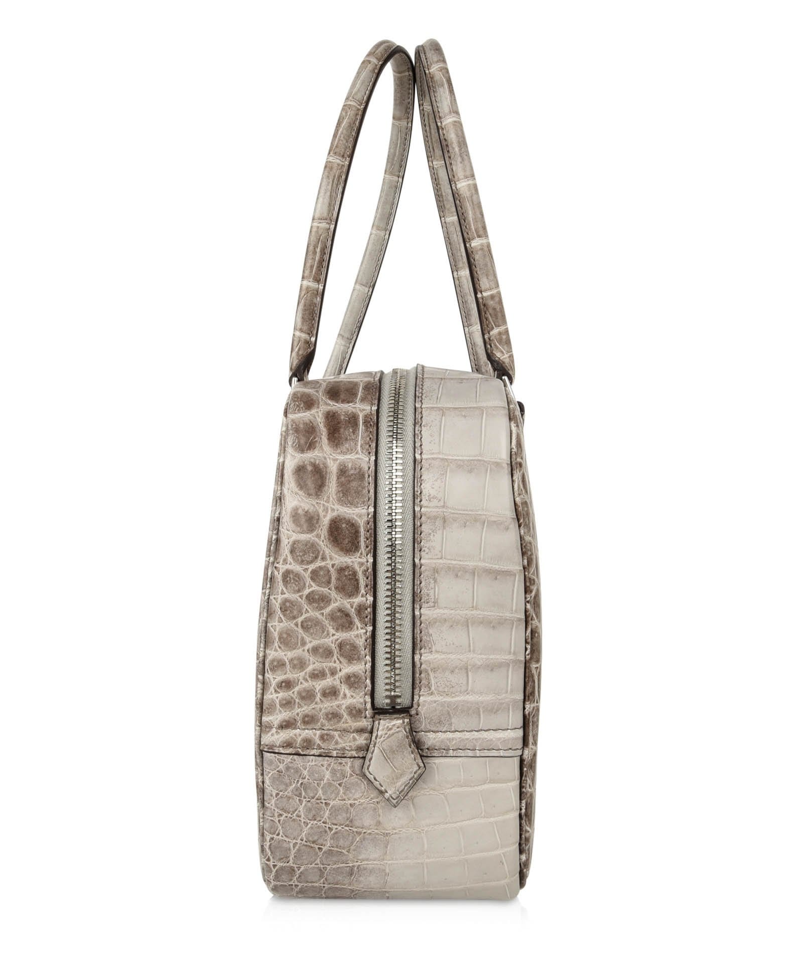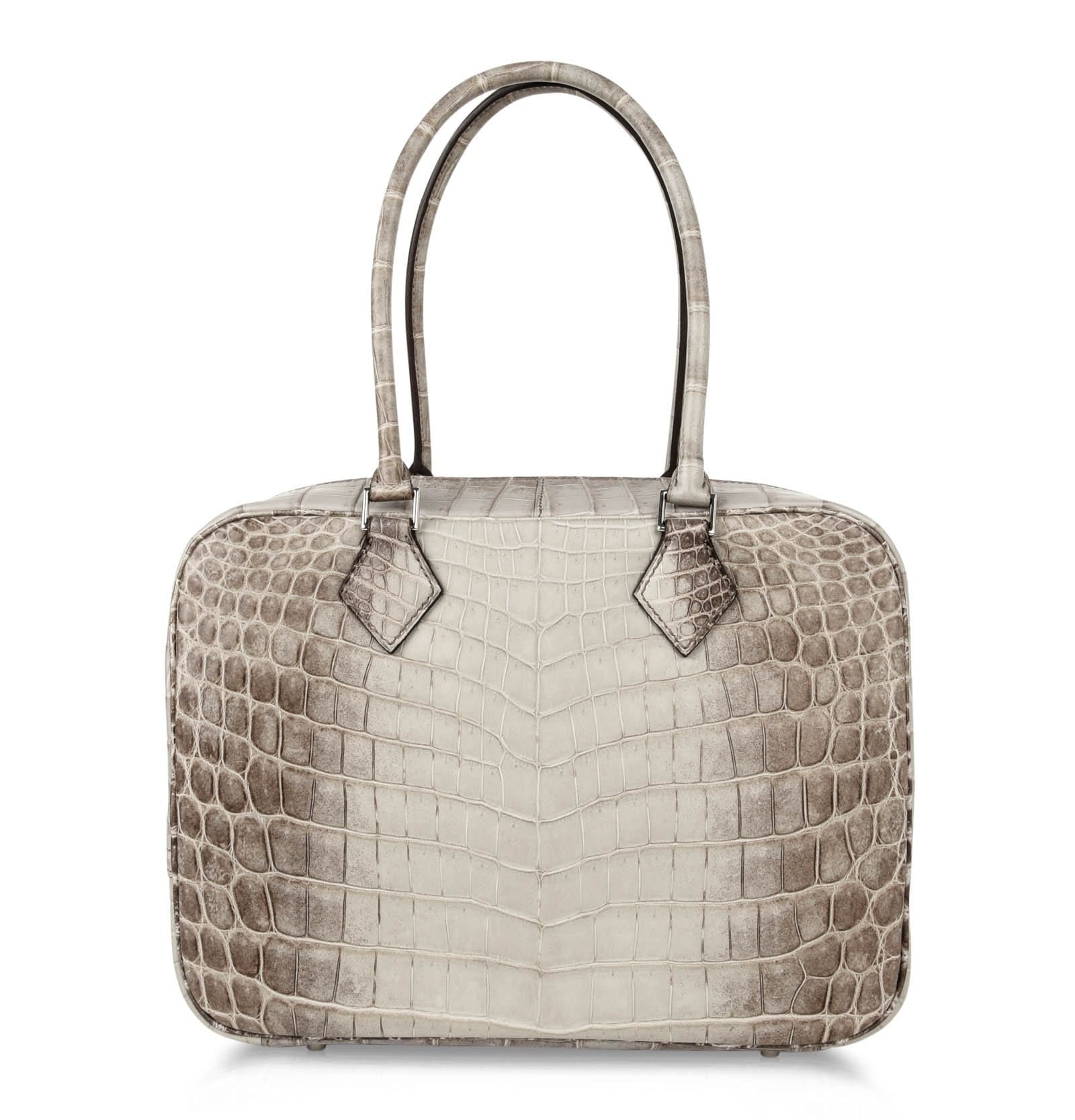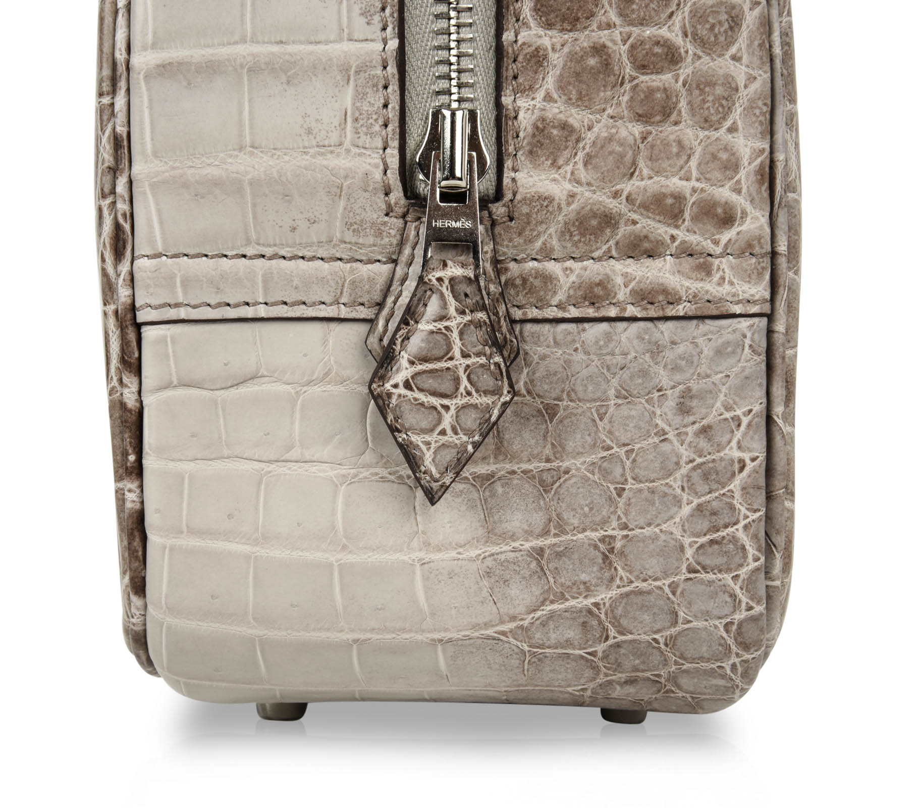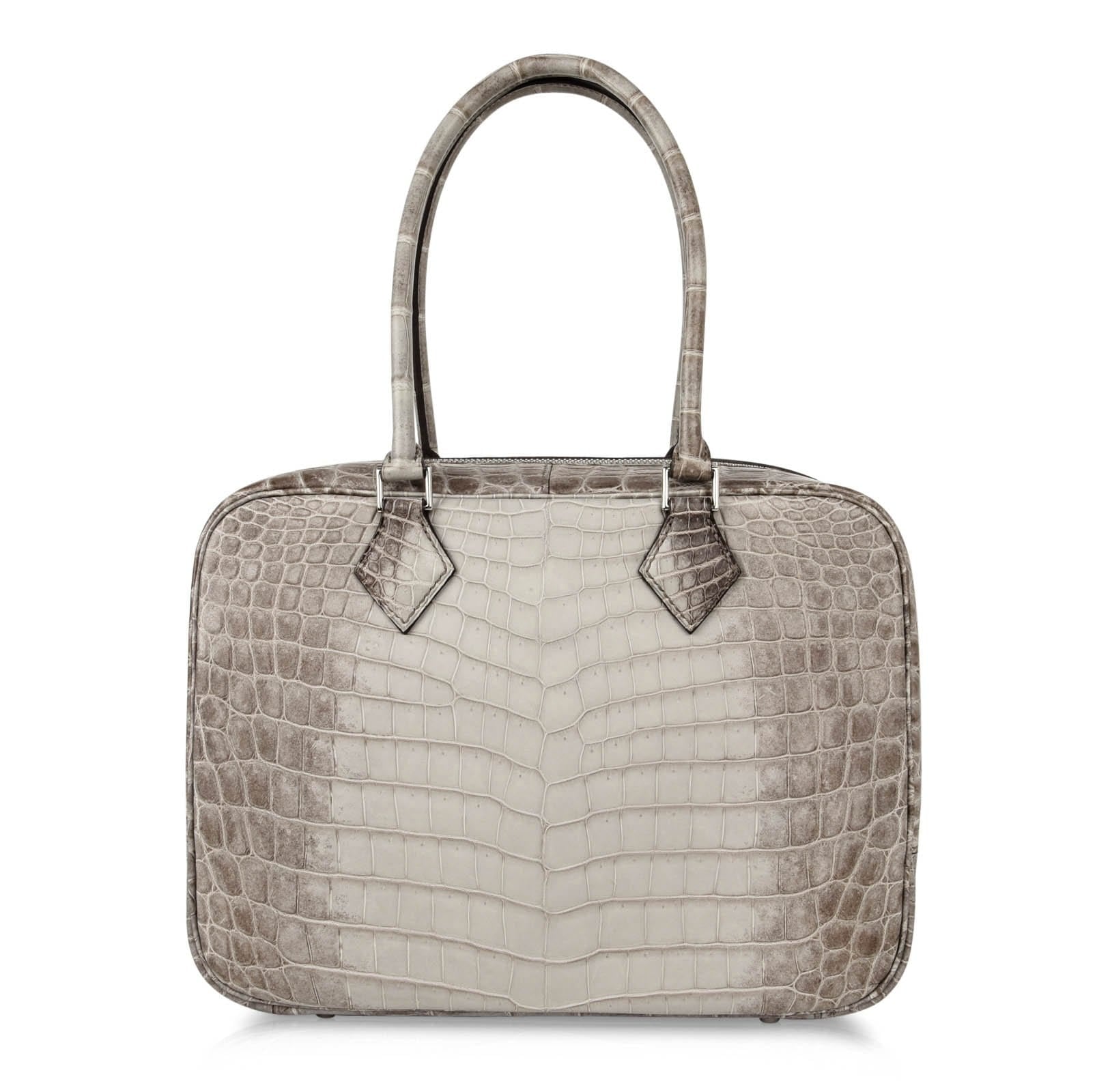 Guaranteed authentic Hermes Plume 28 bag features Niloticus Crocodile Gris Cendre Himalaya.