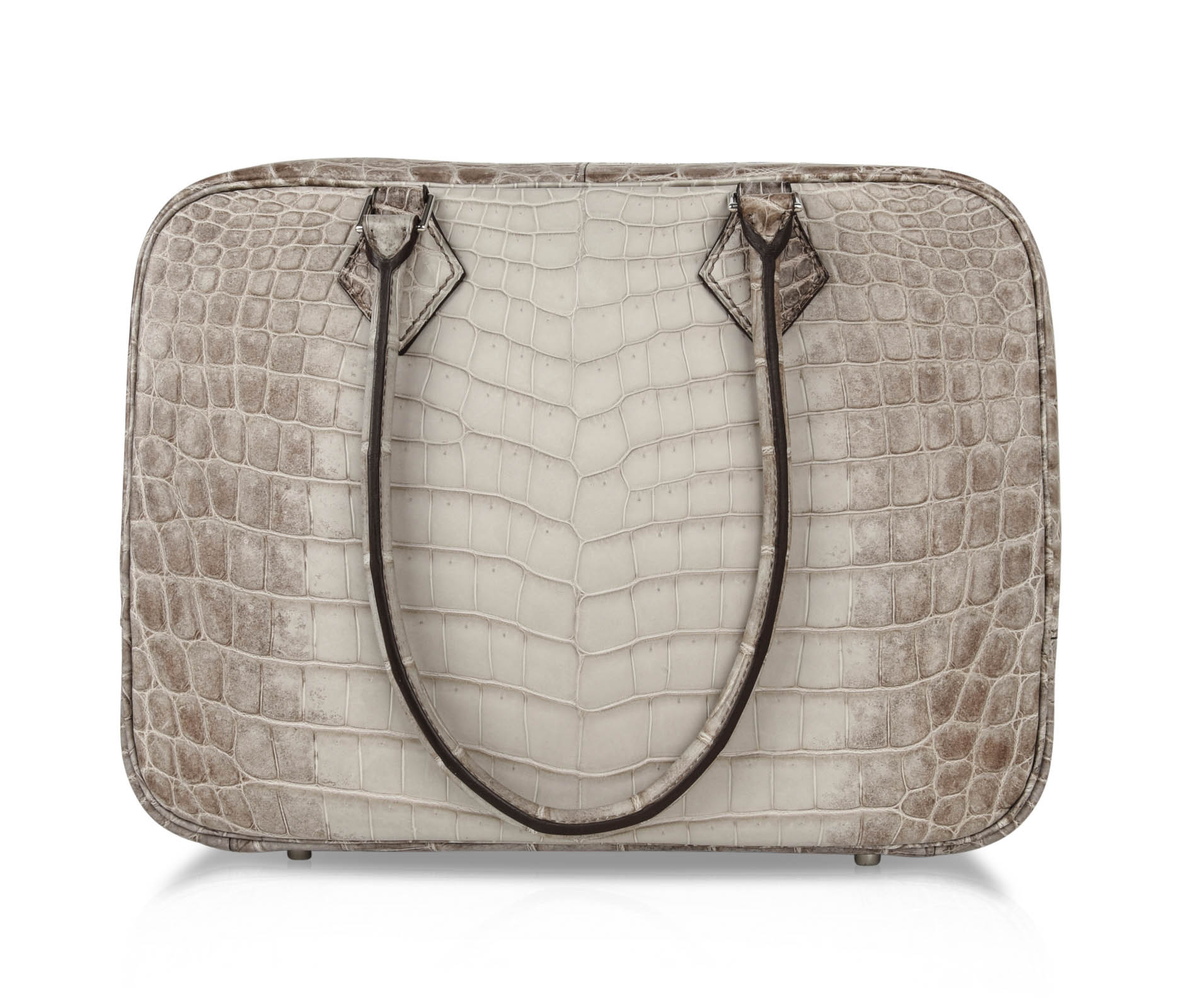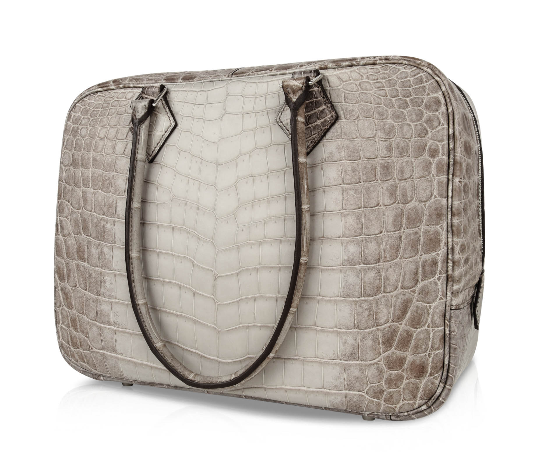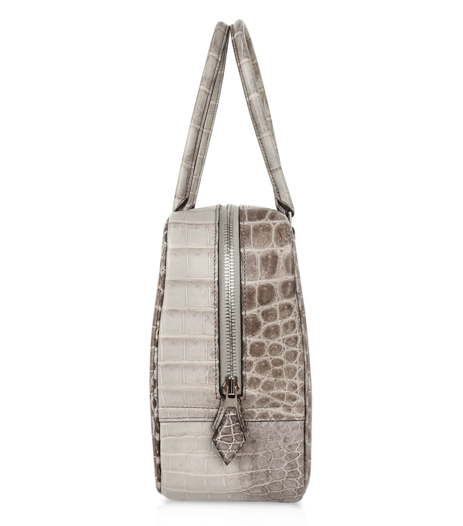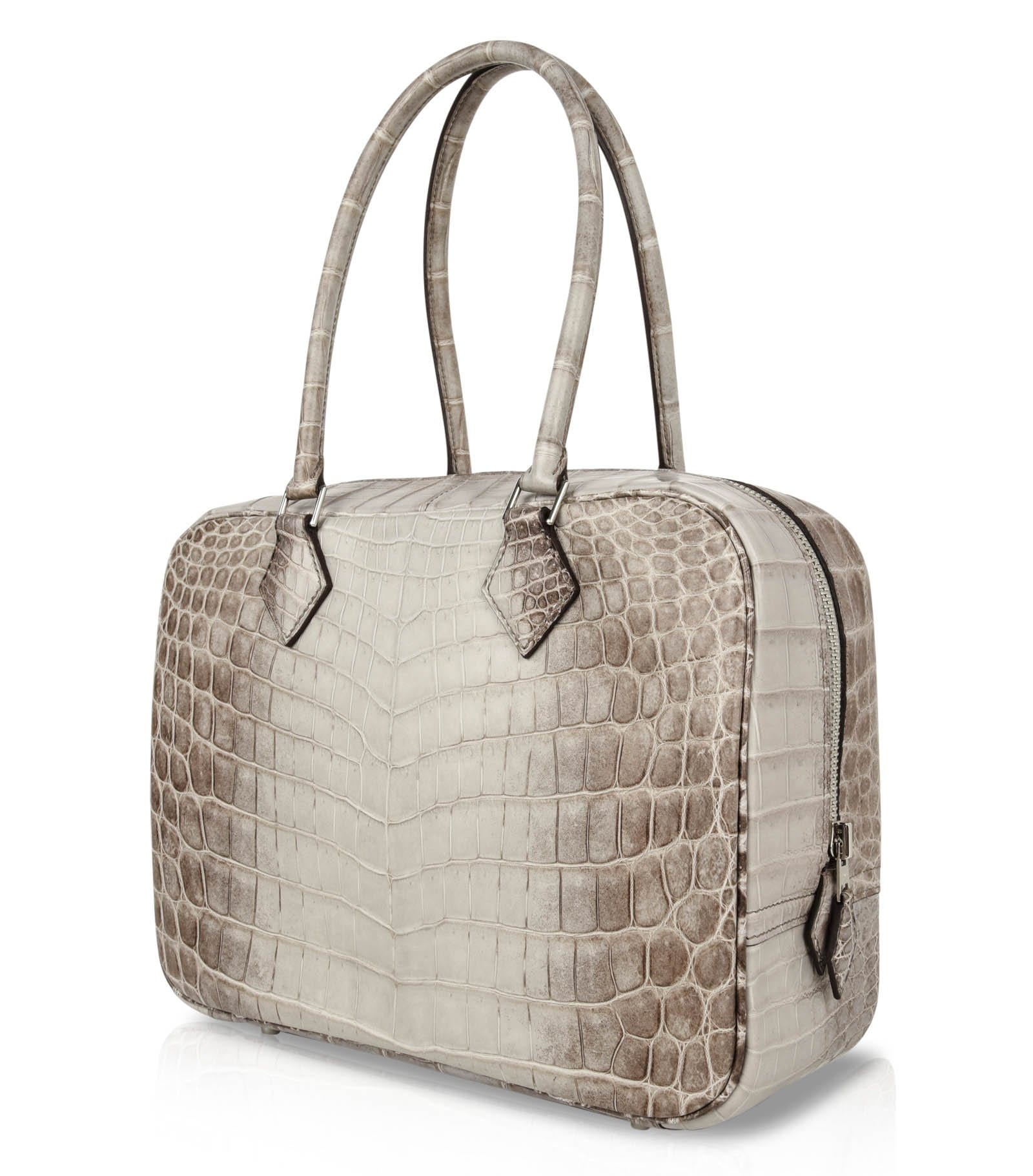 Guaranteed authentic Hermes Plume 28 bag features Niloticus Crocodile Gris Cendre Himalaya.
